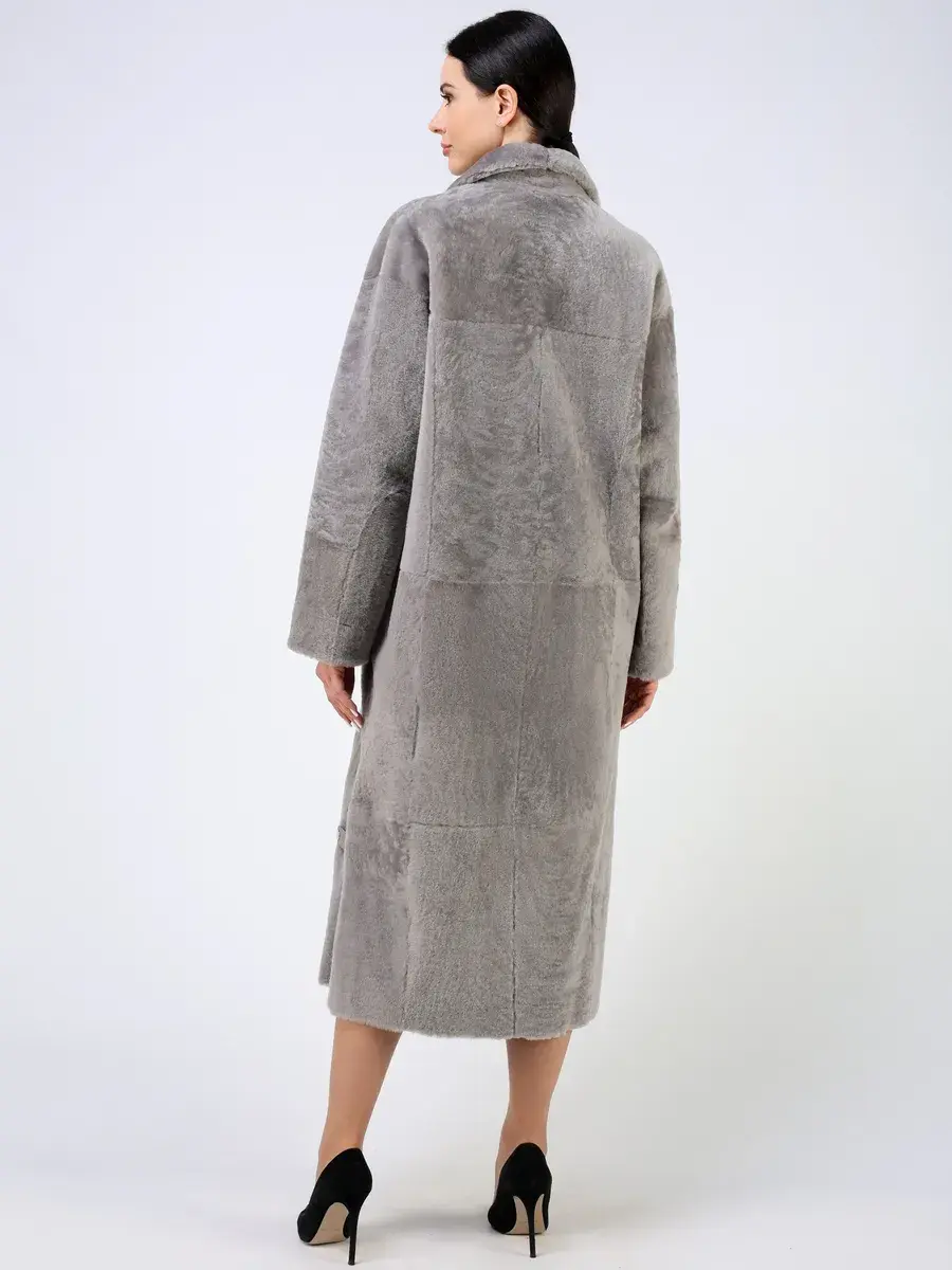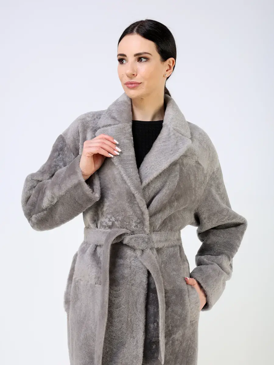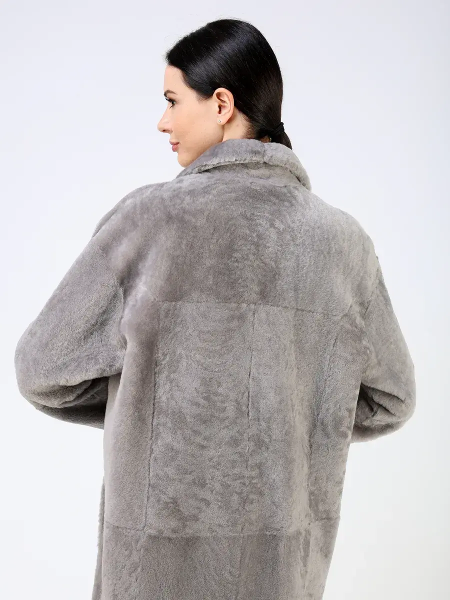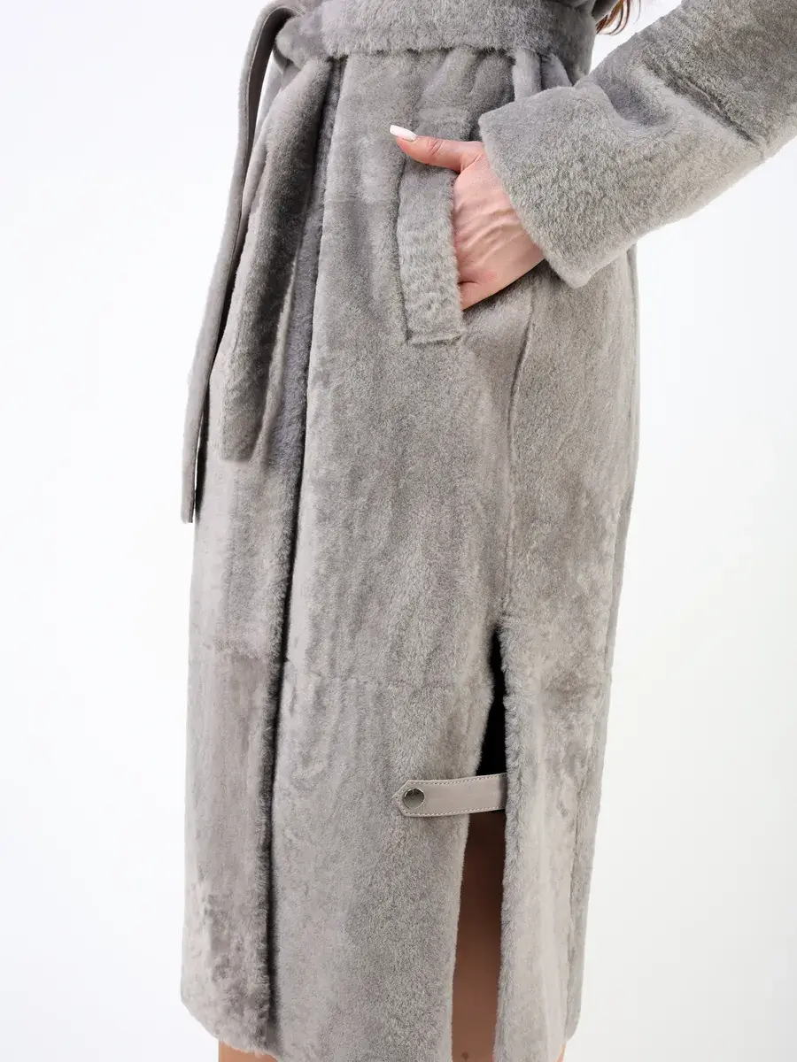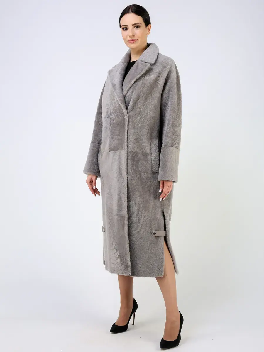 Дубленка женская натуральная имеет длину по спинке 125см., прямой оверсайз крой и спущенную линию плеча, что делает ее очень удобной и комфортной в носке. В комплекте предусмотрен кожаный пояс, позволяющий регулировать силуэт. Боковые шлицы на кнопках позволяют свободно двигаться и придают дополнительную изюминку. Застежка на кнопках обеспечивает легкость в использовании, а прорезные карманы по бокам дополнительно увеличивают функциональность и практичность удлиненной и легкой женской шубы.