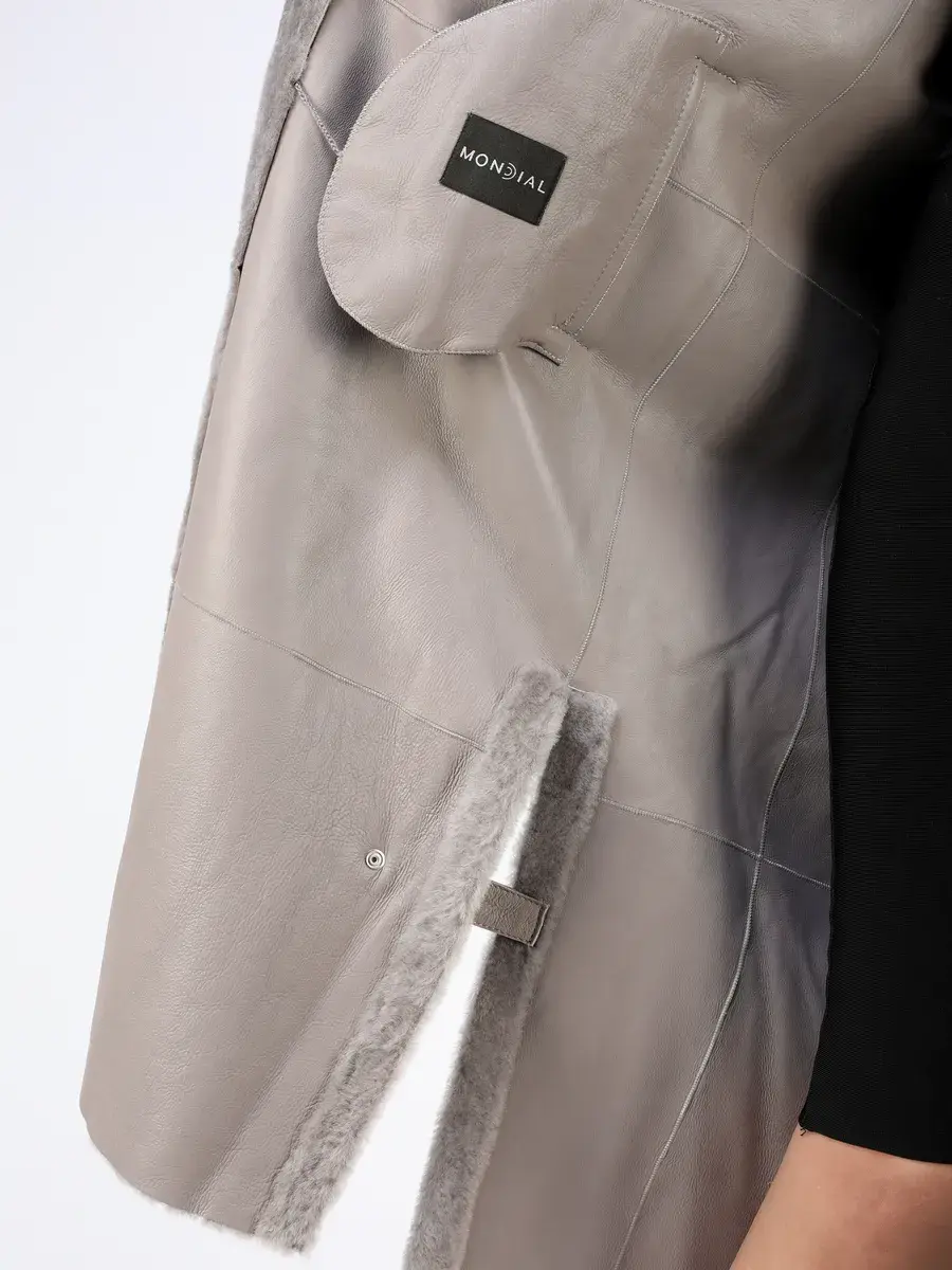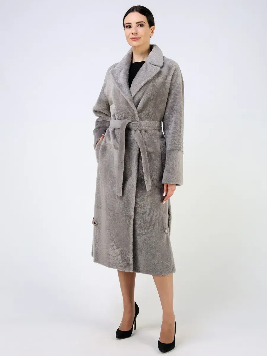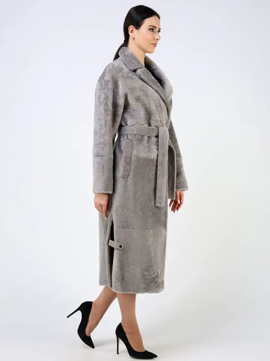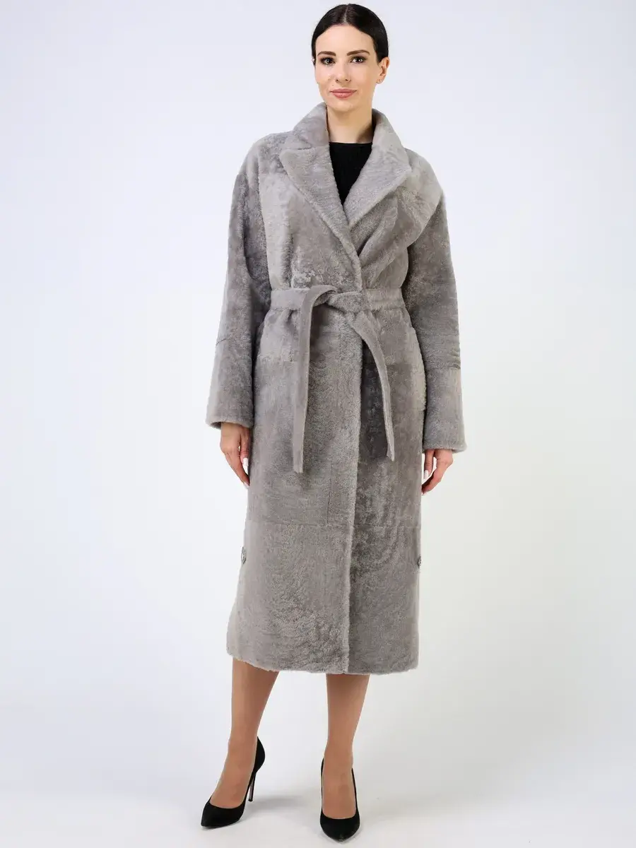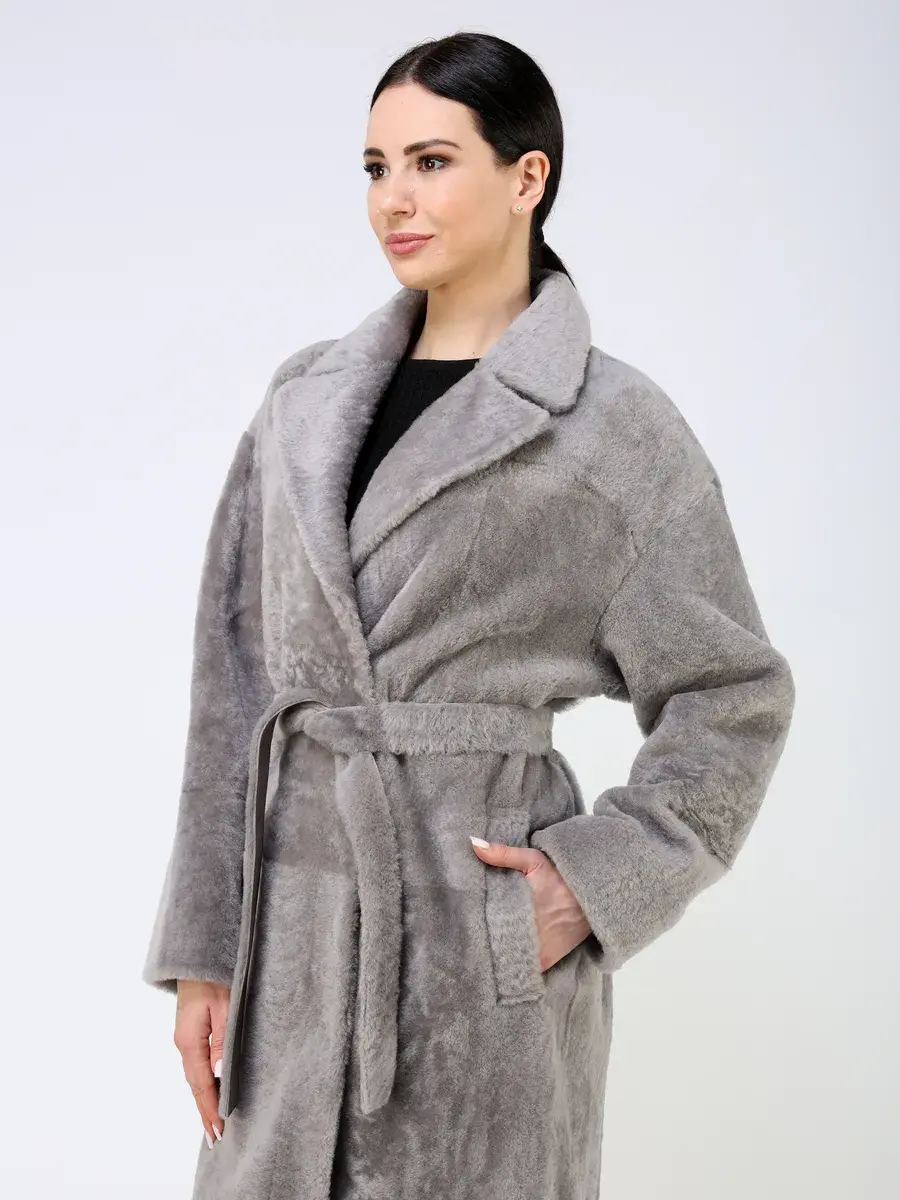 Дубленка женская натуральная имеет длину по спинке 125см., прямой оверсайз крой и спущенную линию плеча, что делает ее очень удобной и комфортной в носке. В комплекте предусмотрен кожаный пояс, позволяющий регулировать силуэт. Боковые шлицы на кнопках позволяют свободно двигаться и придают дополнительную изюминку. Застежка на кнопках обеспечивает легкость в использовании, а прорезные карманы по бокам дополнительно увеличивают функциональность и практичность удлиненной и легкой женской шубы.