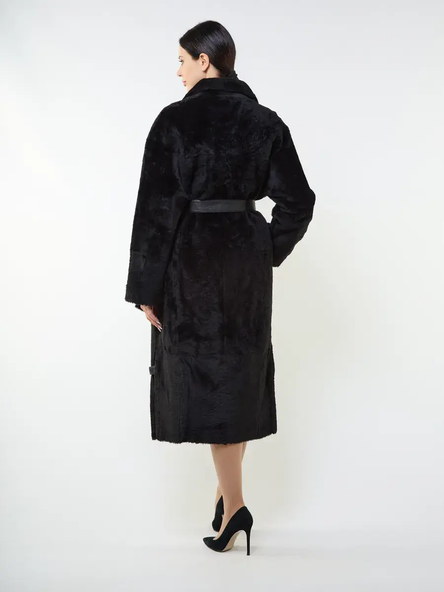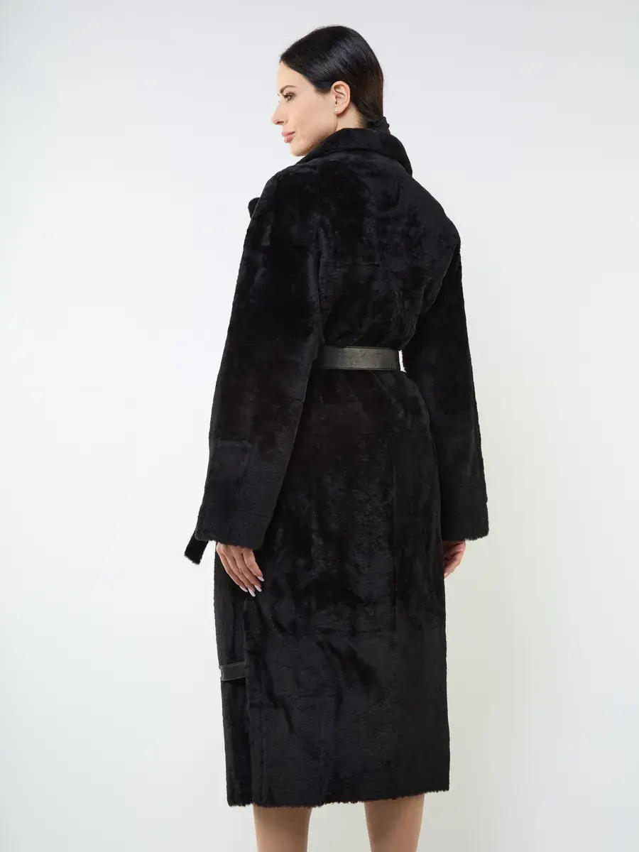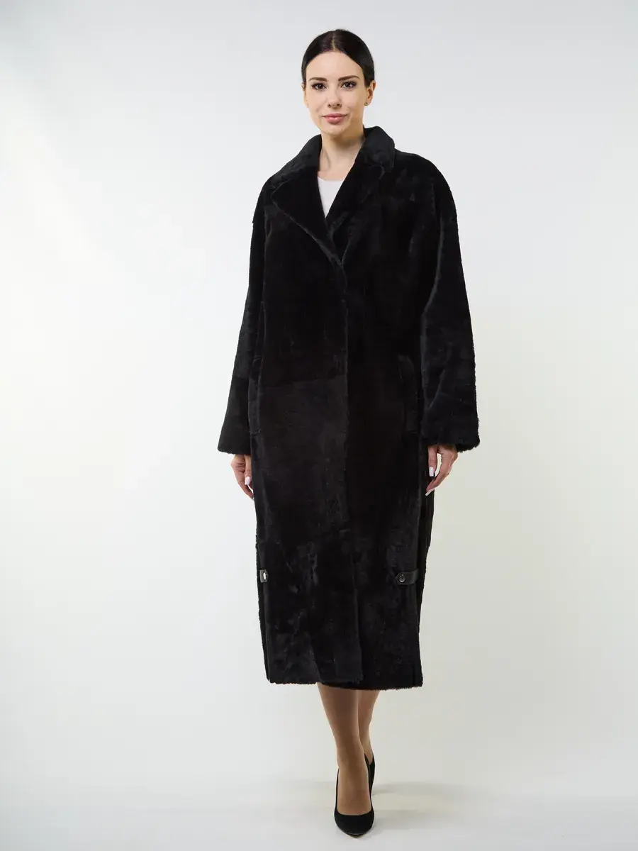 Дубленка женская натуральная имеет длину по спинке 125см., прямой оверсайз крой и спущенную линию плеча, что делает ее очень удобной и комфортной в носке. В комплекте предусмотрен кожаный пояс, позволяющий регулировать силуэт. Боковые шлицы на кнопках позволяют свободно двигаться и придают дополнительную изюминку. Застежка на кнопках обеспечивает легкость в использовании, а прорезные карманы по бокам дополнительно увеличивают функциональность и практичность удлиненной и легкой женской шубы.
