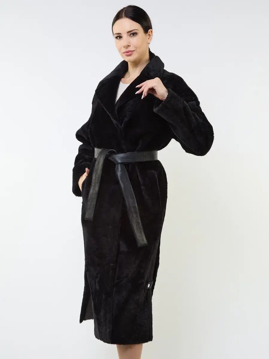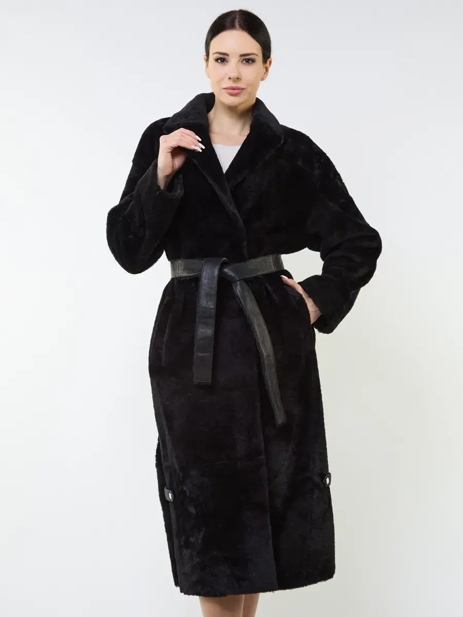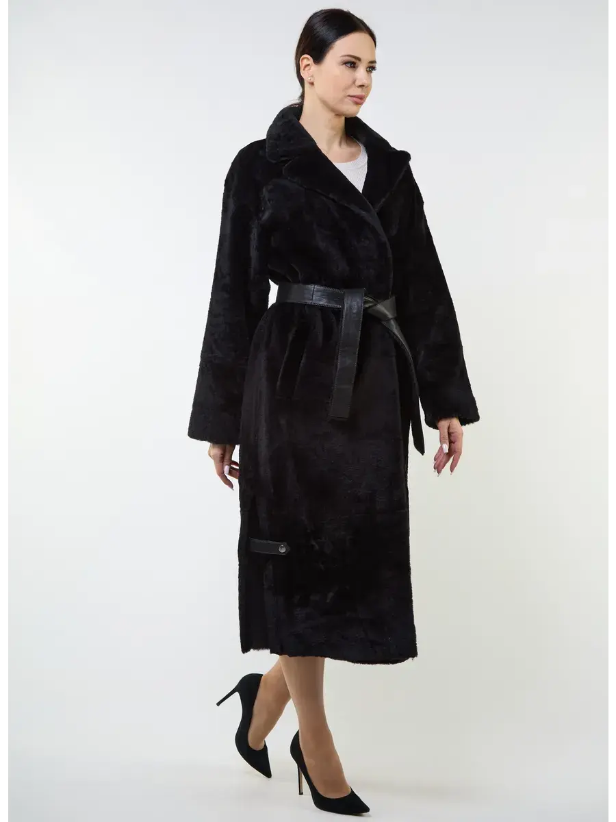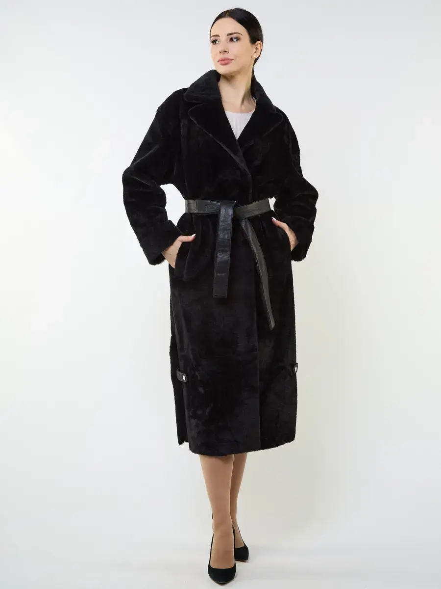 Дубленка женская натуральная имеет длину по спинке 125см., прямой оверсайз крой и спущенную линию плеча, что делает ее очень удобной и комфортной в носке. В комплекте предусмотрен кожаный пояс, позволяющий регулировать силуэт. Боковые шлицы на кнопках позволяют свободно двигаться и придают дополнительную изюминку. Застежка на кнопках обеспечивает легкость в использовании, а прорезные карманы по бокам дополнительно увеличивают функциональность и практичность удлиненной и легкой женской шубы.