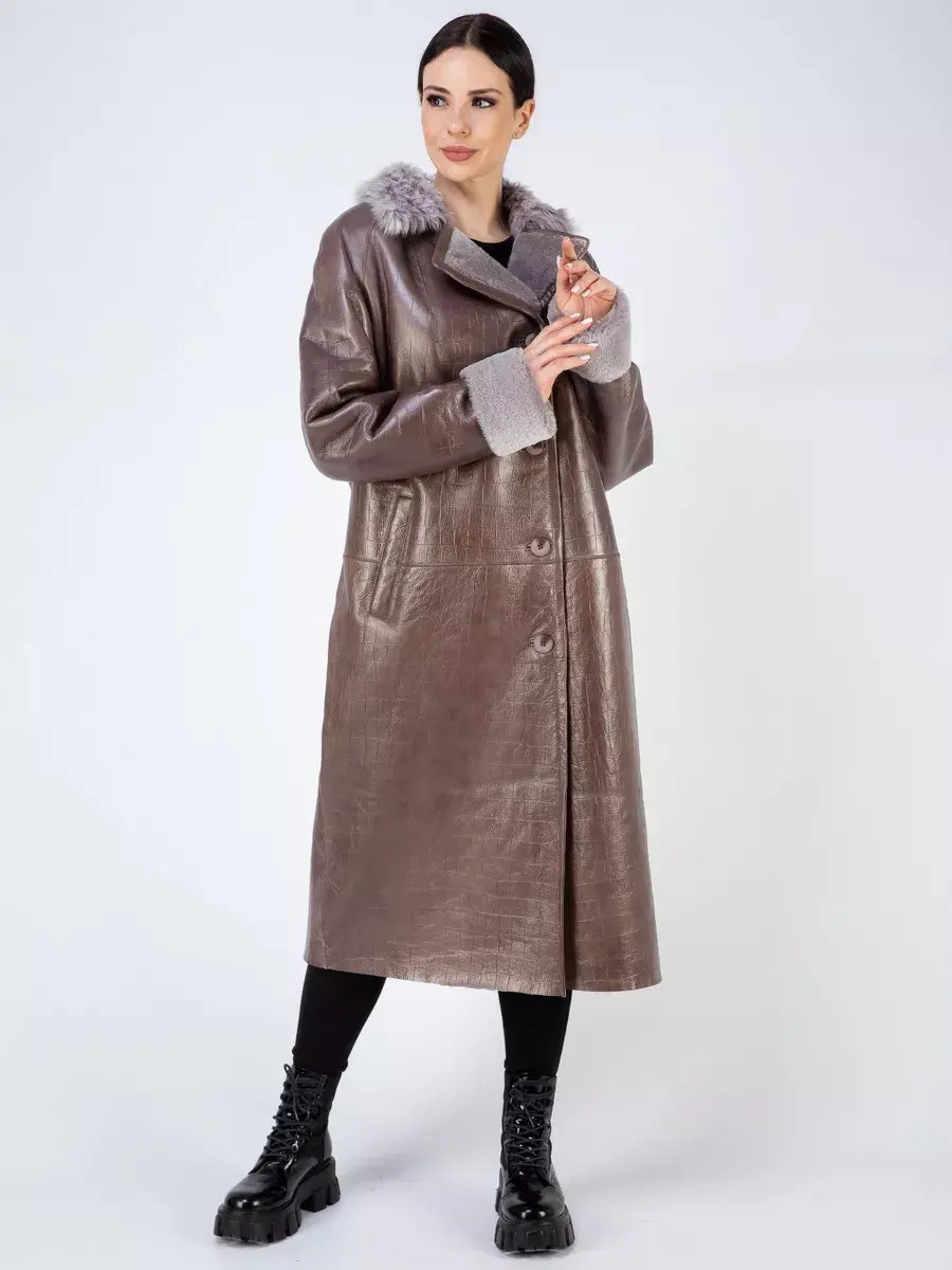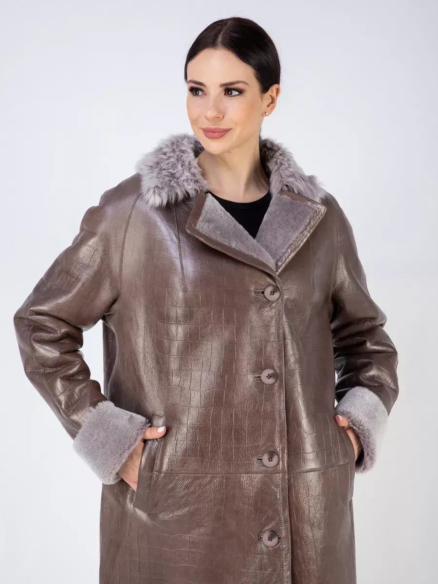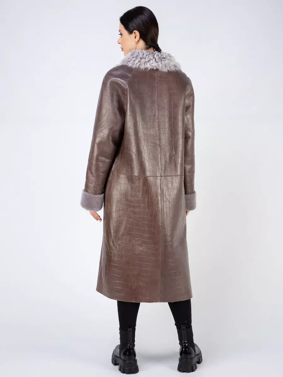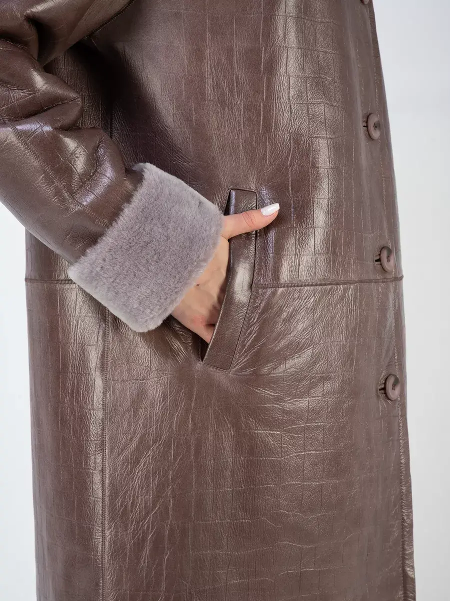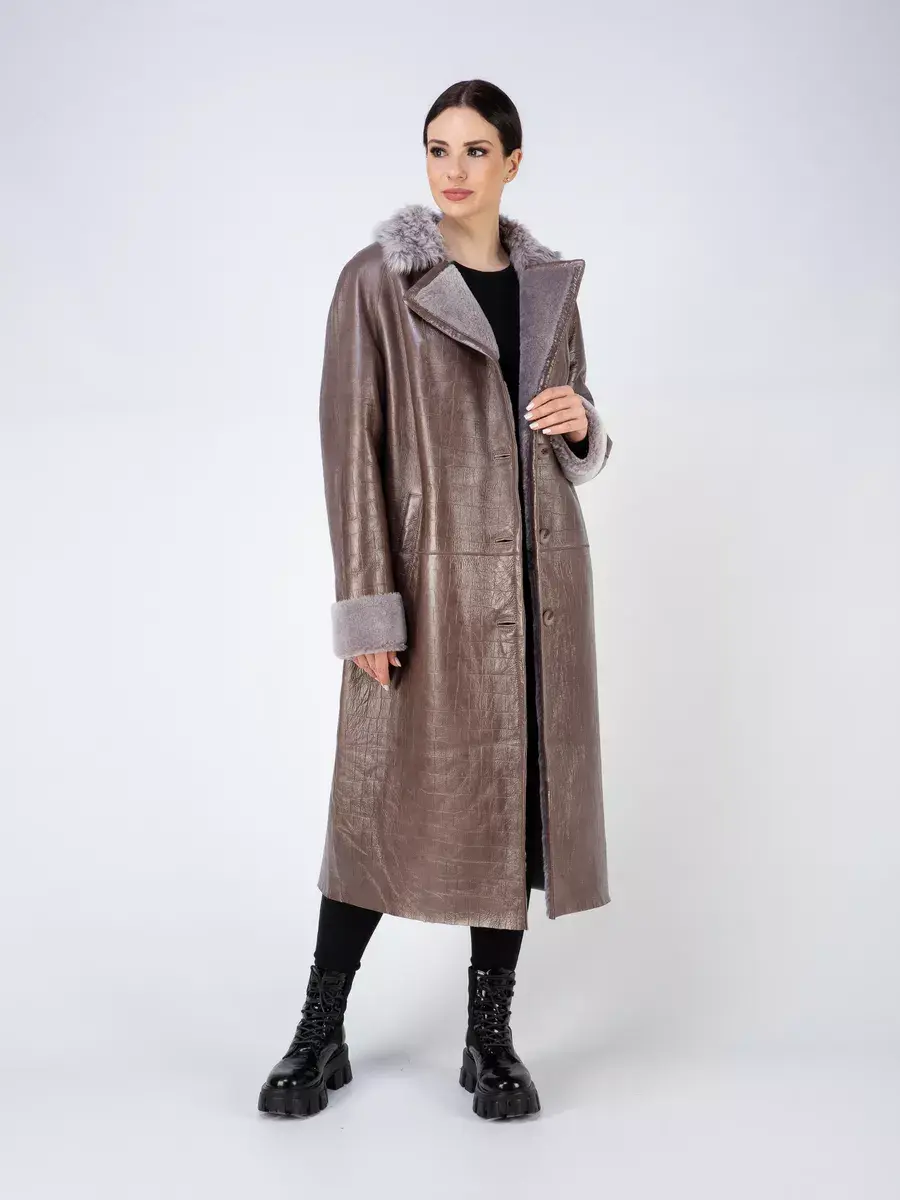 Дубленка женская натуральная зимняя из натурального меха овчина. Женская дубленка длинная с тиснением под кожу крокодила. Удлиненная дубленка натуральная в качестве застежки пуговицы, прорезные карманы, на воротнике мех не стриженный, прямого кроя, рукава реглан. Длина по спинке 100см. Производство Турция