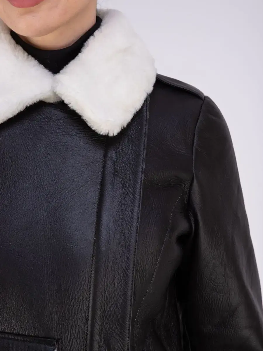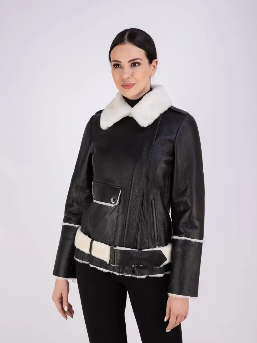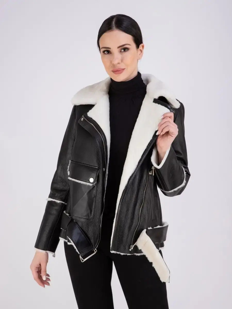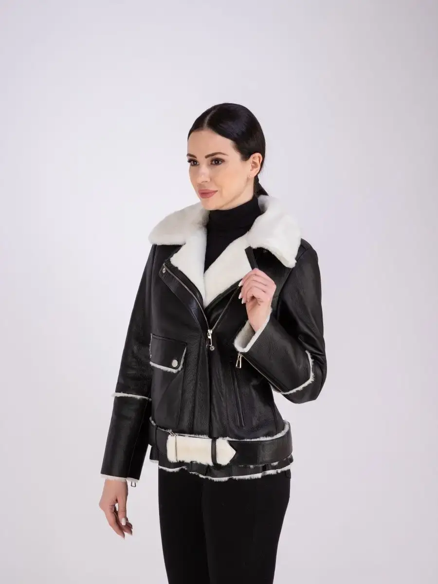 Стильная женская дубленка авиатор из натуральной овчины. Длина по спинке 60см. Дубленка женская натуральная авиатор или пилот с покрытием силки очень эффектная, с одной стороны придает образу грубость и брутальность, а с другой подчёркивает женственный стиль. Качественная дубленка женская зимняя с белым мехом легко сочетается как с джинсами, так и с классическими брюками. Асимметричная молния, декоративная строчка, прорезные карманы, накладной карман. Подойдет женщинам любого возраста. В зависимости от выбора вашей обуви look может получиться одновременно и женственным, и стильным, и повседневным, или даже спортивным. Дубленка зимняя натуральная женская - вещица универсальная - под нее с легкостью можно подобрать практически любую обувь. MONDIAL Производство Турция!