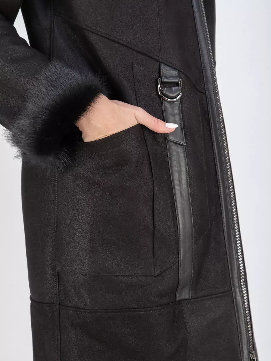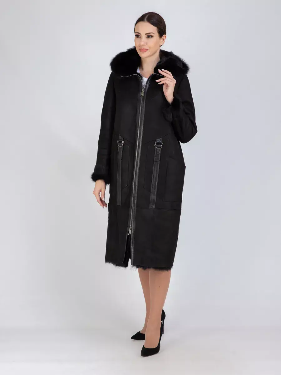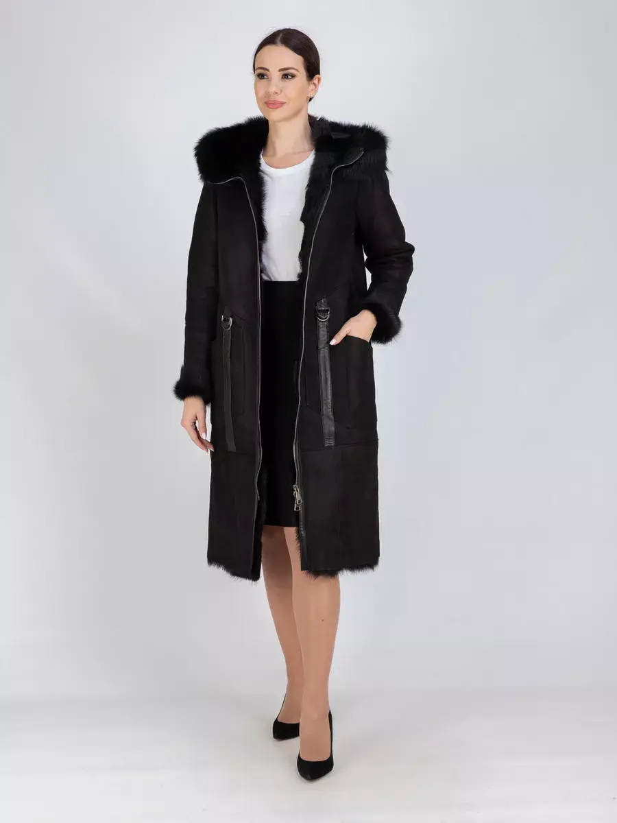 Длина дубленки составляет 110см по спинке, прямой крой и вставки из натуральной кожи создают элегантный и изящный силуэт, который подчеркнет вашу женственность. Большой объемный капюшон не отстегивается, обеспечить надежную защиту от снега и ветра даже в самую суровую погоду. В качестве застежки предусмотрена молния для удобства в повседневном использовании. Богатый цвет придает ей элегантность и универсальность, позволяя легко комбинировать с любой одеждой.