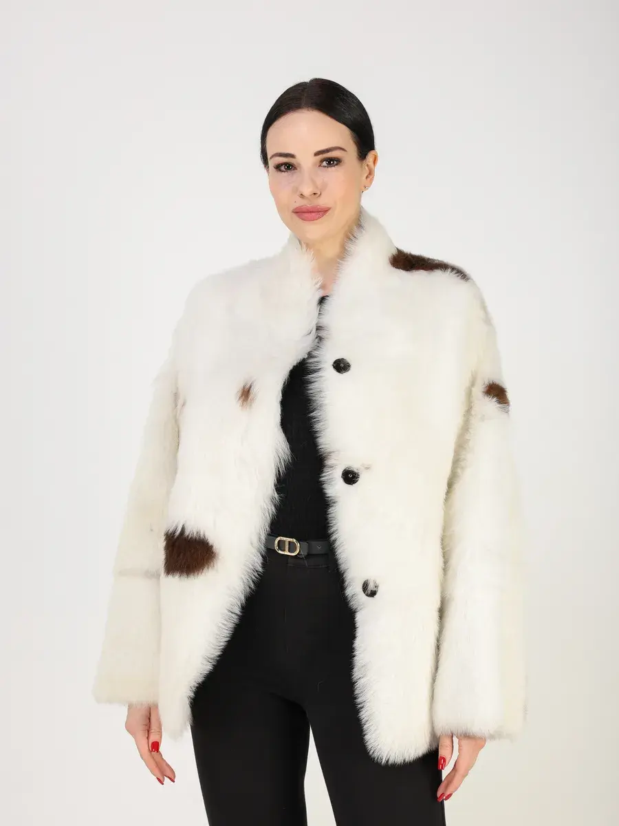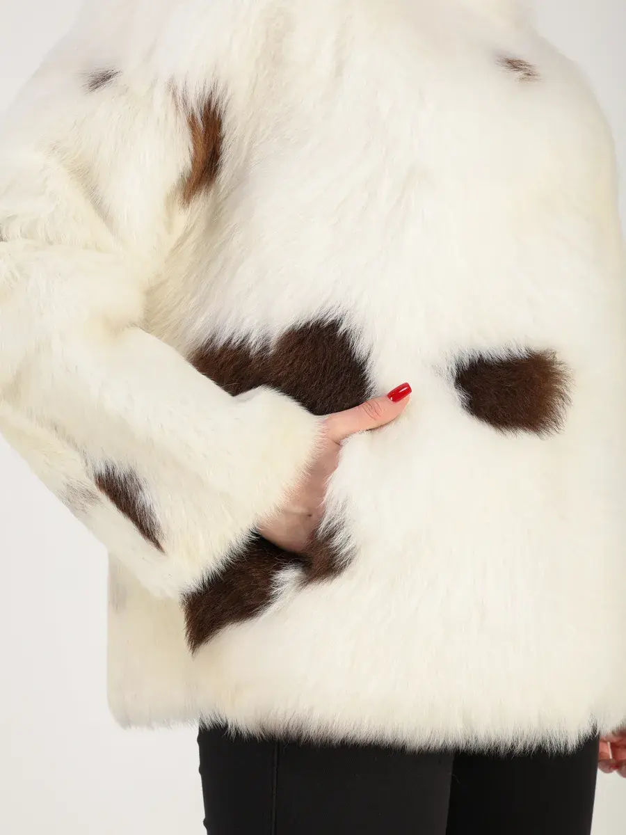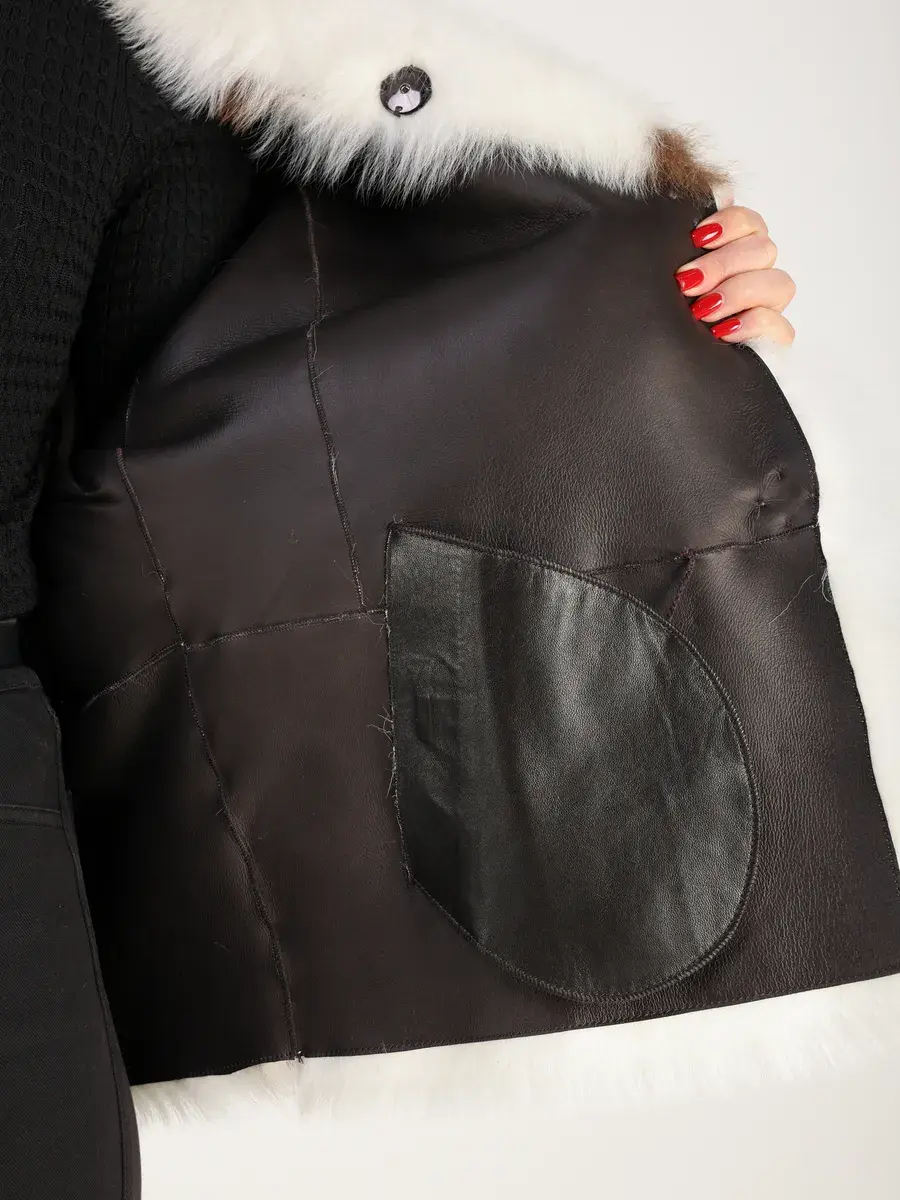 Особое внимание привлекает комбинированный цвет, который не повторяется на других размерах и делает шубку модной и эксклюзивной. По соотношению белого с другим цветом дубленка может отличатся от изделия на фото.