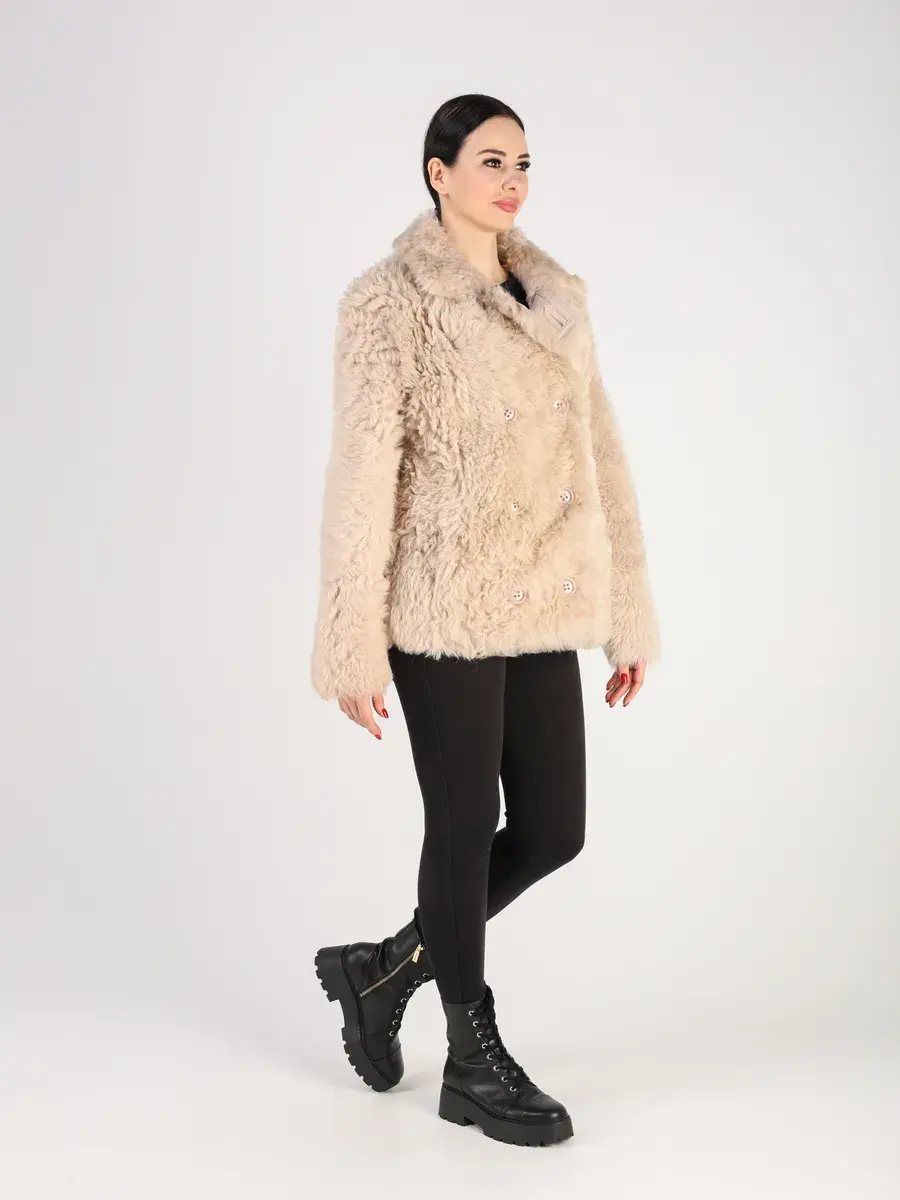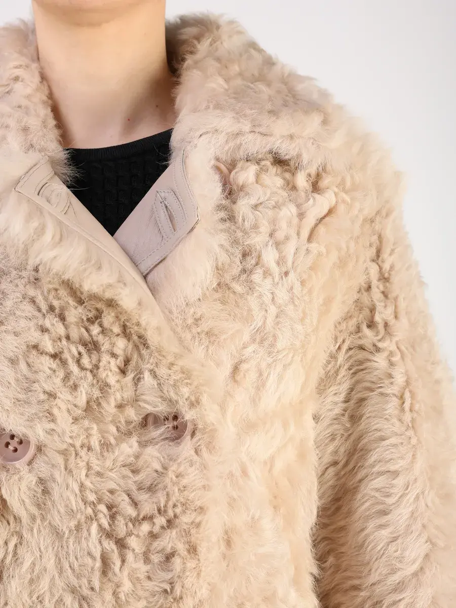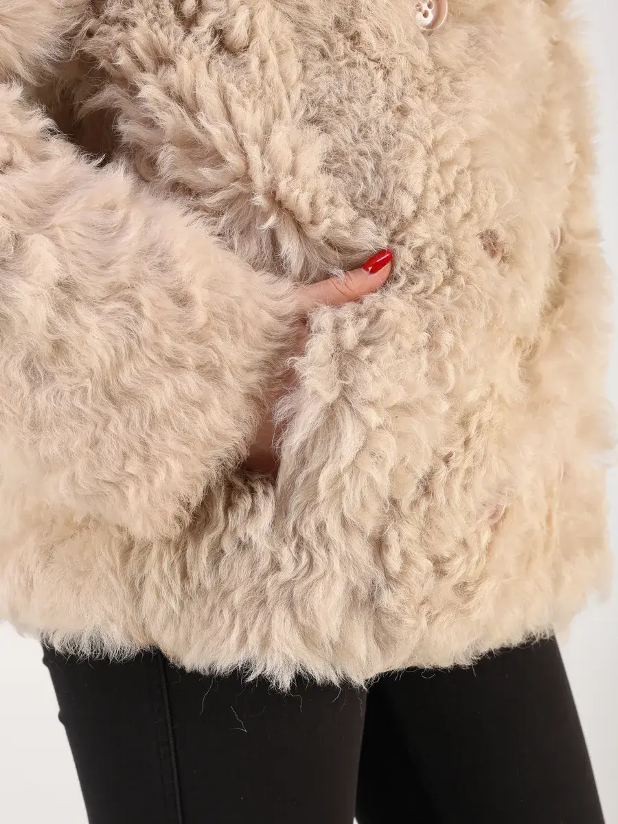 мех овчина - тиградо, двубортная, кулиска подол, воротник стойка,