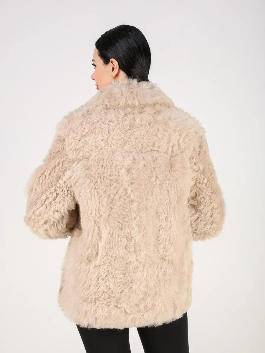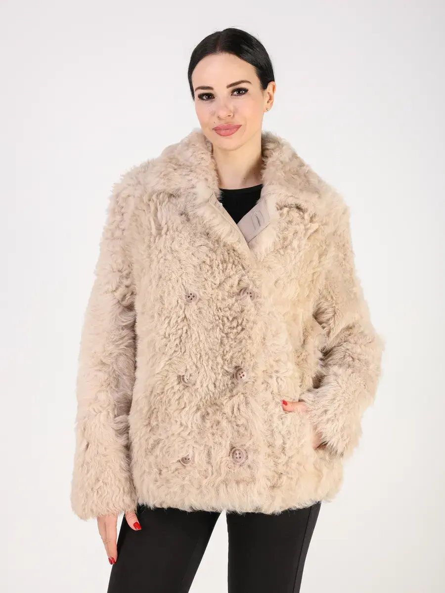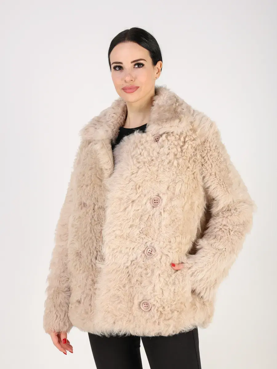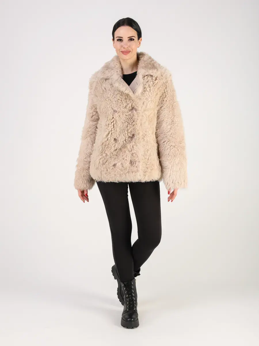 мех овчина - тиградо, двубортная, кулиска подол, воротник стойка,