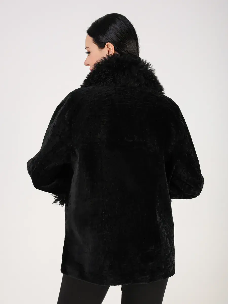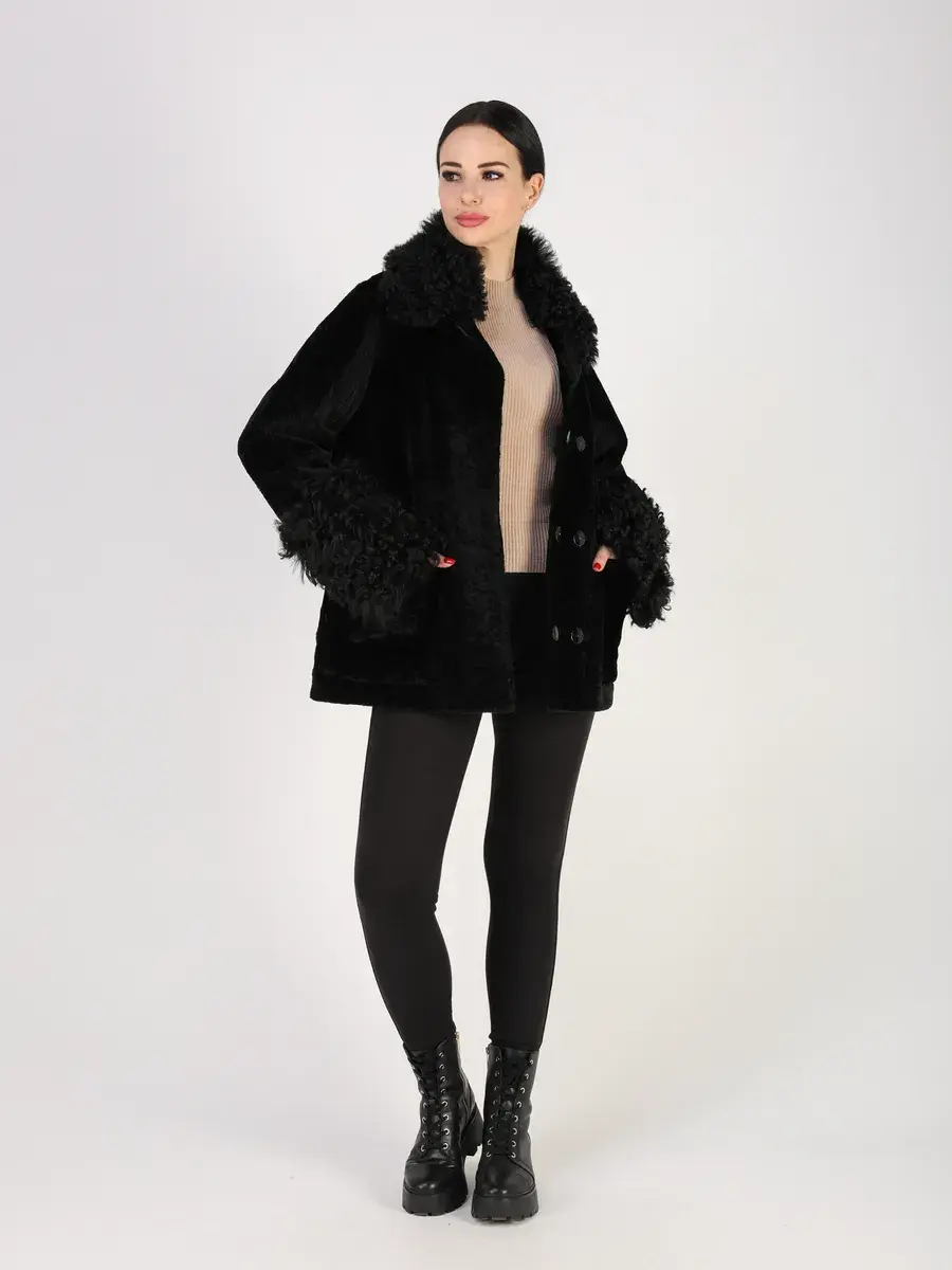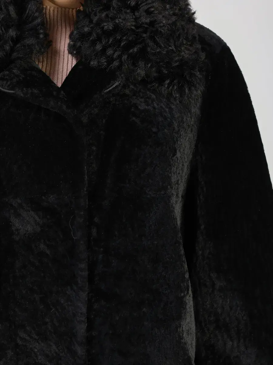 отделка - мех тиградо, мех астраган, воротник застегивается на пуговицу.