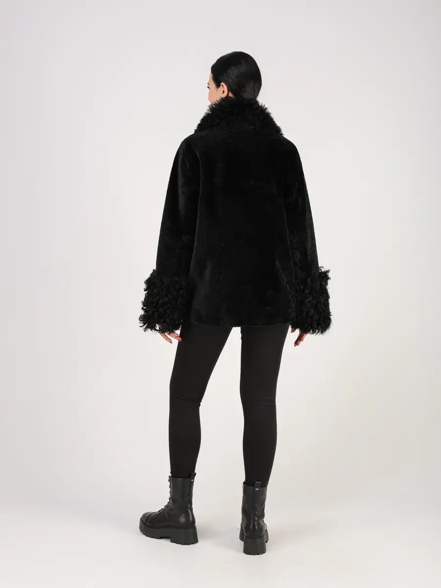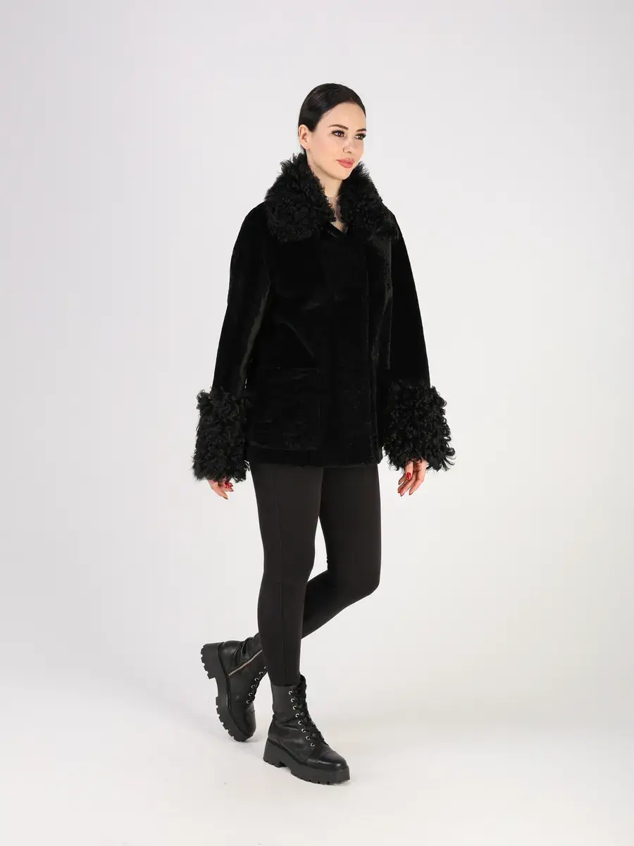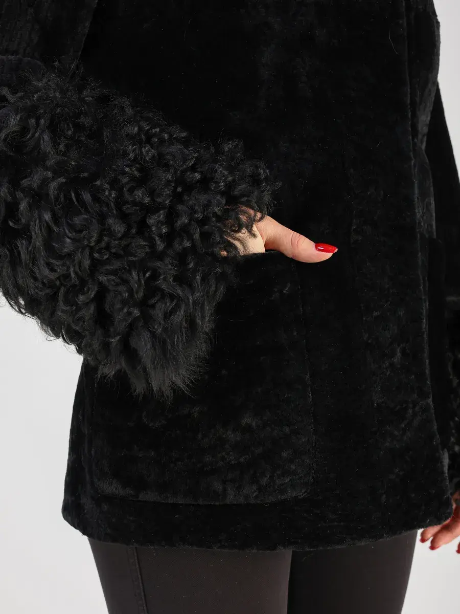 отделка - мех тиградо, мех астраган, воротник застегивается на пуговицу.