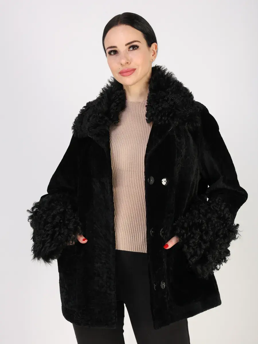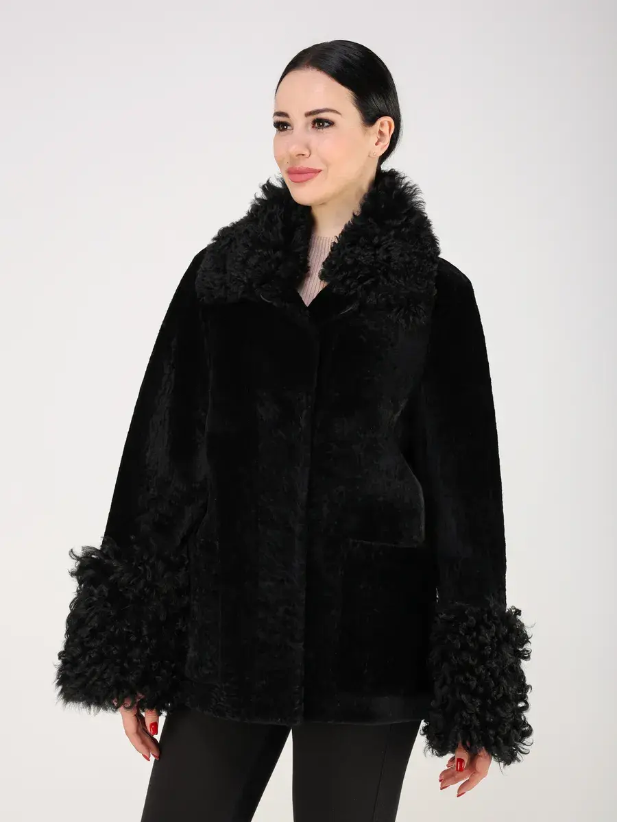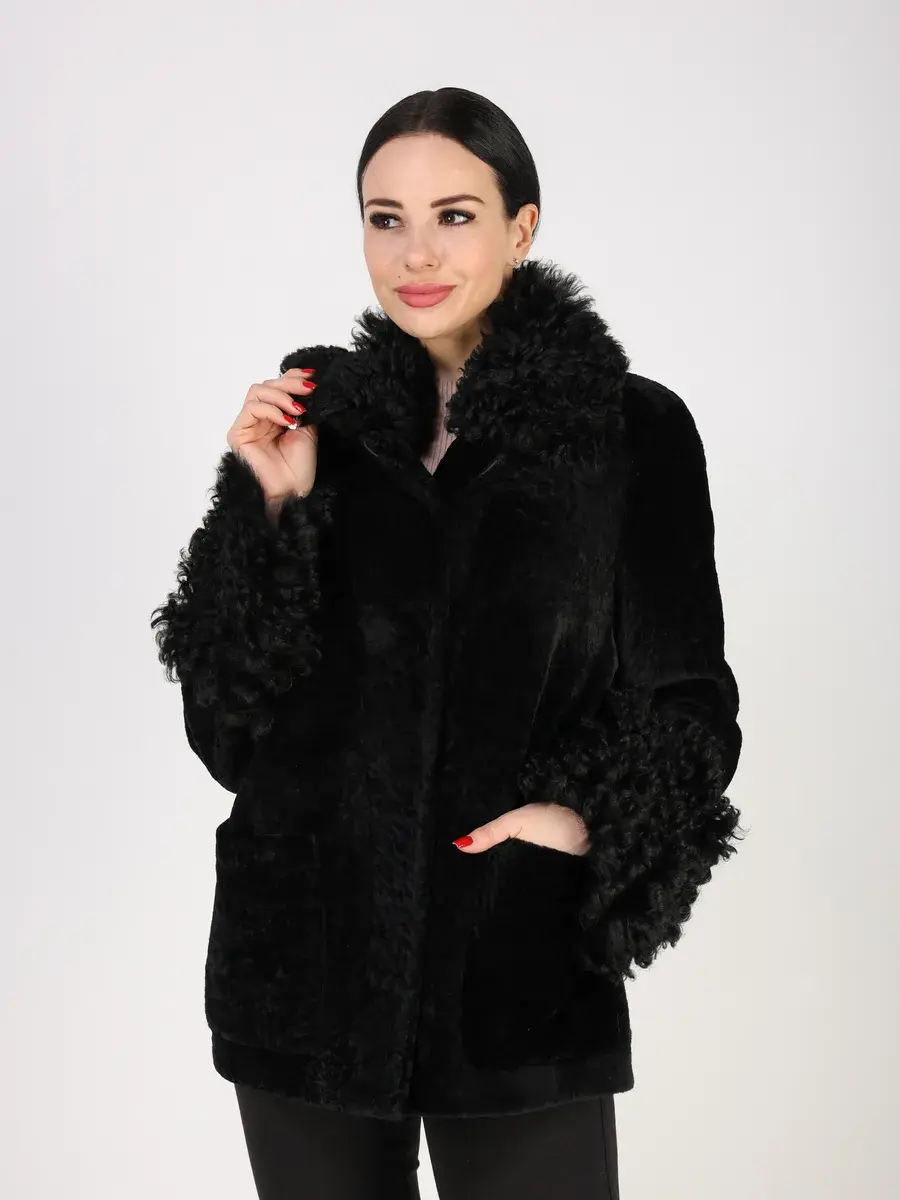 Дубленка женская зимняя короткая выполнено из натурального меха овчины - астраган с отделкой на воротнике и на рукавах из меха овчины - тиградо. Покрытие "силки" делает изделие более долговечным!
