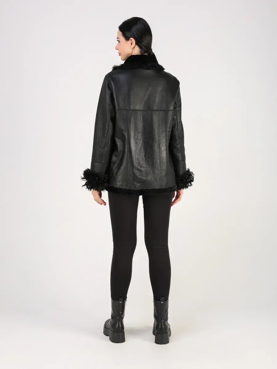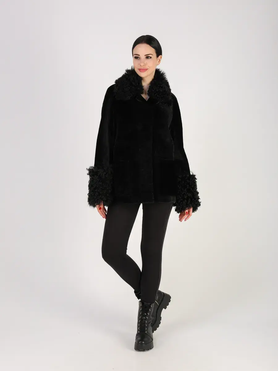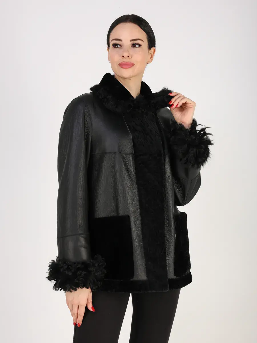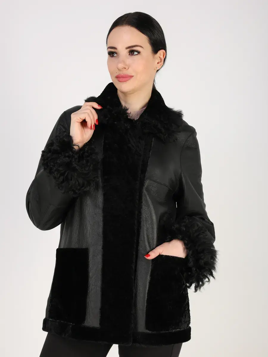 Дубленка женская зимняя короткая выполнено из натурального меха овчины - астраган с отделкой на воротнике и на рукавах из меха овчины - тиградо. Покрытие "силки" делает изделие более долговечным!