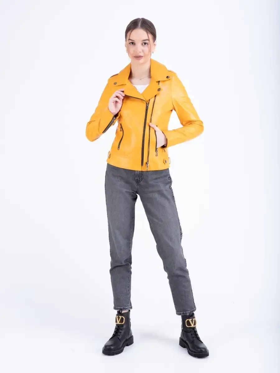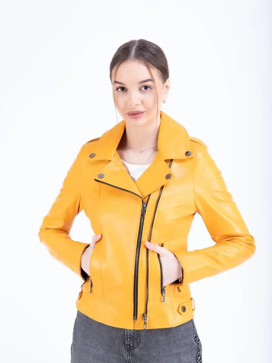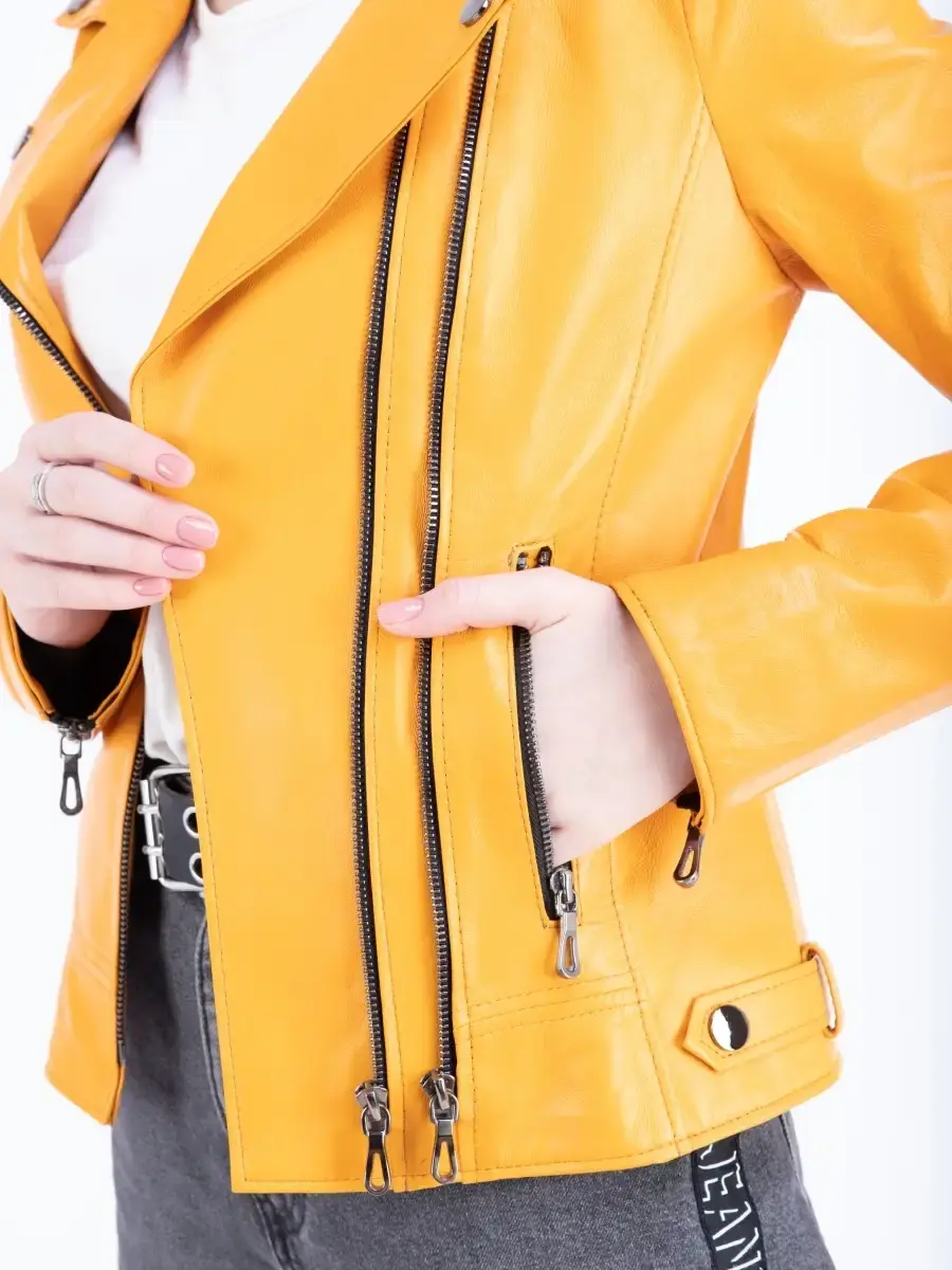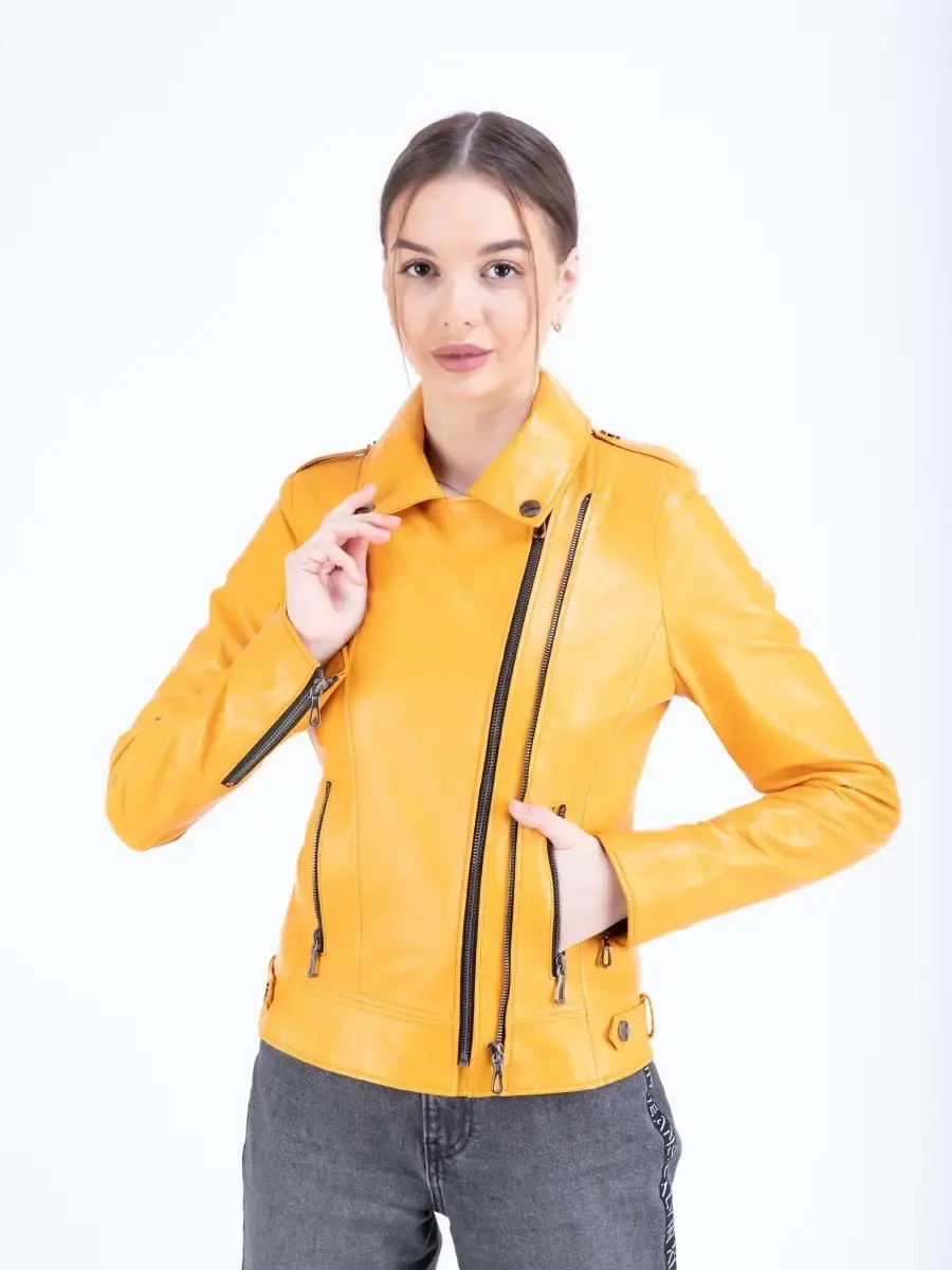 Косуха кожаная куртка женская из натуральной кожи ягненка. Кожаная косуха женская натуральная с прорезными карманами на молнии очень удобная и стильная. Курка женская из натуральной кожи приталенного кроя всегда будет обладать превосходным видом. Двойная функциональная застежка на молнии. MONDIAL Производство Турция