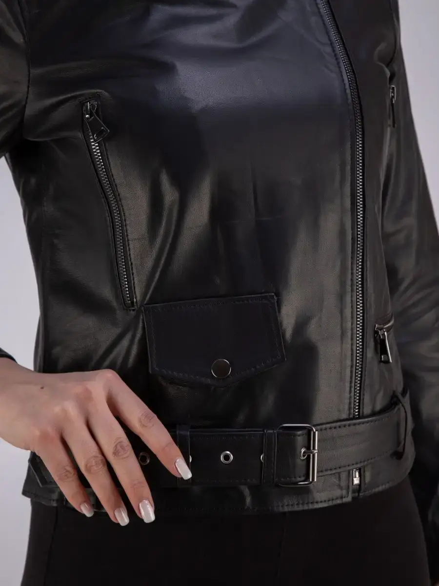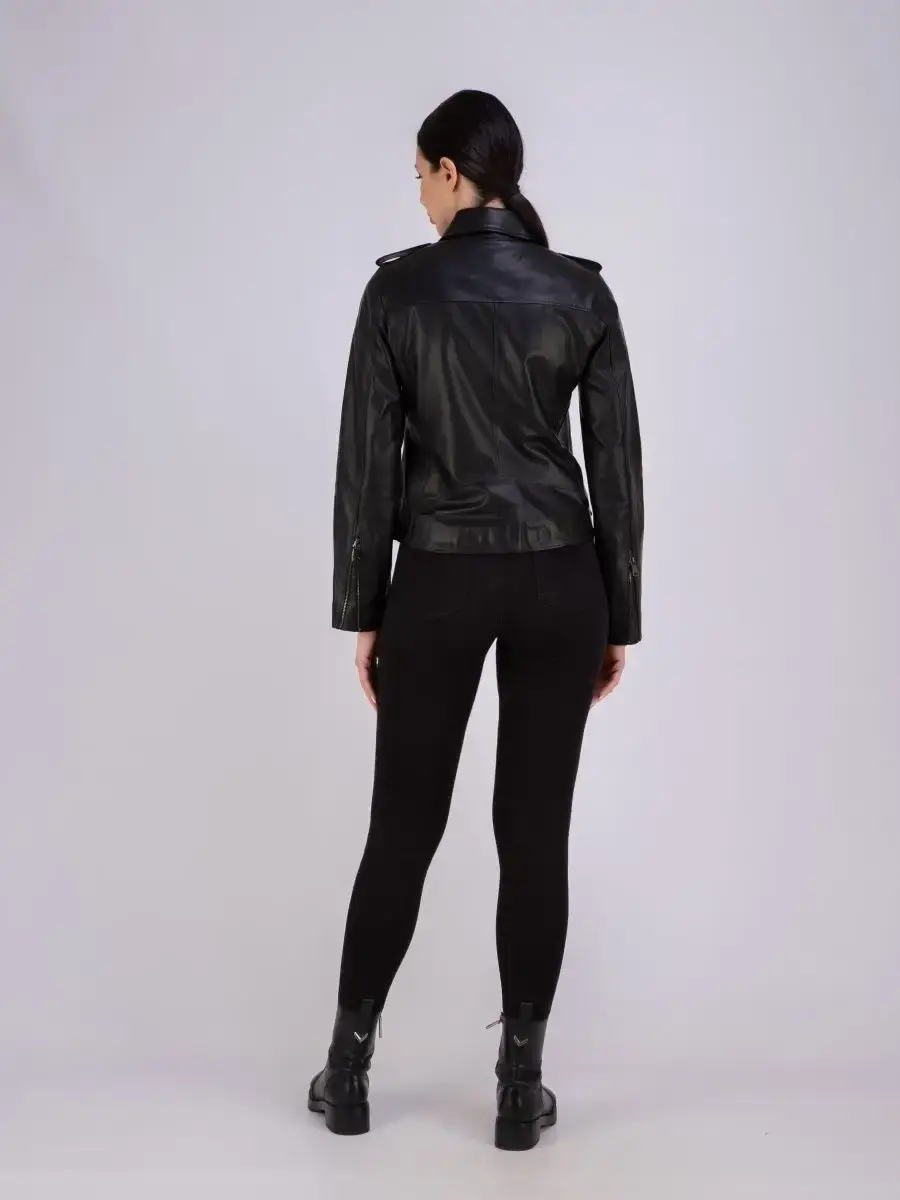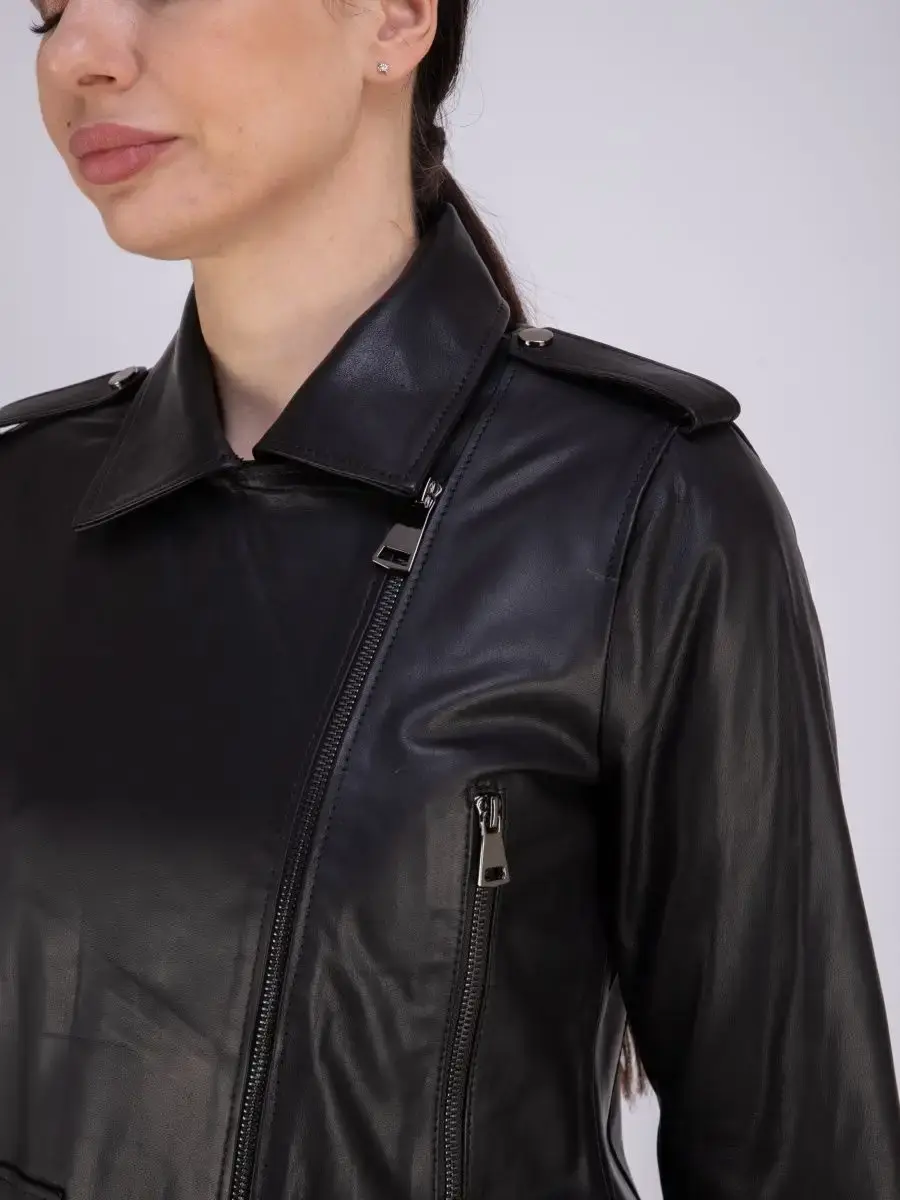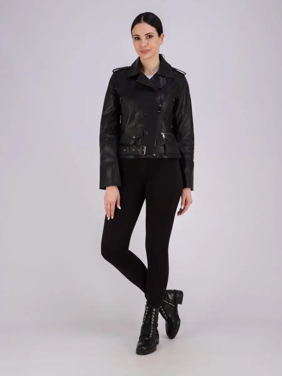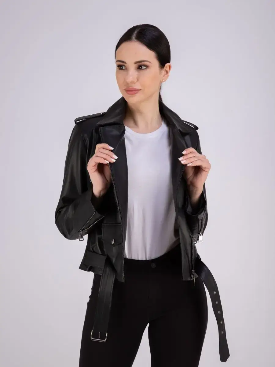Косуха женская кожаная из 100% натуральной кожи. Косуха женская укороченная, куртка косуха женская в классическом стиле из нежной кожи ягненка идеальный выбор, если вы желаете составить эффектный, и в то же время очень стильный и модный look. Универсальная косуха женская натуральная кожа с прорезными карманами на молнии, с ассиметричной застежкой и с молнией на рукавах отличный вариант верхней одежды на постоянную носку в демисезон, весной, осенью и в прохладное лето. Косуха женская короткая, кожаная куртка женская прекрасно впишется практически в любой стиль — повседневный, городской, офисный и вечерний. Вы можете купить косухи женские, куртки женские, плащи кожаные, куртка демисезонная женская, куртка женская весна, куртка кожаная женская в подарок со скидкой на странице бренда MONDIAL! Коллекция обновляется каждый сезон. Длина по спинке 55см. Производство Турция