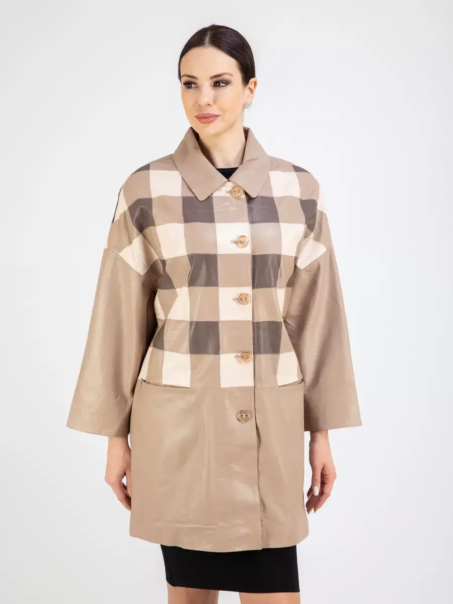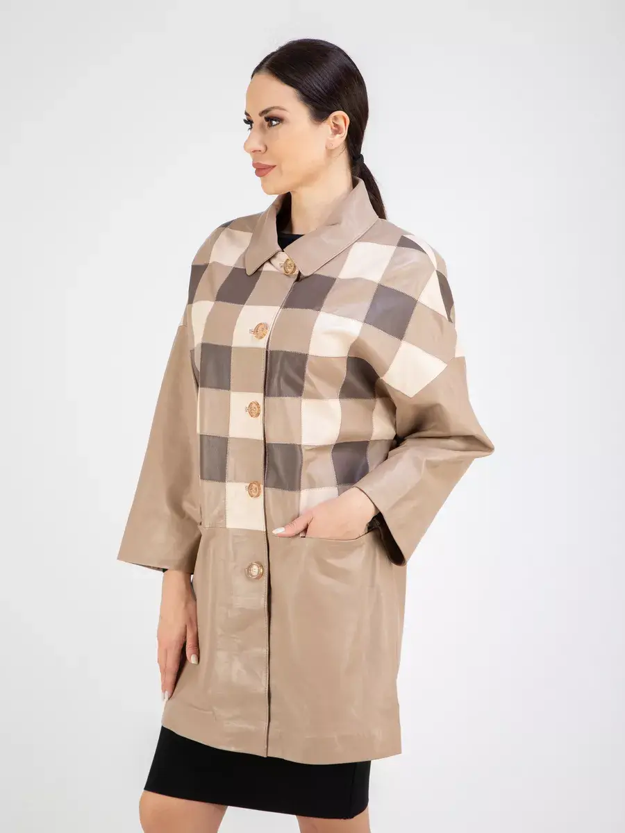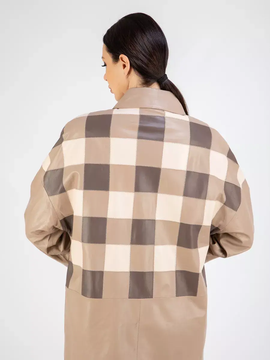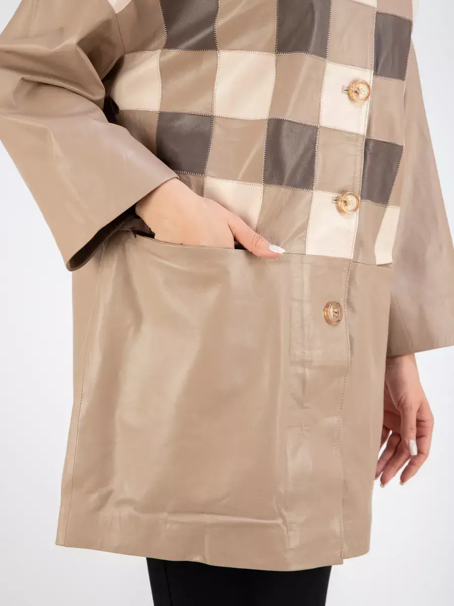 Каждая деталь этой удлиненной кожаной куртки выполнена с особым вниманием к качеству материалов. Премиальная кожа, ровные швы, модные прорезные карманы и шахматный рисунок из разных цветов кожи добавляют акценты стиля и функциональности, делают эту женскую куртку эксклюзивным элементом гардероба, который подходит практически под любой стиль, деловой или повседневный. Практичная застежка на пуговицах придаёт образу особый шарм. Отложной воротник и рукав реглан добавляют изюминку образу, делая его неповторимым.