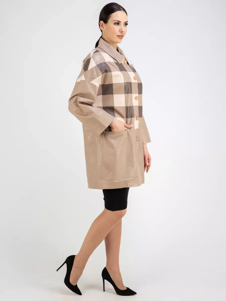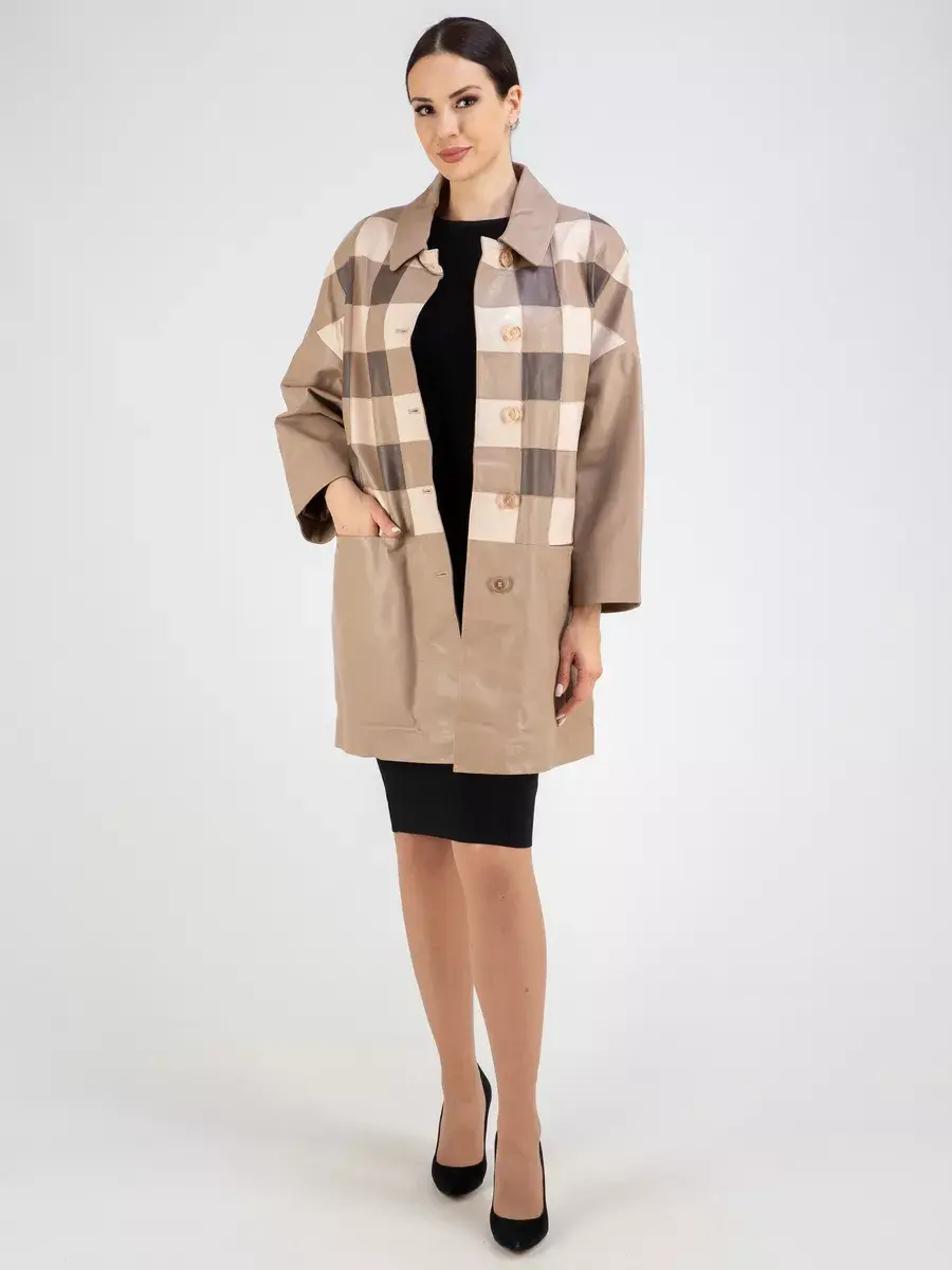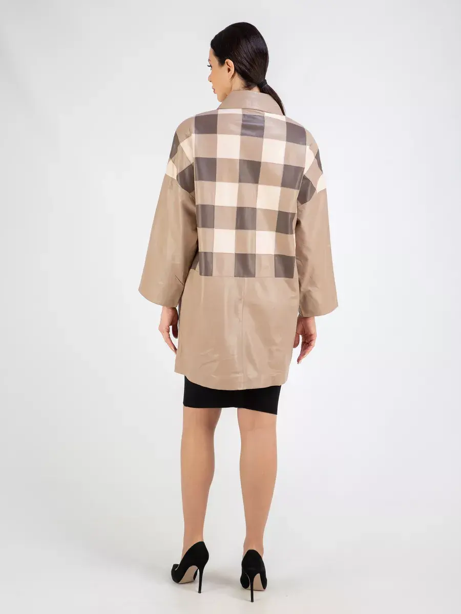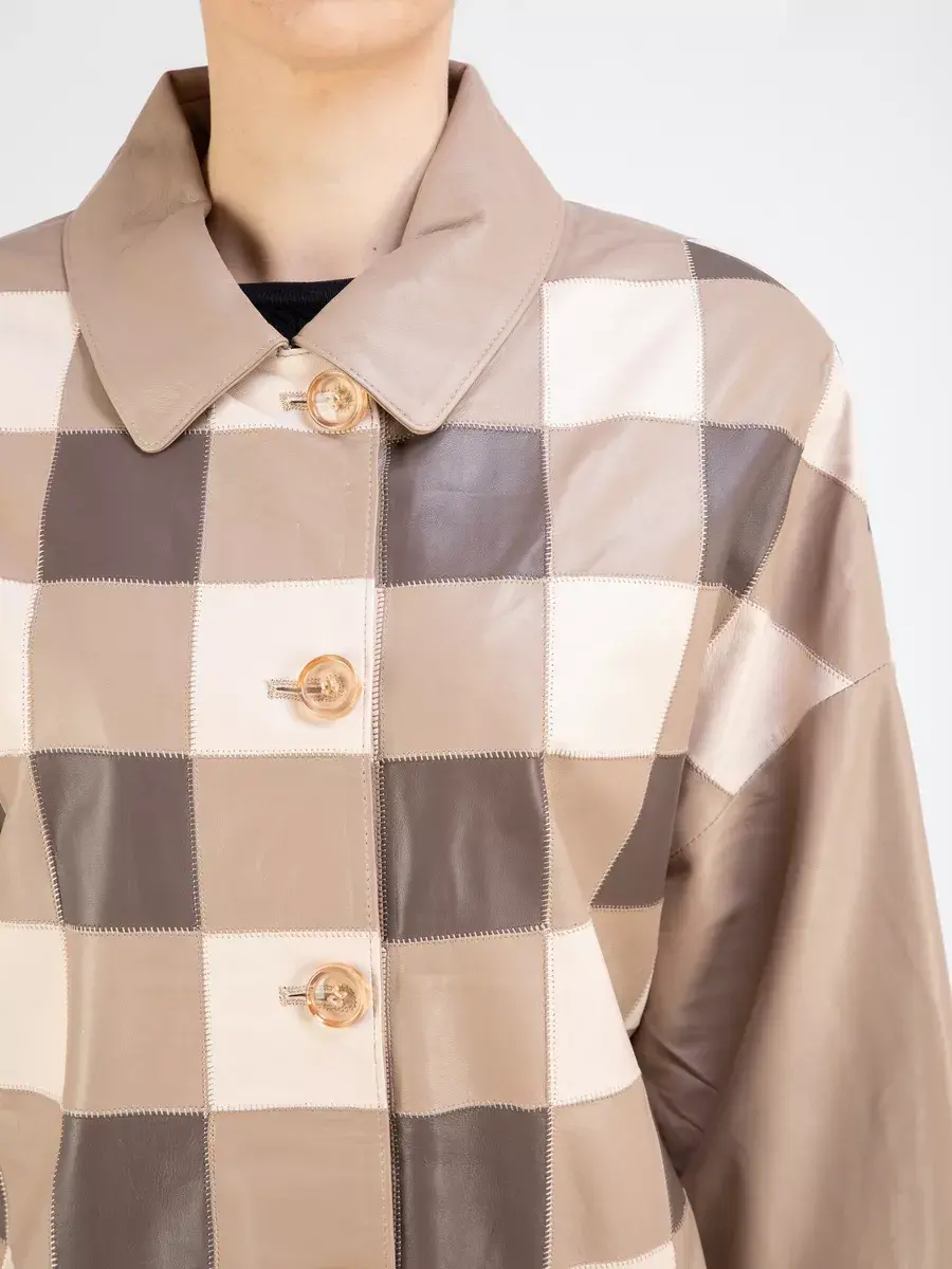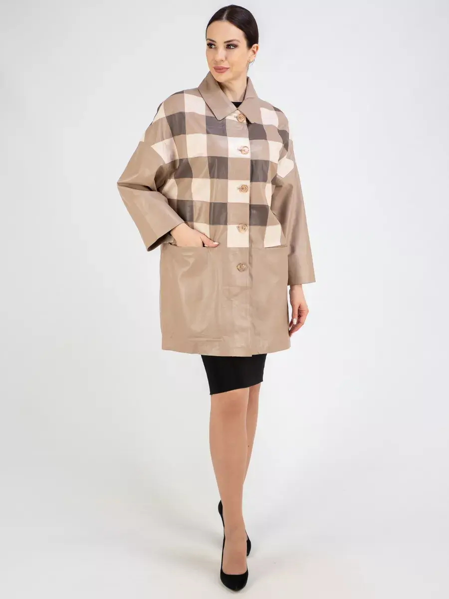 Каждая деталь этой удлиненной кожаной куртки выполнена с особым вниманием к качеству материалов. Премиальная кожа, ровные швы, модные прорезные карманы и шахматный рисунок из разных цветов кожи добавляют акценты стиля и функциональности, делают эту женскую куртку эксклюзивным элементом гардероба, который подходит практически под любой стиль, деловой или повседневный. Практичная застежка на пуговицах придаёт образу особый шарм. Отложной воротник и рукав реглан добавляют изюминку образу, делая его неповторимым.