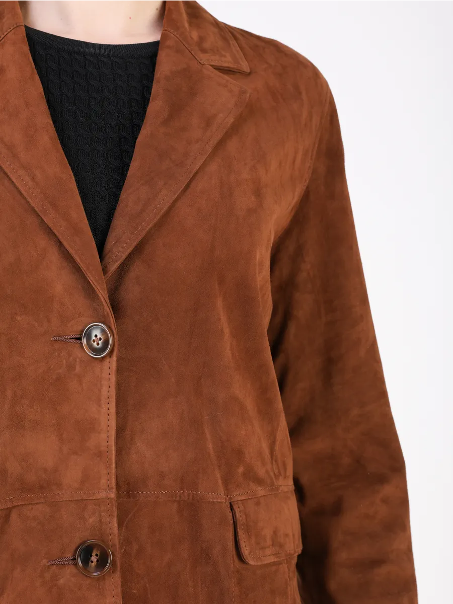 Женский пиджак замшевый, кожаная куртка женская укороченная изготовлена из элитной испанской замши ягненка, отличается особой мягкостью, лёгкостью и долговечностью. Без подкладки, она прекрасно сидит по фигуре благодаря приталенному крою и аккуратным втачным рукавам с манжетами на пуговицах. Застёжка на пуговицах и элегантные накладные карманы с клапанами подчеркивают лаконичный и женственный дизайн.