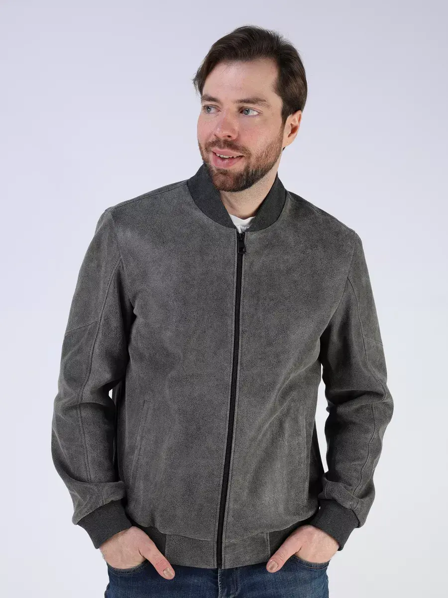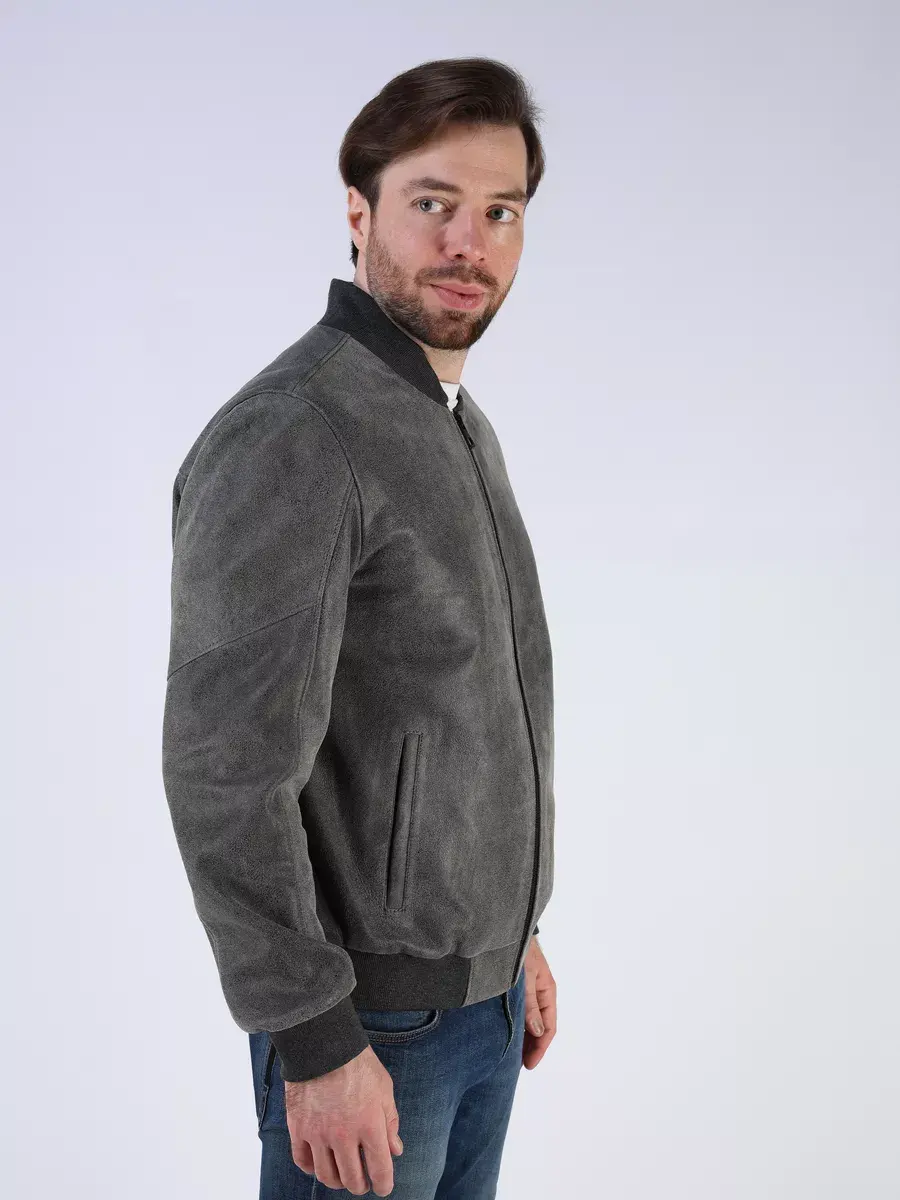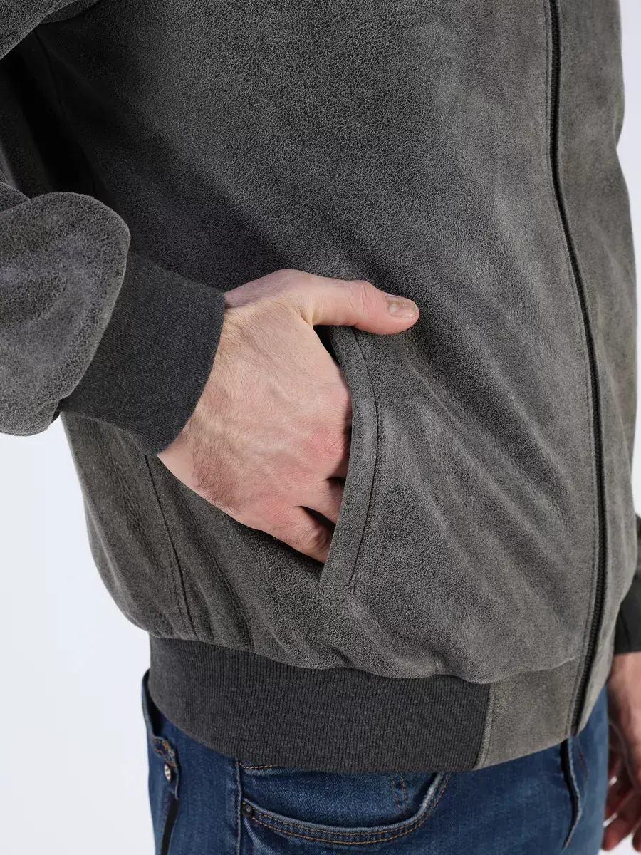 Стильная модель бомбер мужской куртки выполнена из мягкой натуральной кожи ягненка выделки нуплин, то же, что и крэк, но поверхность менее шероховатая (с винтаж-эффектом) - с эффектом старения и потертости.