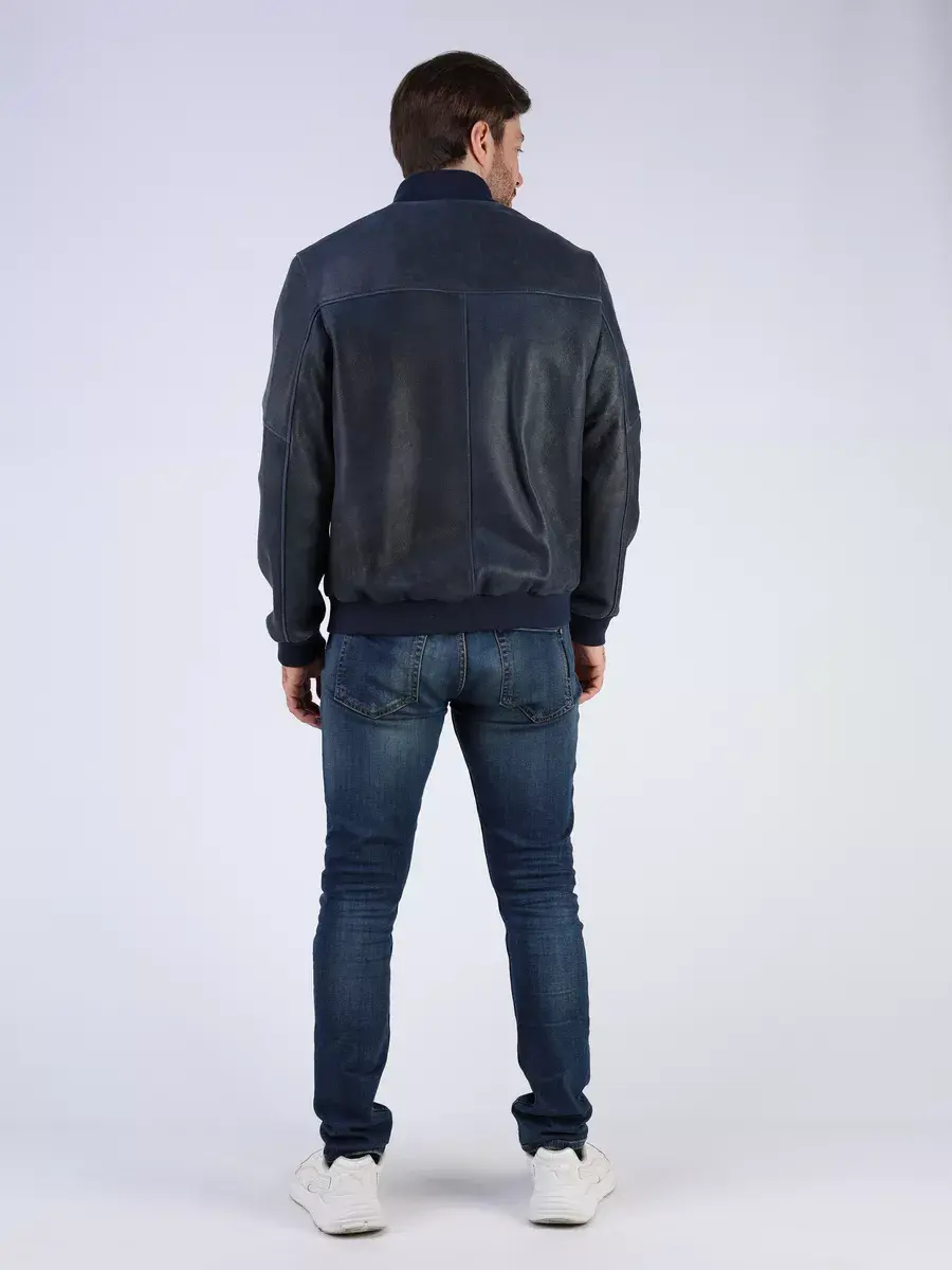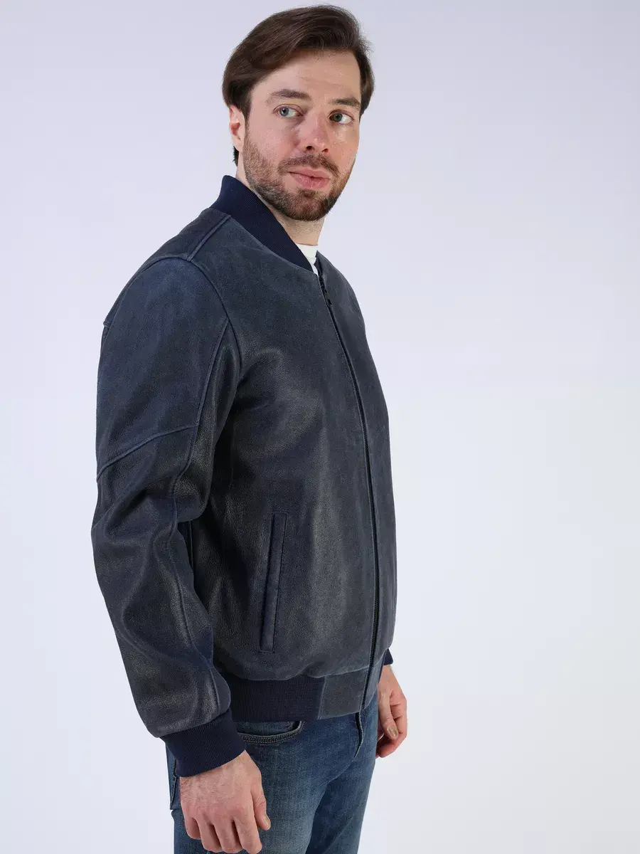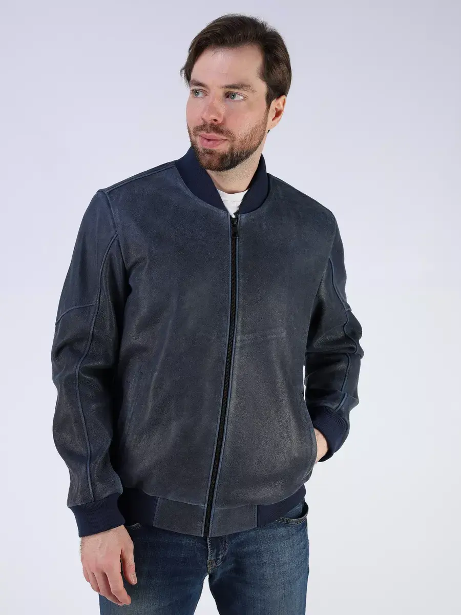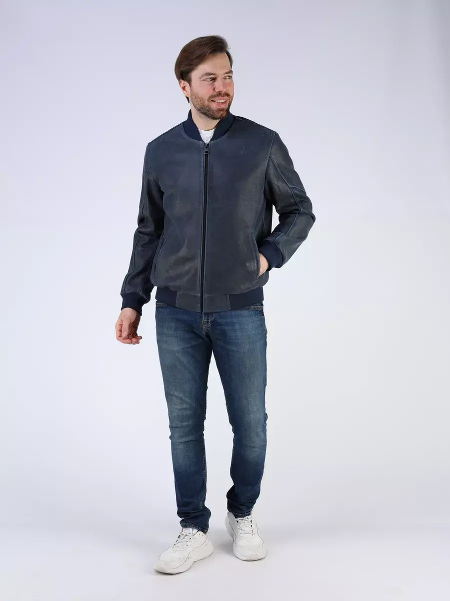Стильная модель бомбер мужской куртки выполнена из мягкой натуральной кожи ягненка выделки нуплин, то же, что и крэк, но поверхность менее шероховатая (с винтаж-эффектом) - с эффектом старения и потертости.