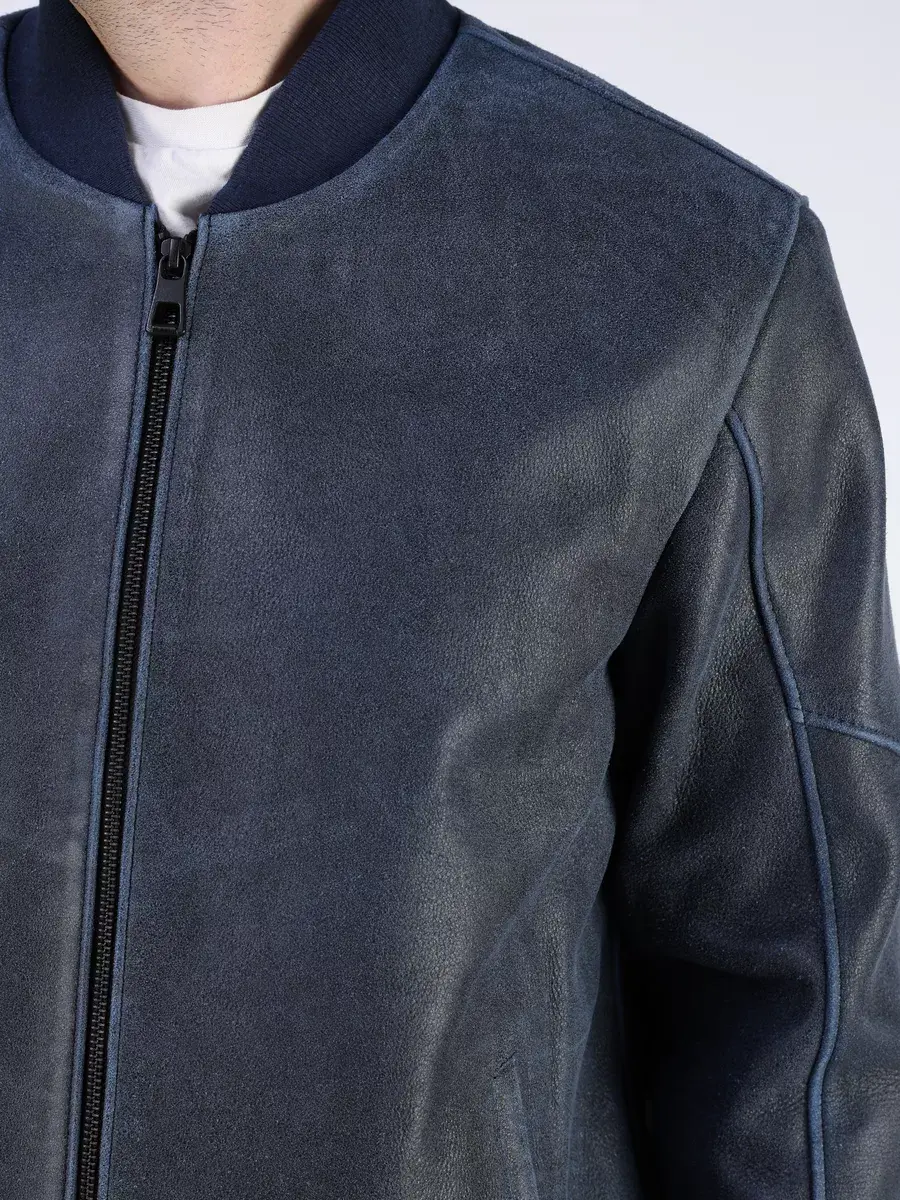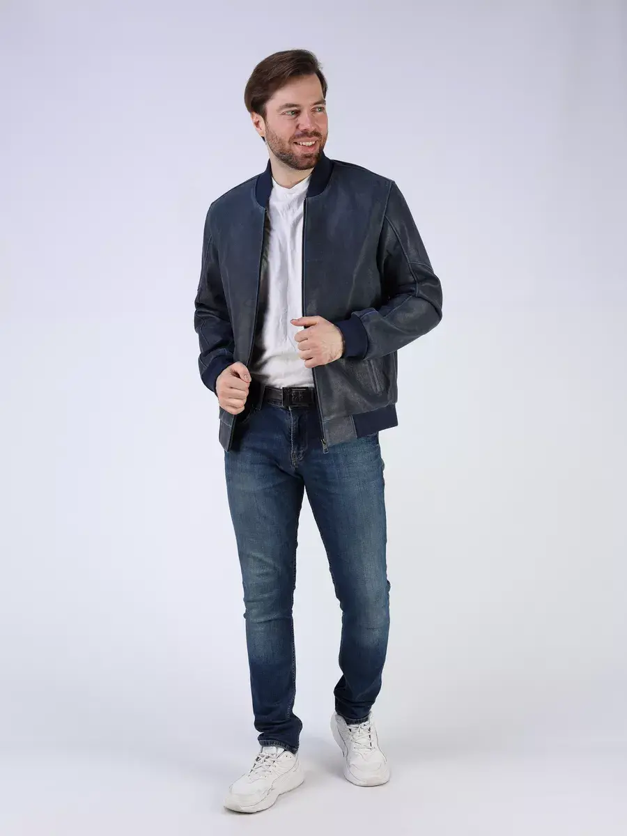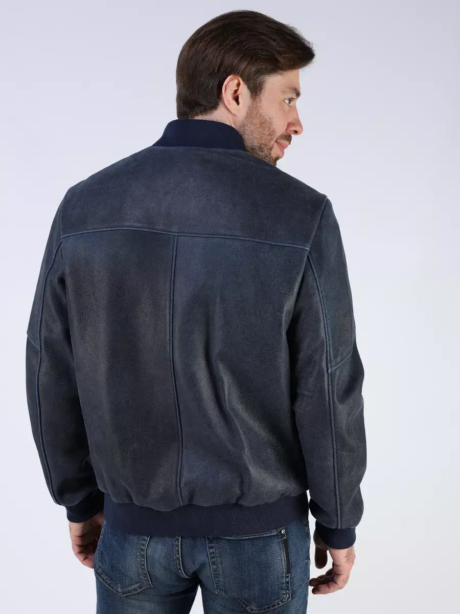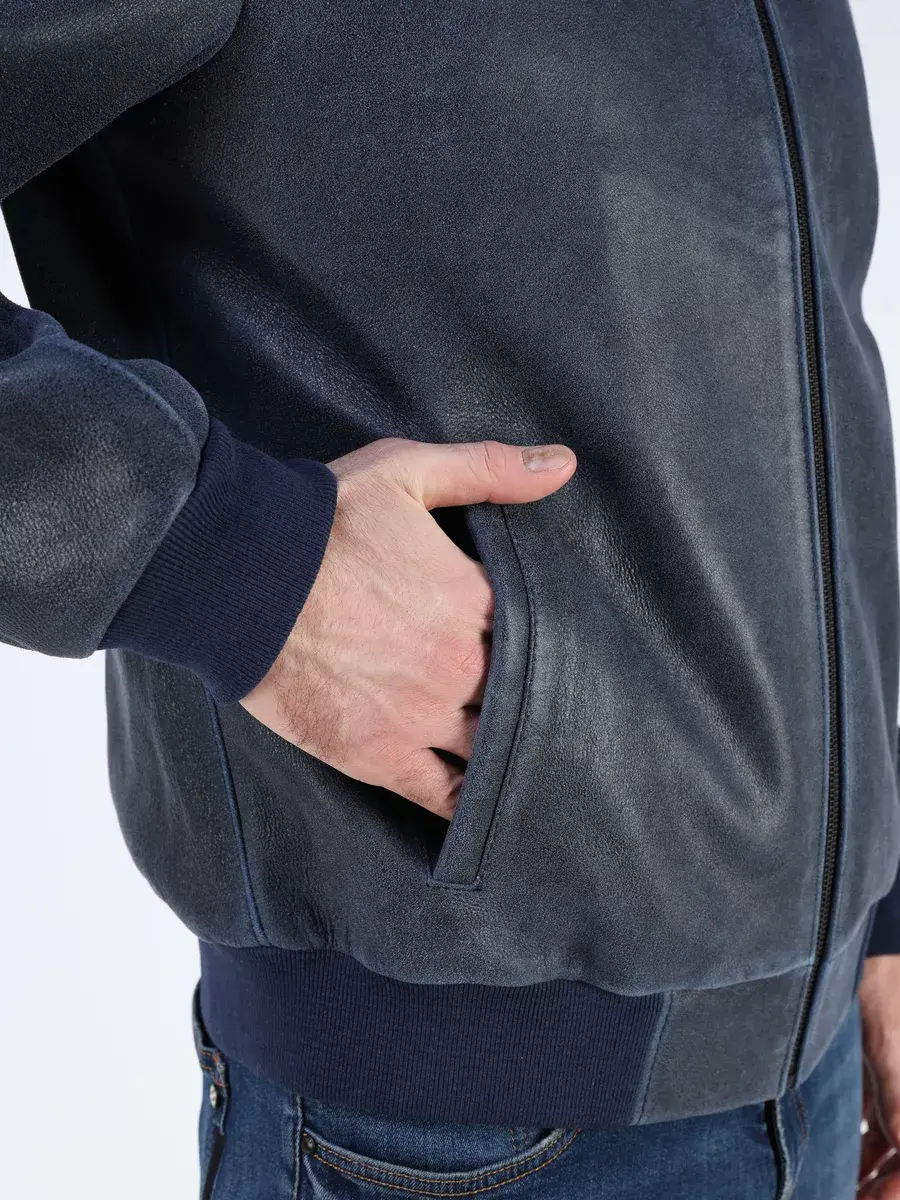 Стильная модель бомбер мужской куртки выполнена из мягкой натуральной кожи ягненка выделки нуплин, то же, что и крэк, но поверхность менее шероховатая (с винтаж-эффектом) - с эффектом старения и потертости.
