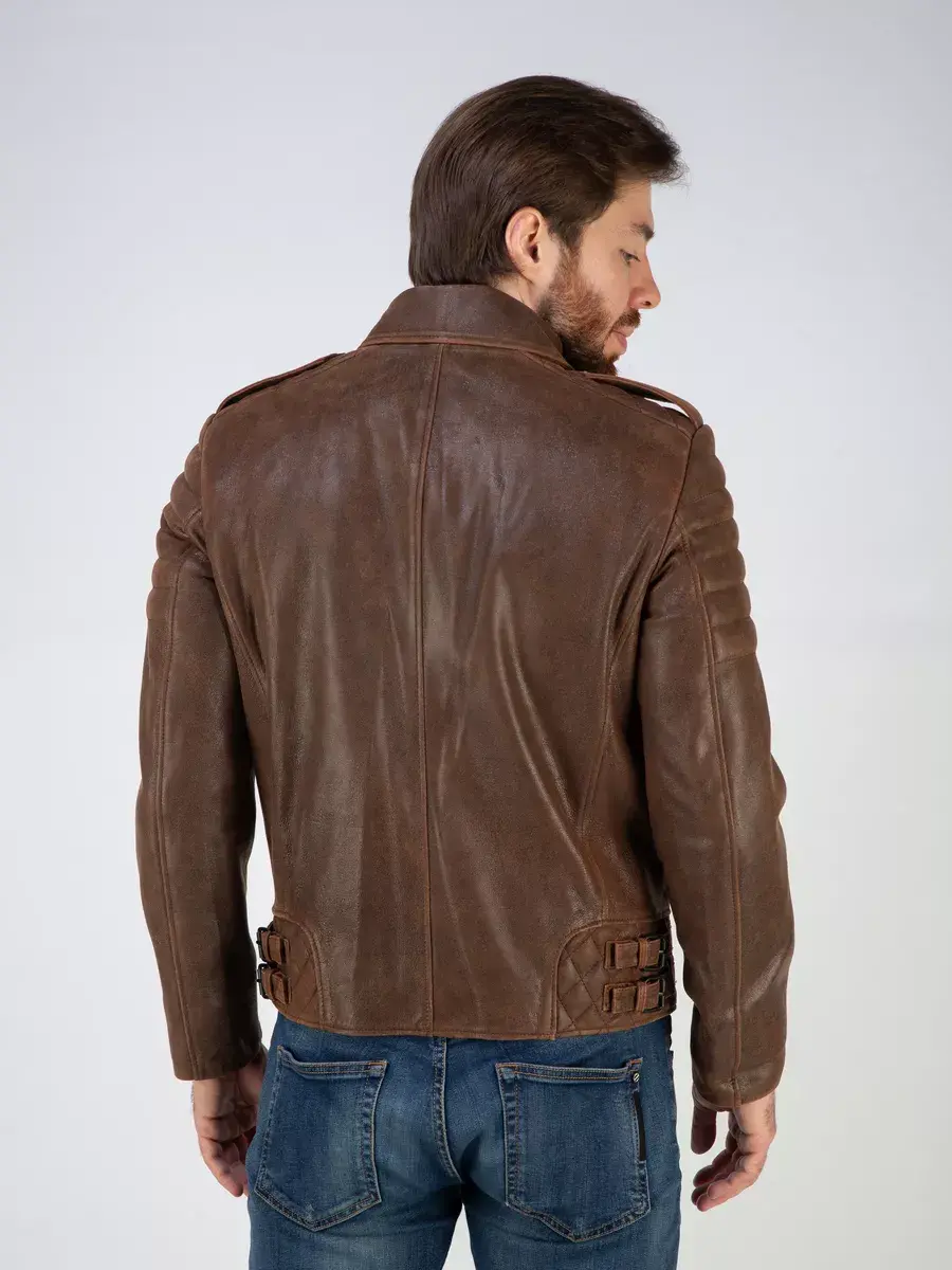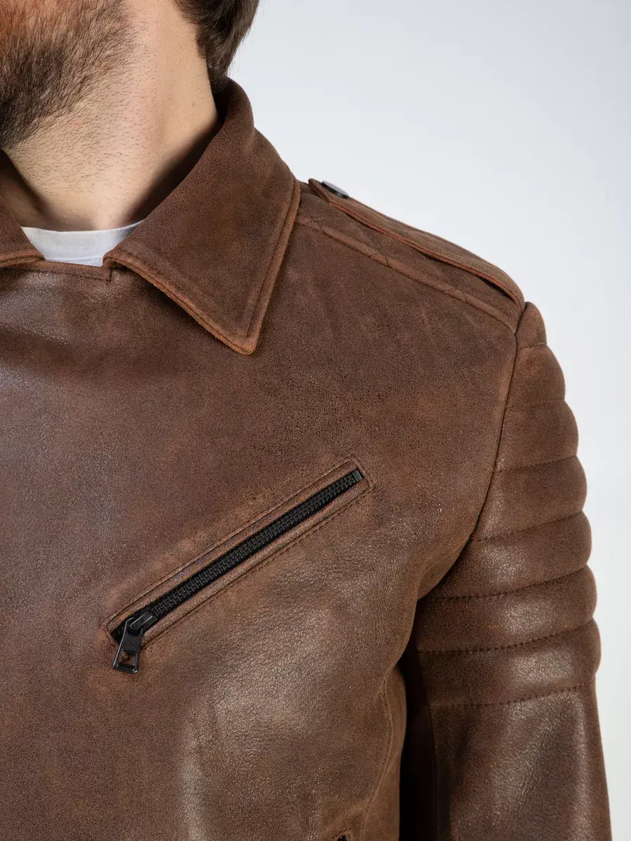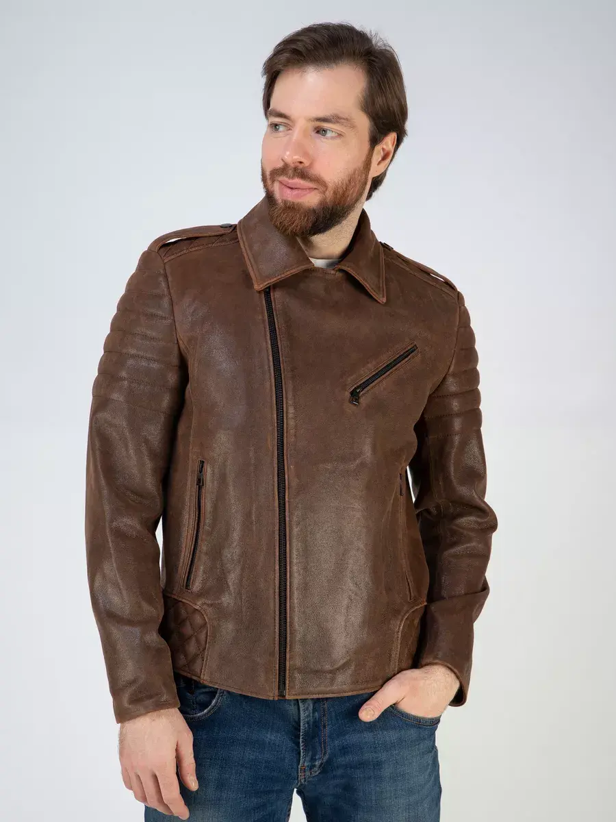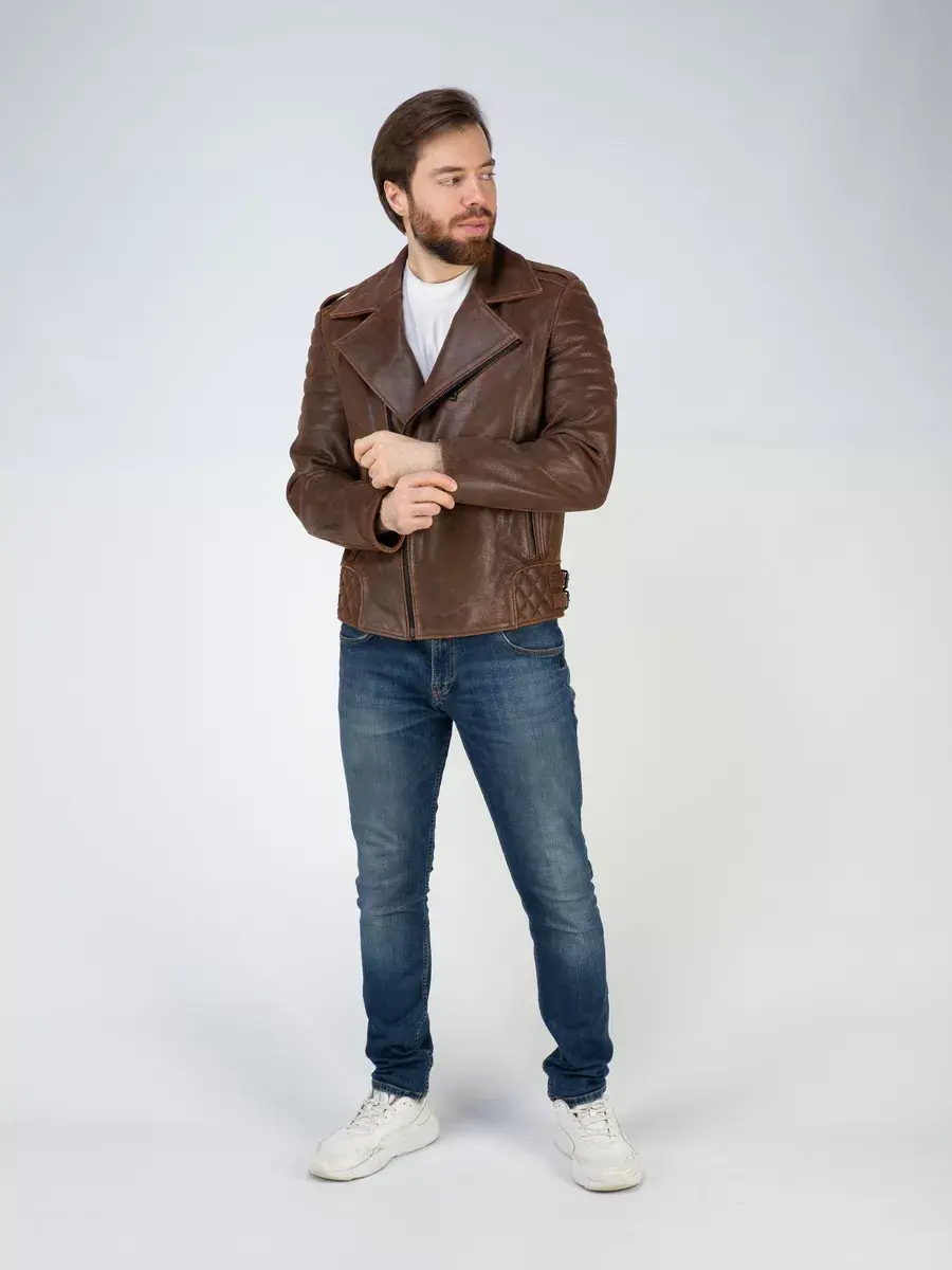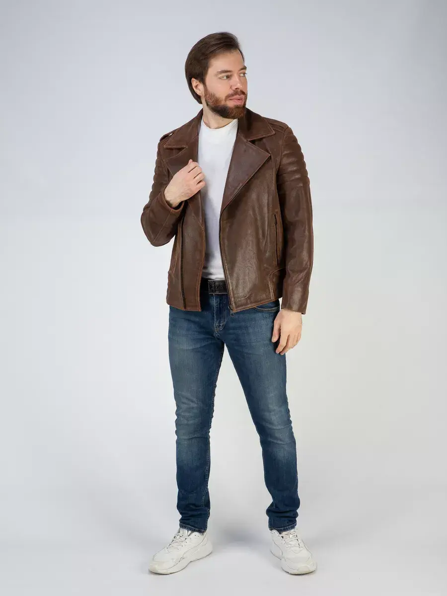 Каждая деталь мужской куртки, косухи кожаной выполнена с особым вниманием к качеству материалов. Классический воротник, премиальная винтажная фактура кожи, эполеты, хлястики по бокам и декоративные стеганые строчки придают куртке уникальность и изысканность, идеально впишется в любой стиль и дополнит солидный и брутальный образ мужчины или парня подростка, независимо от возраста. Застежка на молнии обеспечивает легкость и удобство в использовании, а прорезные карманы на молниях по бокам и внутренний карман дополнительно увеличивают функциональность и практичность куртки.