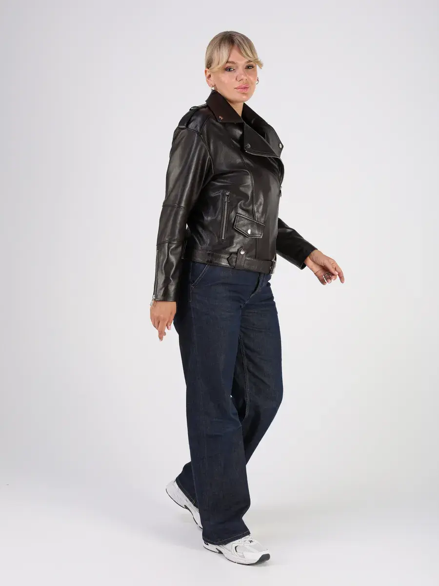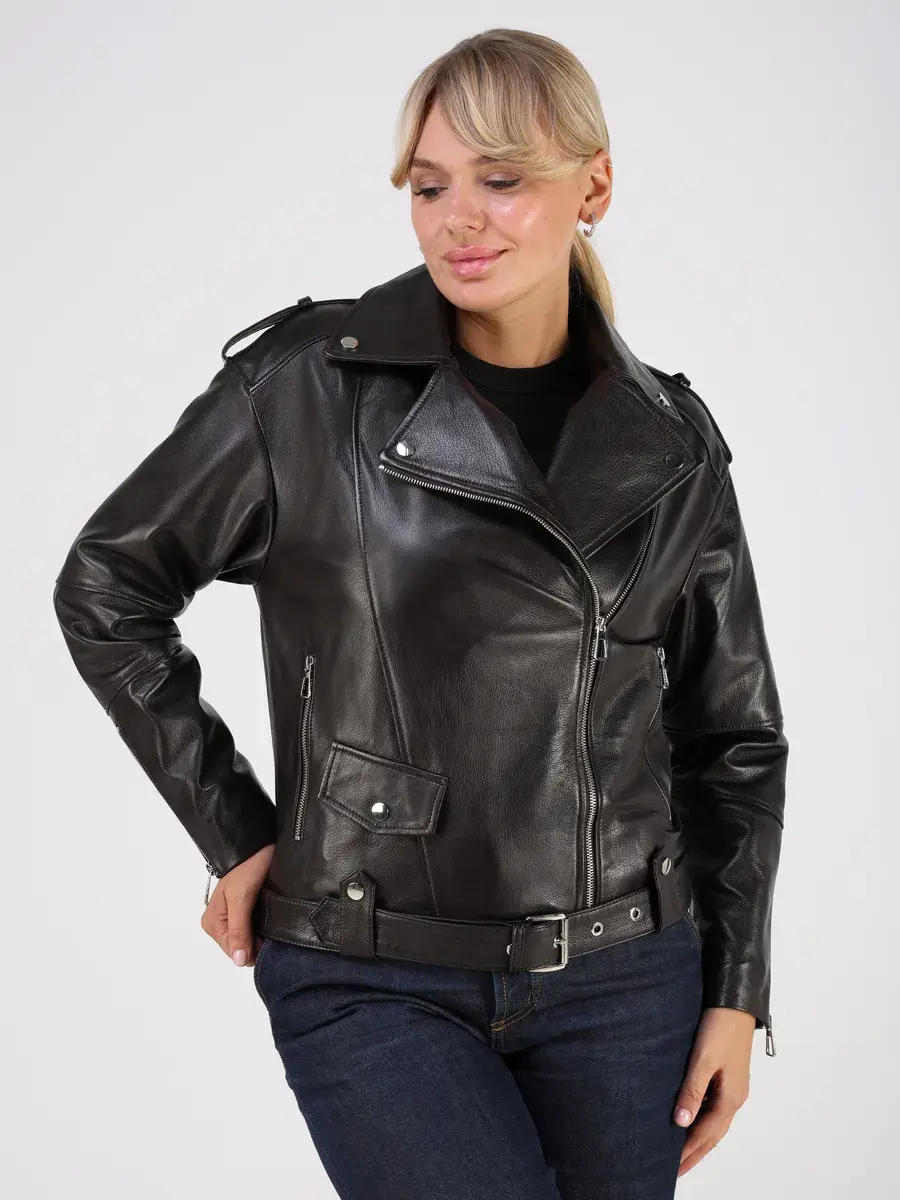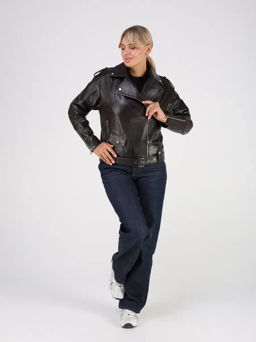 Стильная кожаная куртка косуха женская оверсайз из натуральной кожи подчеркнет вашу индивидуальность. Данная модель куртки, косухи выполнена из кожи ягнёнка, которая отличается высокой прочностью и долговечностью, сохраняя при этом свою мягкость и эластичность.
