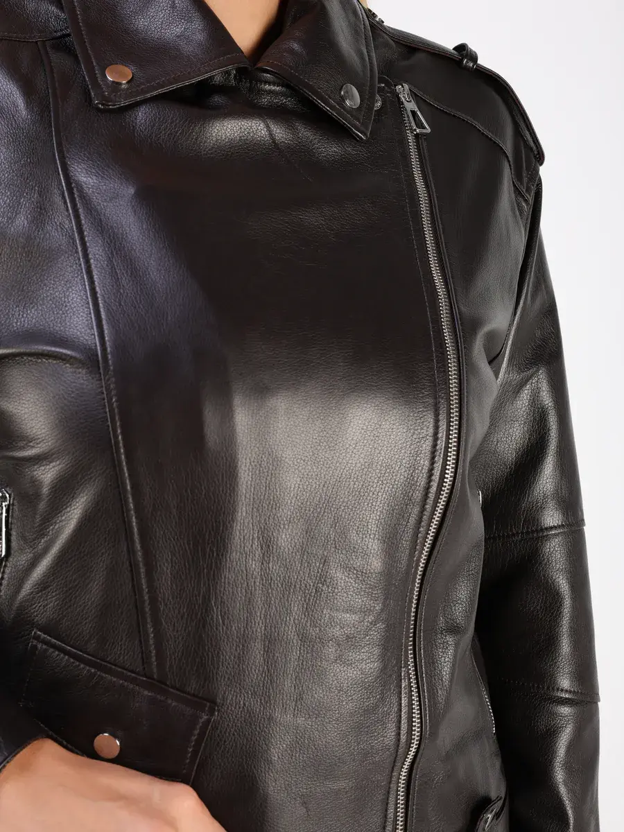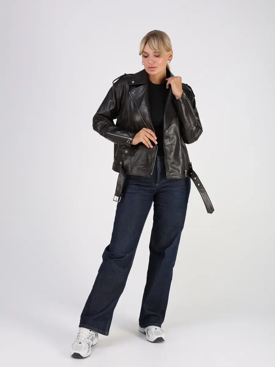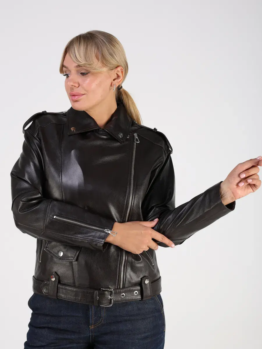 Стильная кожаная куртка косуха женская оверсайз из натуральной кожи подчеркнет вашу индивидуальность. Данная модель куртки, косухи выполнена из кожи ягнёнка, которая отличается высокой прочностью и долговечностью, сохраняя при этом свою мягкость и эластичность.
