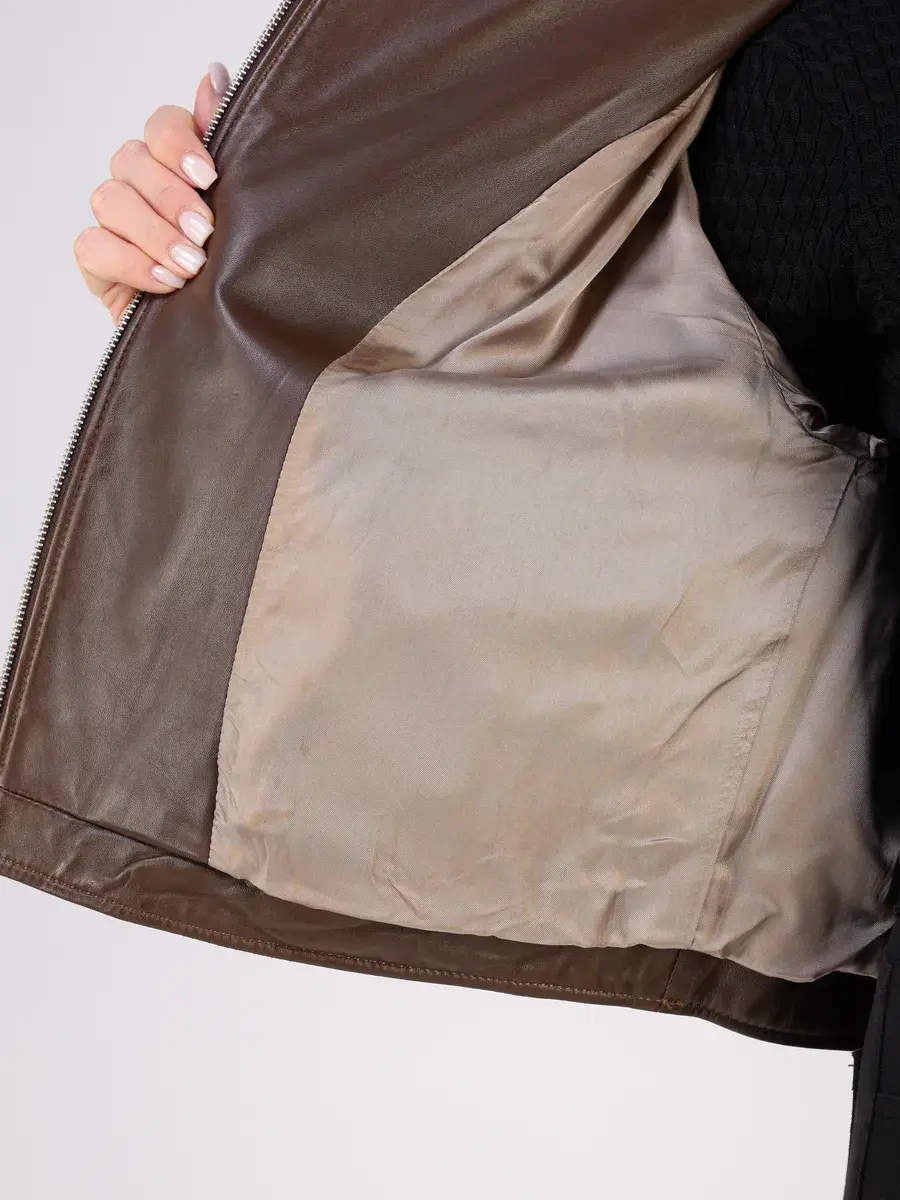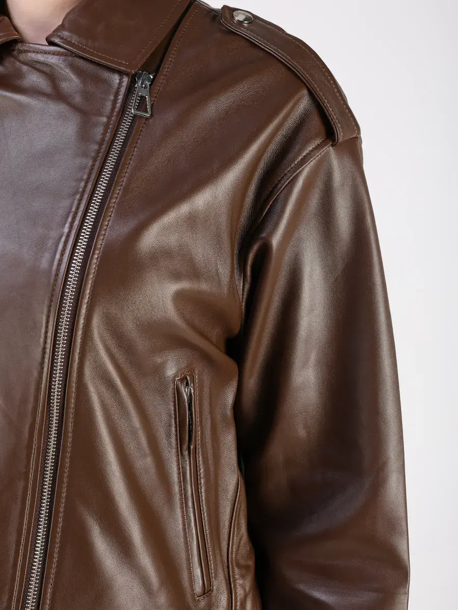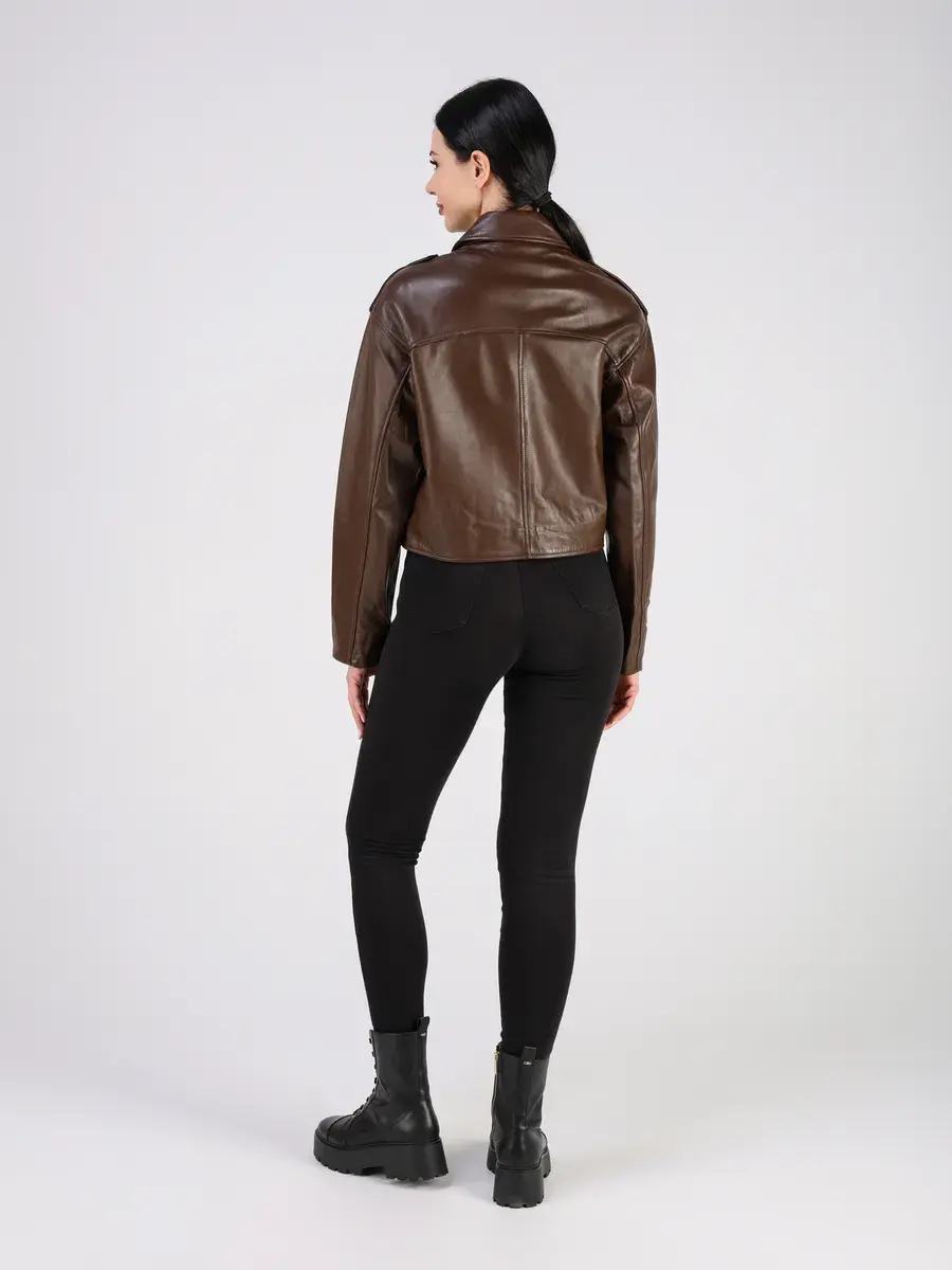 Каждая деталь этой кожаной куртки выполнена с особым вниманием к качеству. Прорезные карманы на молнии, декоротивные эполети и фурнитура добавляют акценты стиля и функциональности, делают эту короткую женскую куртку универсальным элементом гардероба, который подходит практически под любой стиль, деловой или повседневный. Короткий и свободный - прямой крой, спущенная линия плеча и застежка молния обеспечивают этой демисезонной куртке косухе комфорт и свободу движений.