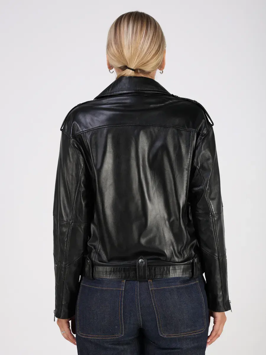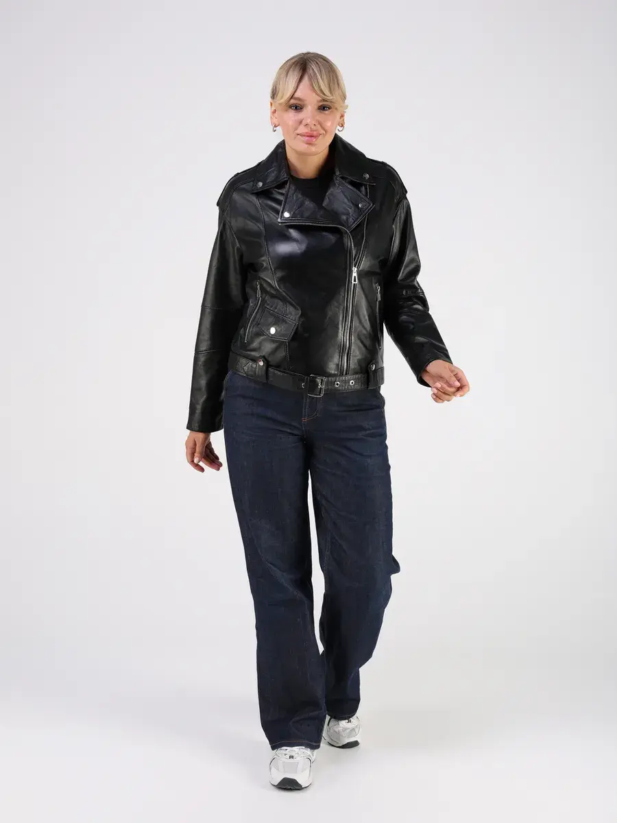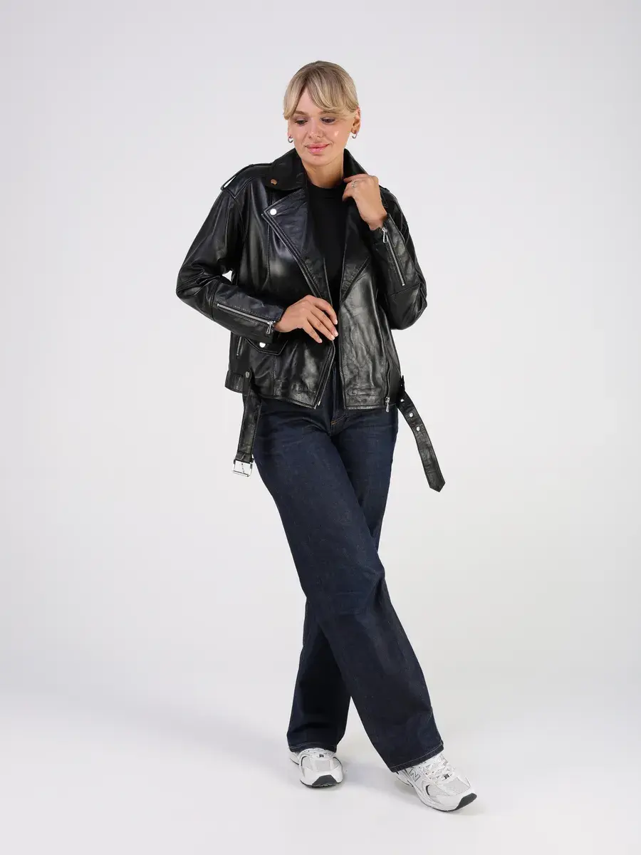 Стильная кожаная куртка косуха женская оверсайз из натуральной кожи подчеркнет вашу индивидуальность. Данная модель куртки, косухи выполнена из кожи ягнёнка, которая отличается высокой прочностью и долговечностью, сохраняя при этом свою мягкость и эластичность.