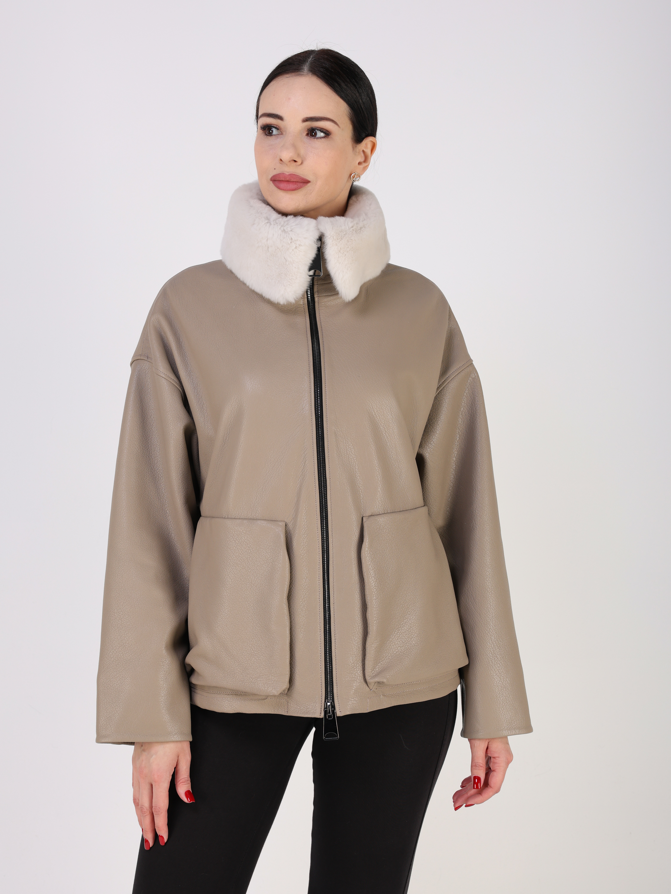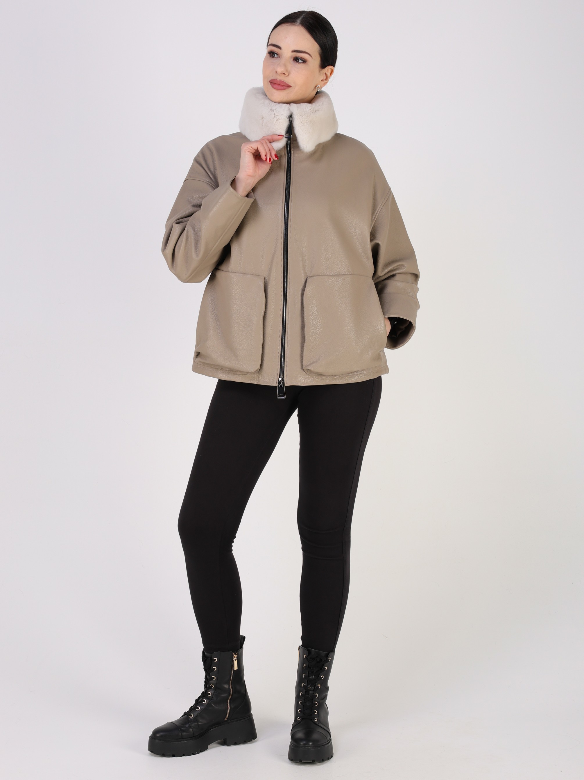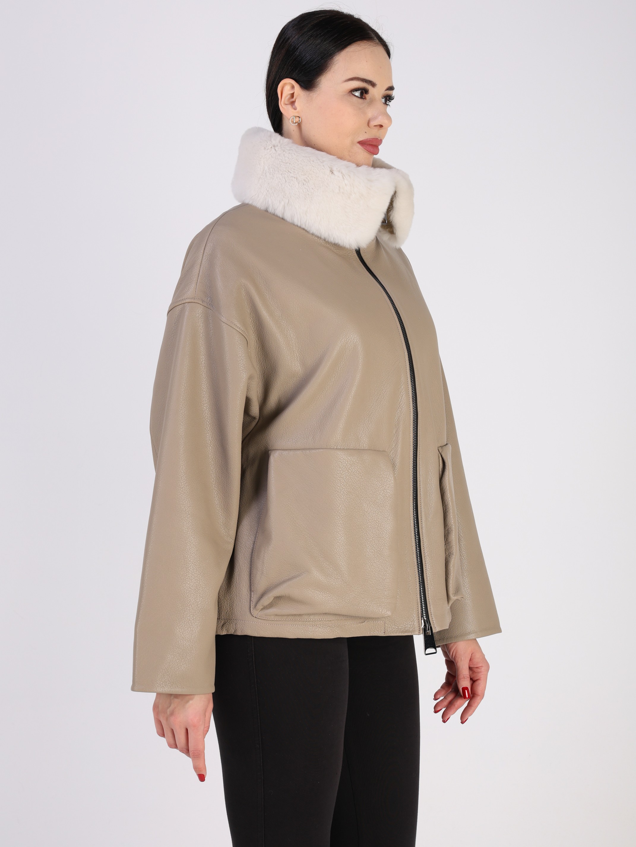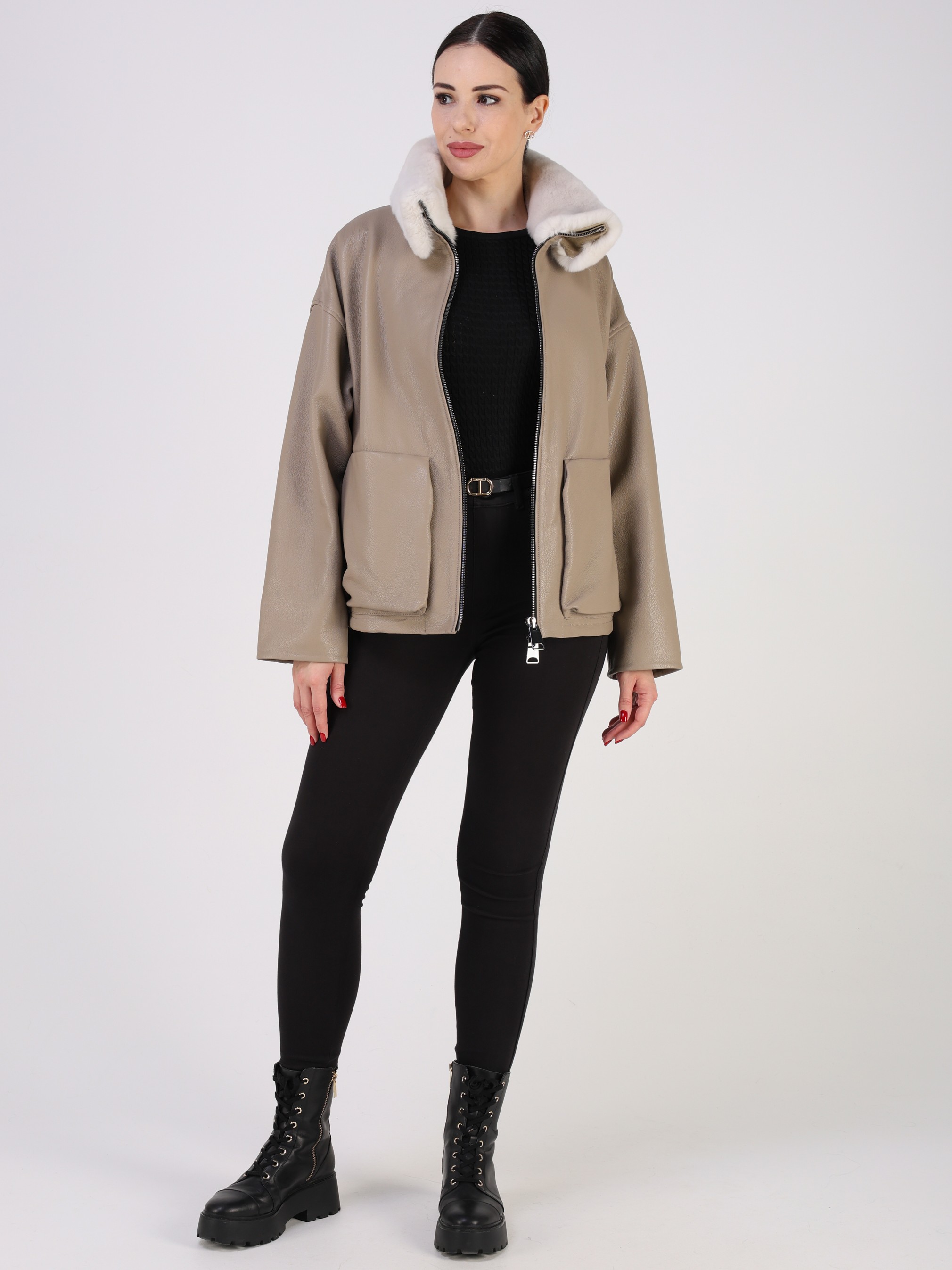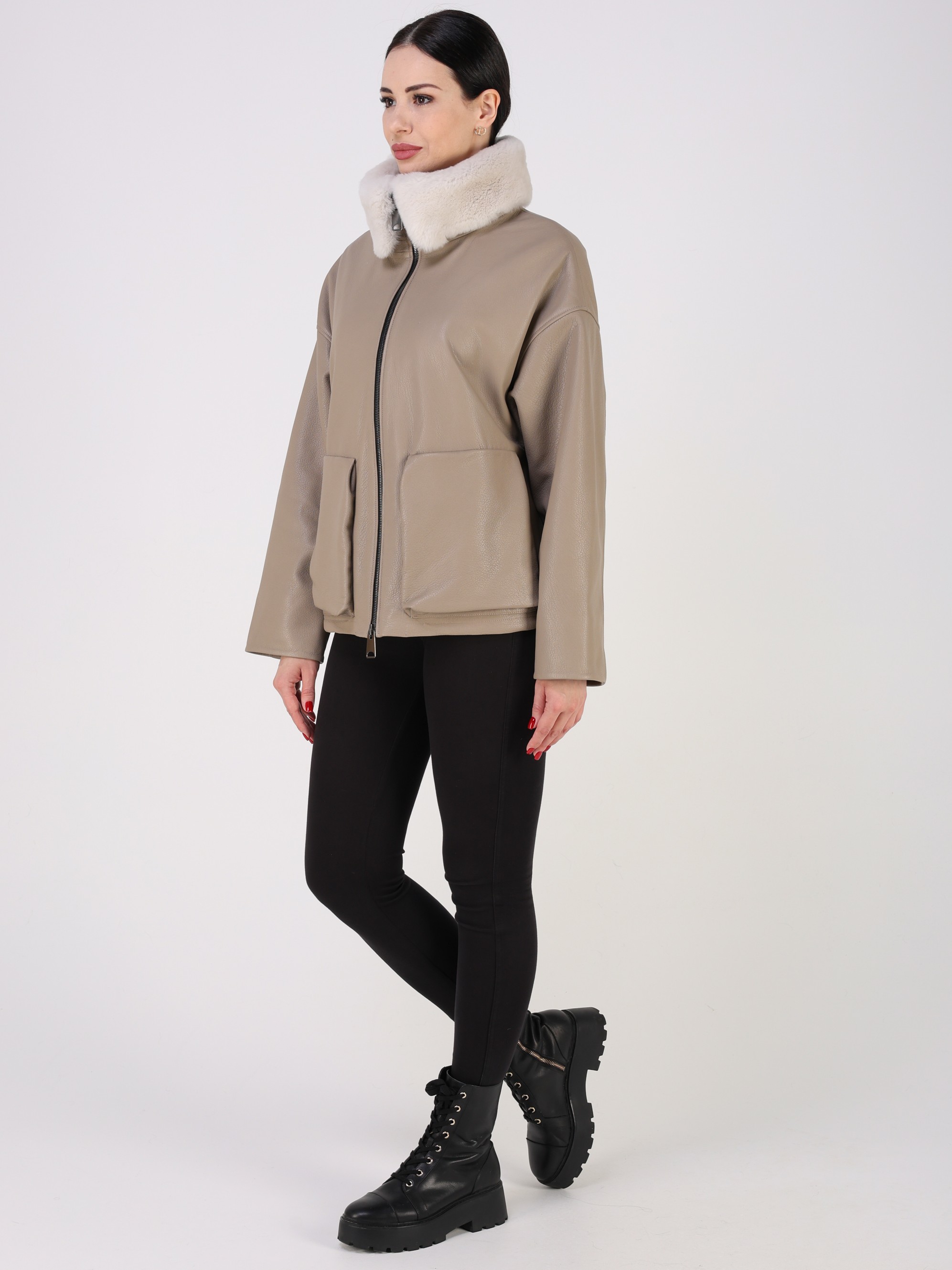 Куртка кожаная женская короткая из натуральной кожи ягненка выделки "джумбо". Плотная кожа с выраженной крупнозернистой фактурой. Она отличается мягкостью, долговечностью и отличными ветрозащитными свойствами. Модель свободного - оверсайз кроя с утягивающими кулисками в подоле. Детали: застежка на молнии, карманы накладные, спущенная линия плеча, съемный меховой воротник овчина.