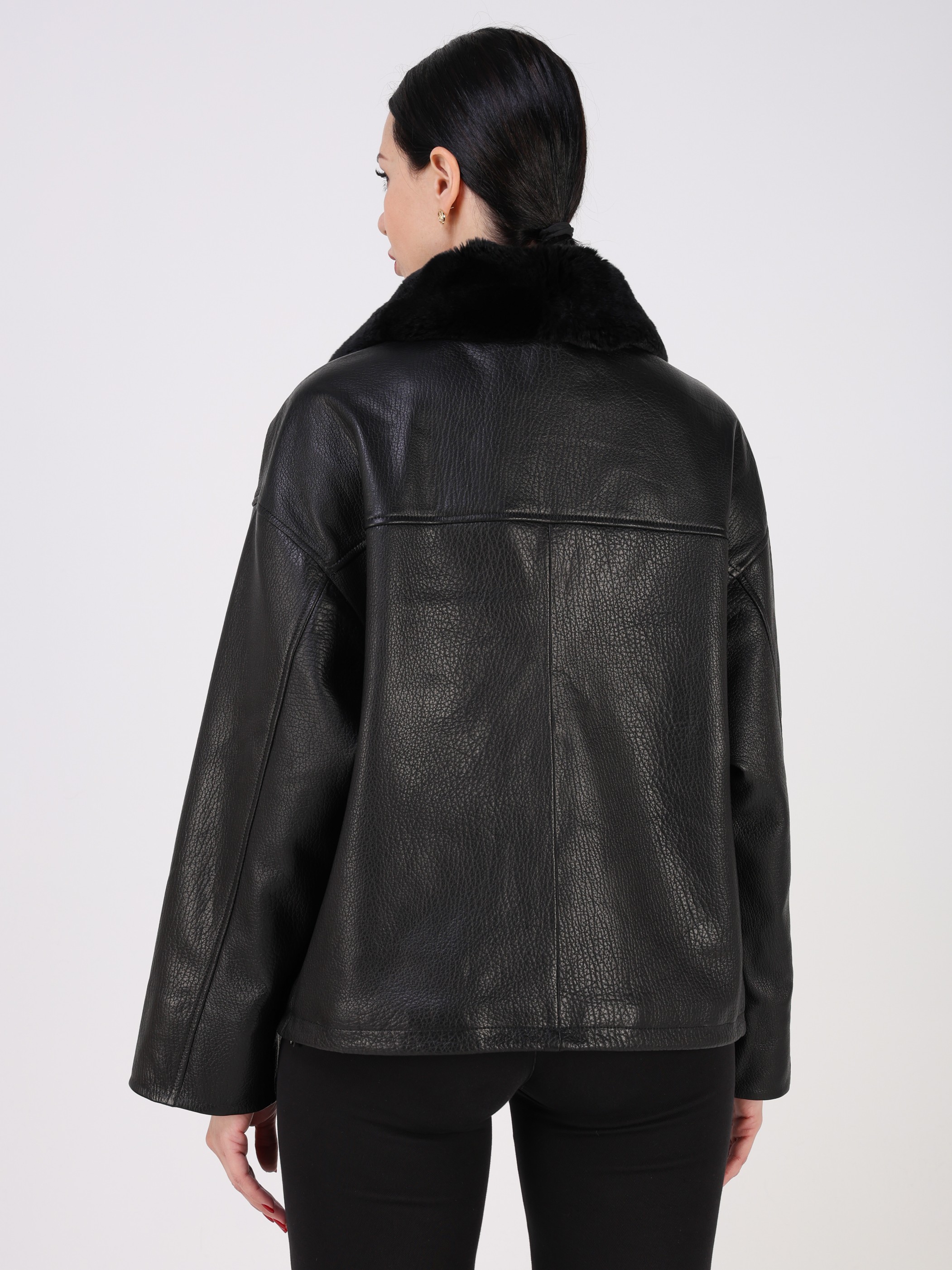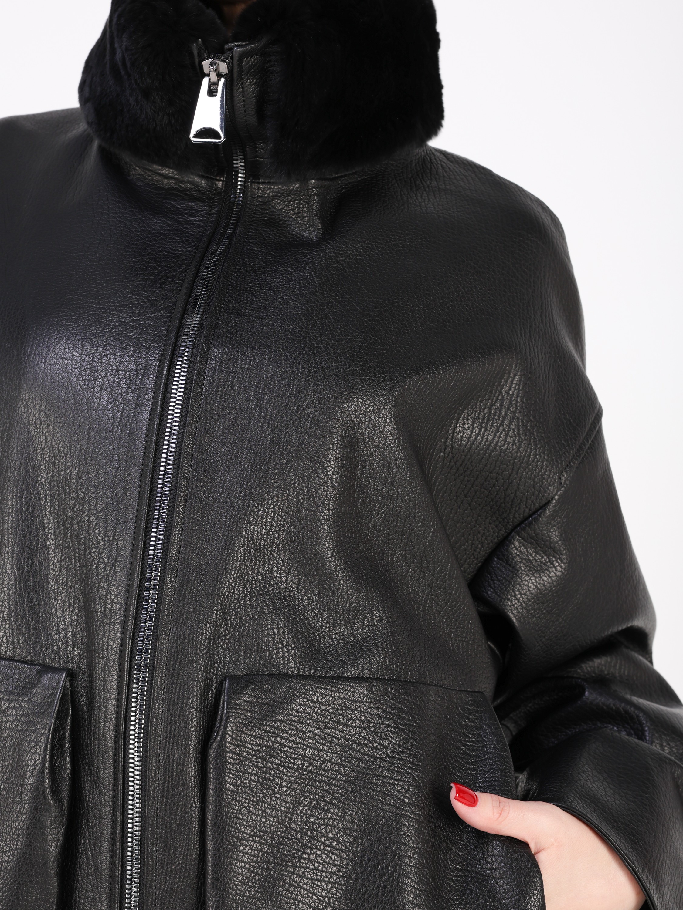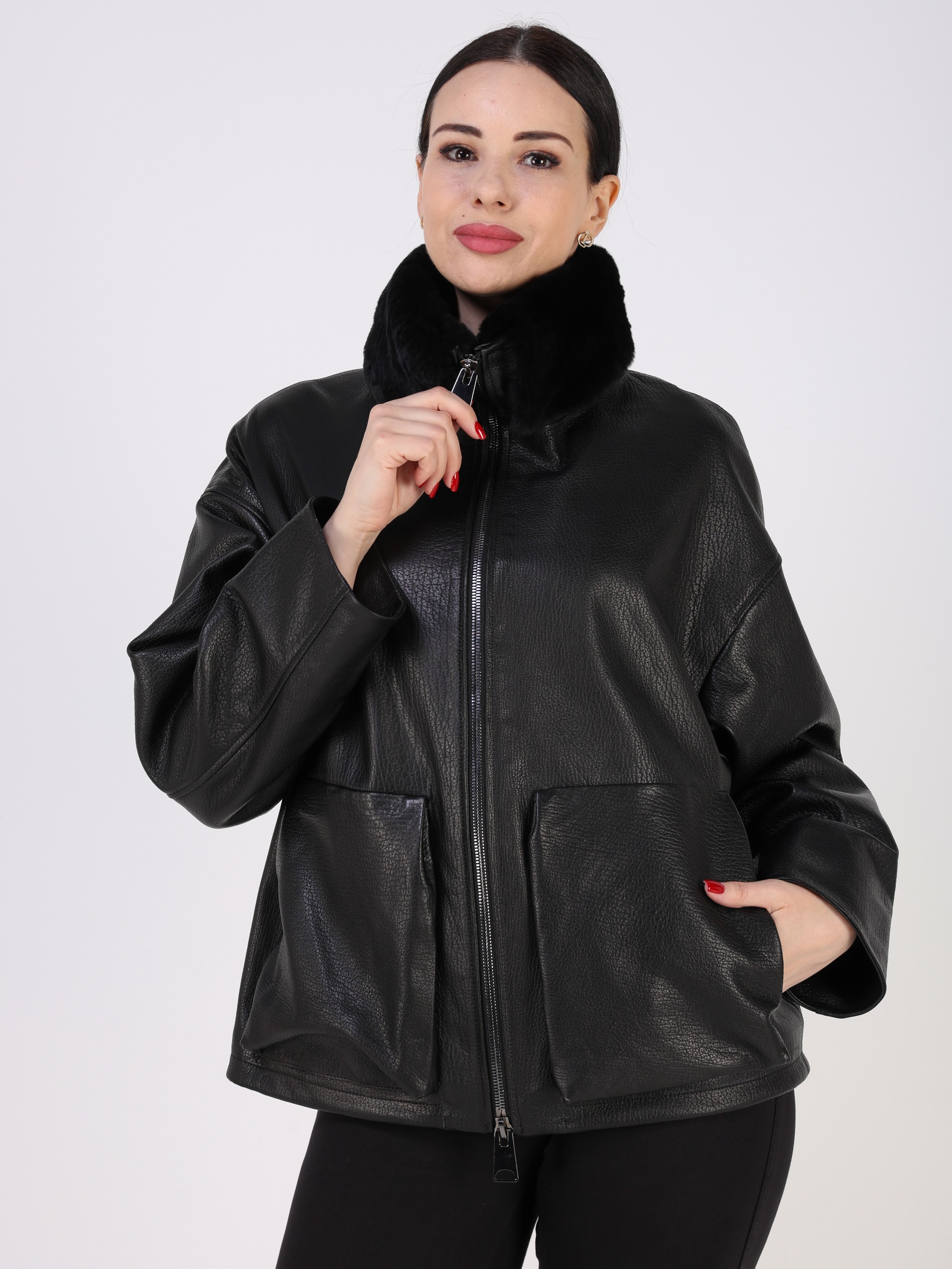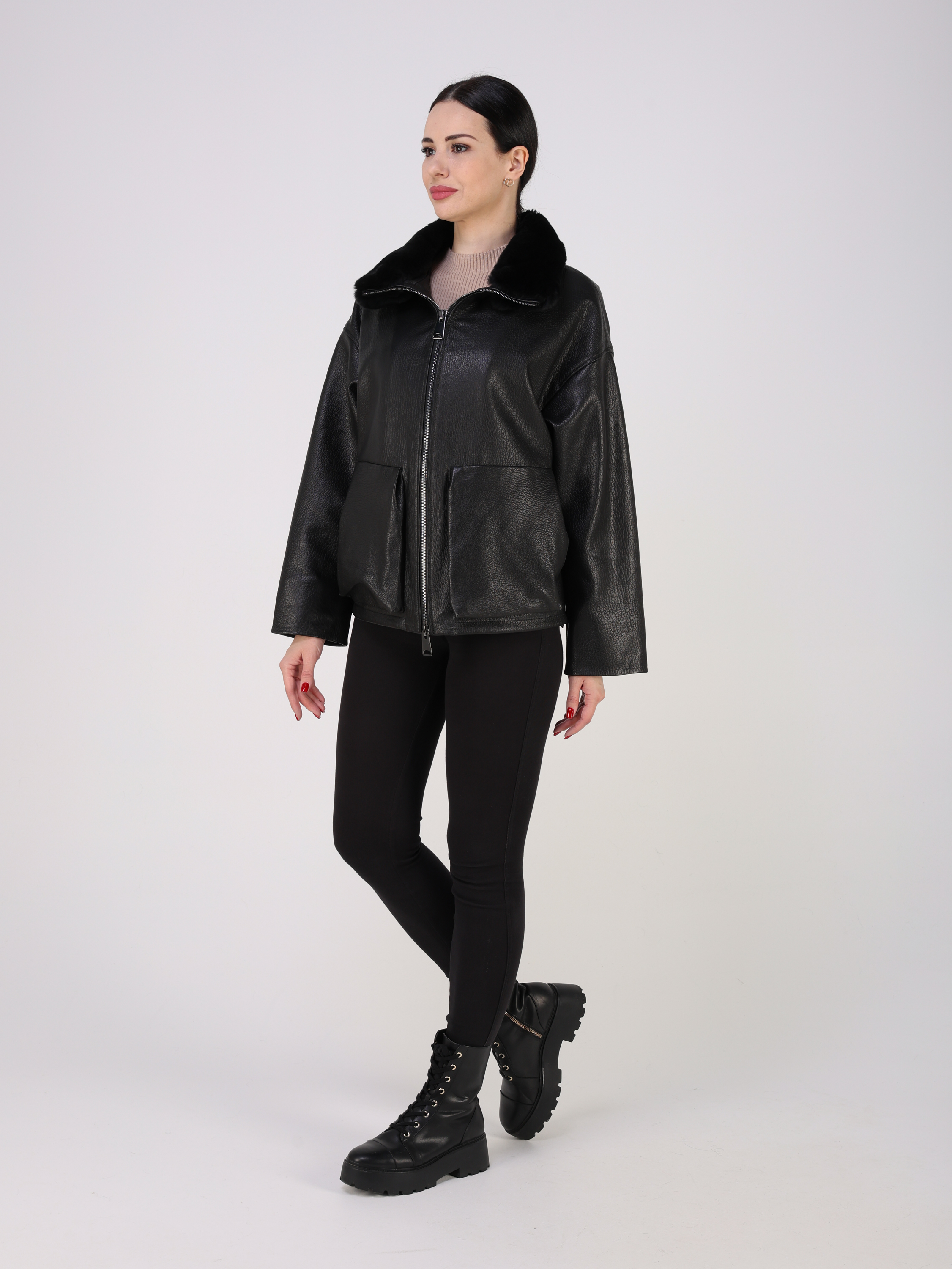 Куртка кожаная женская короткая из натуральной кожи ягненка выделки "джумбо". Плотная кожа с выраженной крупнозернистой фактурой. Она отличается мягкостью, долговечностью и отличными ветрозащитными свойствами. Модель свободного - оверсайз кроя с утягивающими кулисками в подоле. Детали: застежка на молнии, карманы накладные, спущенная линия плеча, съемный меховой воротник овчина.