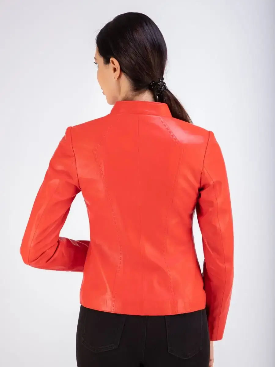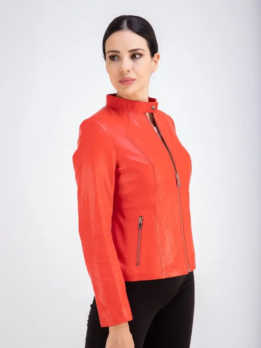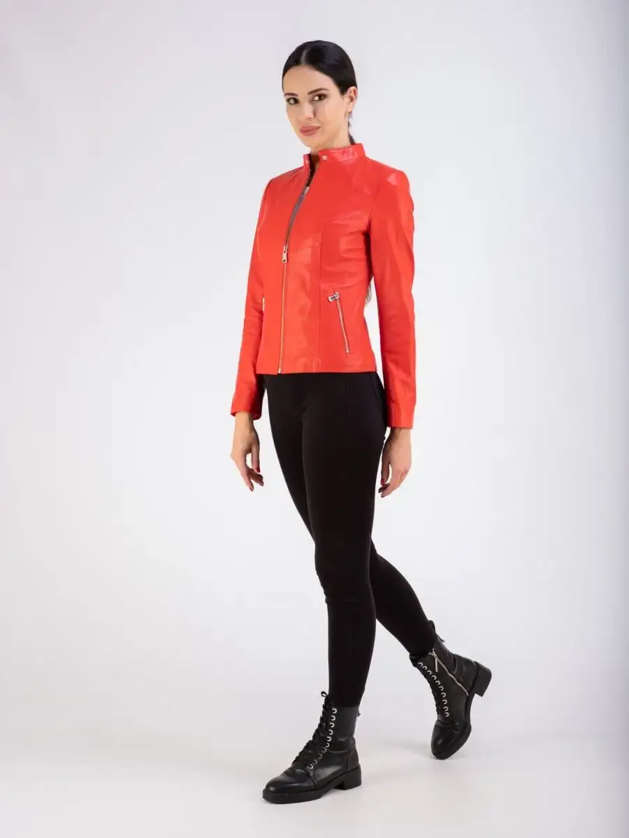 Каждая деталь этой кожаной куртки выполнена с особым вниманием к качеству материалов. Куртка женская весна - осень имеет длину по спинке 55см. Классический воротник стойка с кнопкой, гладкая кожа, фурнитура придают куртке уникальность и изысканность, идеально впишется в любой стиль и дополнит образ женщины или девочки, независимо от возраста.
