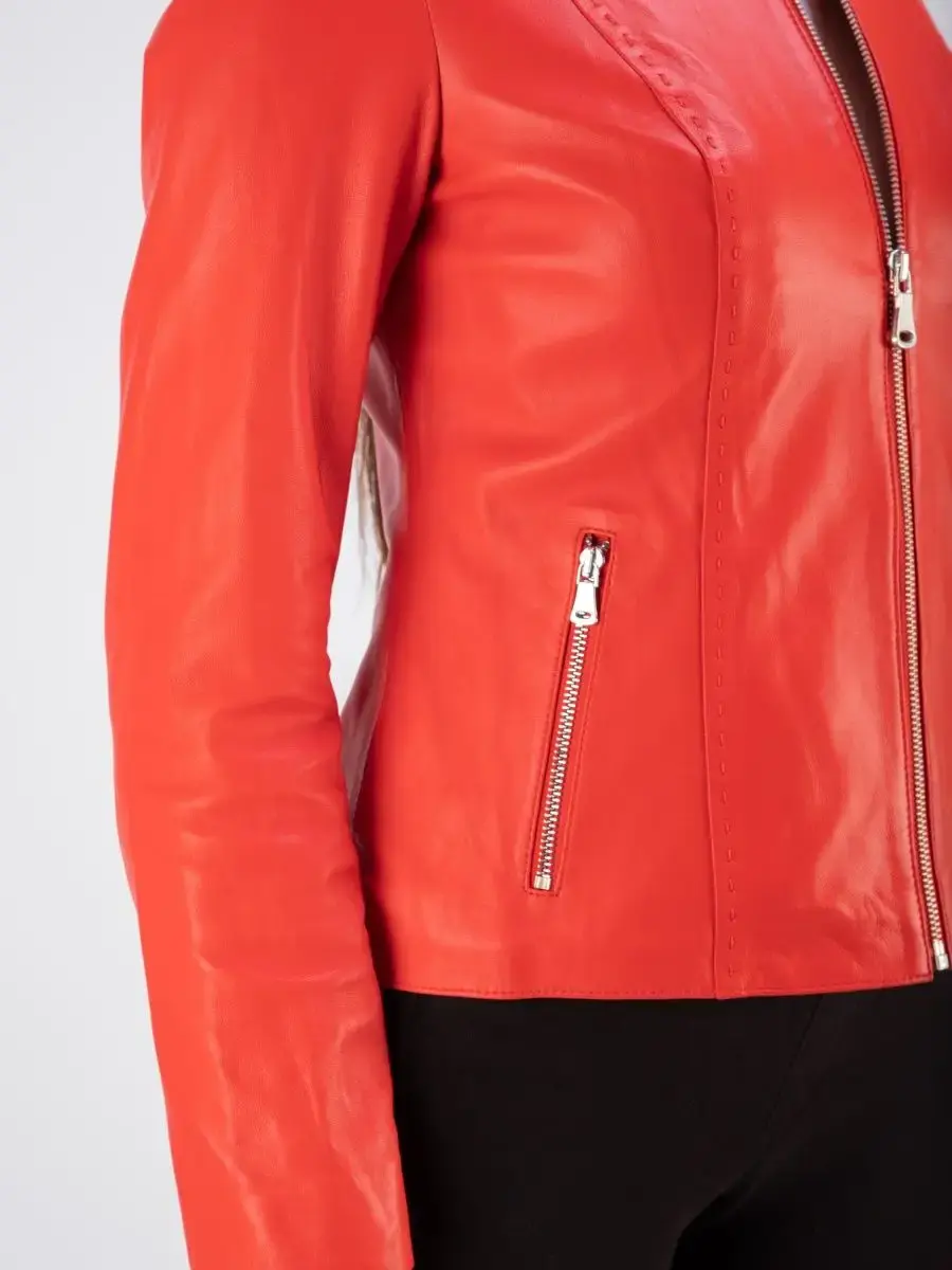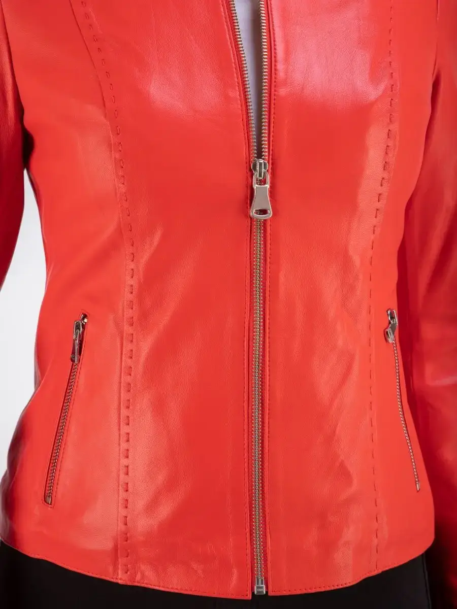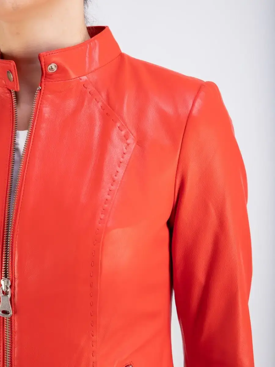 Каждая деталь этой кожаной куртки выполнена с особым вниманием к качеству материалов. Куртка женская весна - осень имеет длину по спинке 55см. Классический воротник стойка с кнопкой, гладкая кожа, фурнитура придают куртке уникальность и изысканность, идеально впишется в любой стиль и дополнит образ женщины или девочки, независимо от возраста.