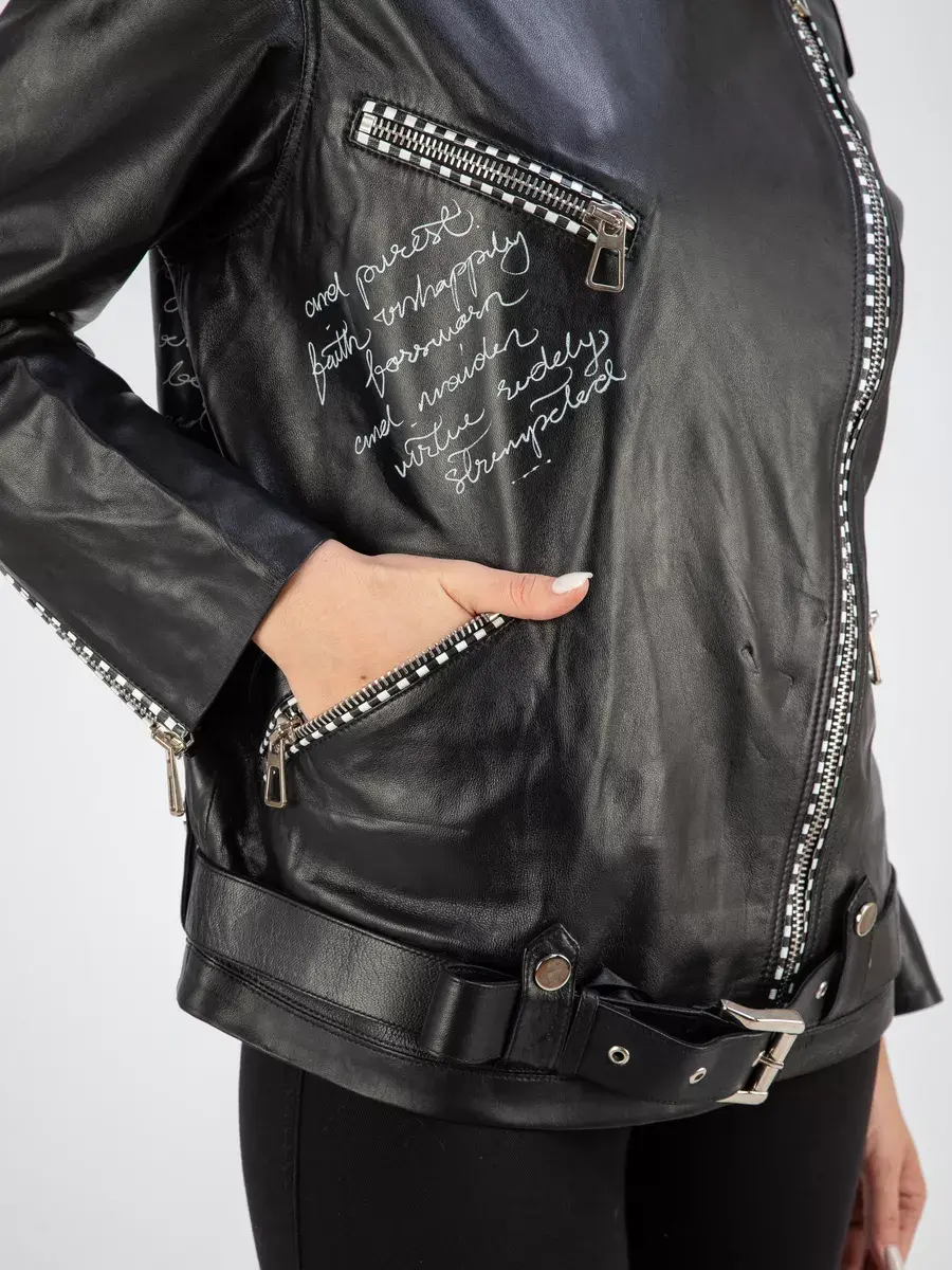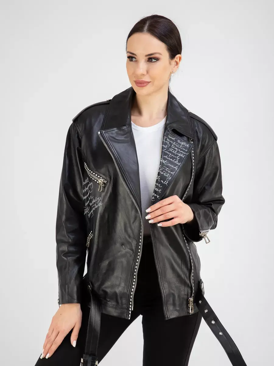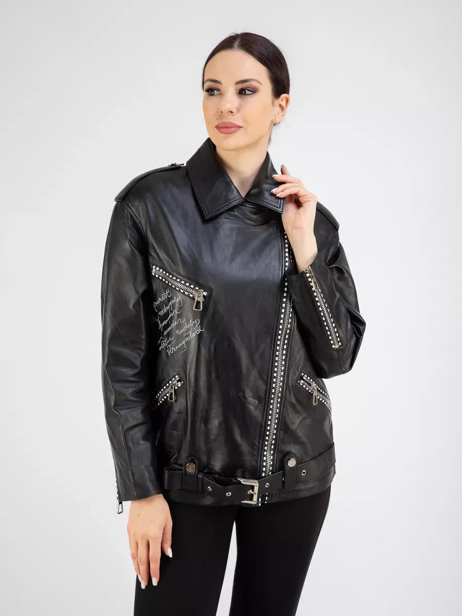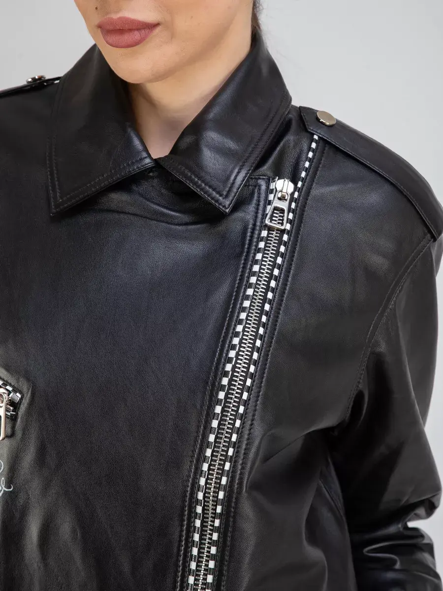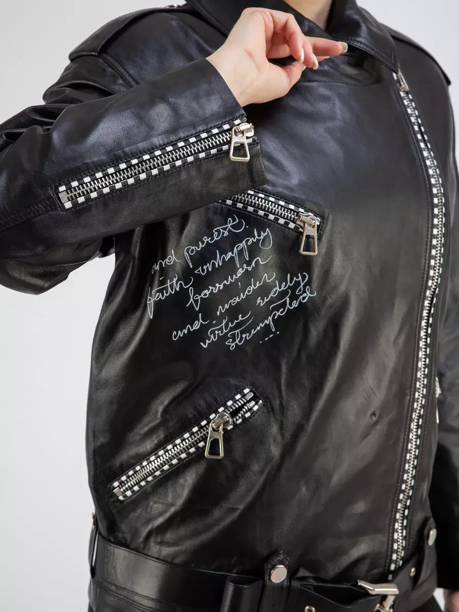 Эксклюзивная укороченная модель свободного кроя и прямого силуэта имеет отложной английский воротник, косую застежку на замке с молнией и пояс внизу. Косуха женская с необычным дизайном украшена принтами в виде красивой надписи и крупными молниями на карманах. Куртка с длинными рукавами имеет декоративные погоны, спущенную линию плеч, а на манжетах рукавов распложены застежки - молнии. Этот брендовый предмет женского гардероба - стильный тренд с элементами вечной классики, подходит и взрослым модницам, и подросткам. В коллекции вы сможете найти большой выбор размеров: от маленьких до плюс - сайз (plus - size), что делает кожанку доступной для красоток любого роста и типа фигуры - высоких и невысоких, худых и полных. Молодежная кожаная куртка классического черного цвета станет отличным дополнением для любого образа и будет гармонично смотреться с разными предметами гардероба. Она подойдет и для неформальных луков в спортивном или кэжуал (casual) - стиле, и для повседневных образов на работу и в школу.