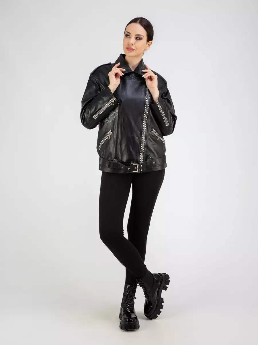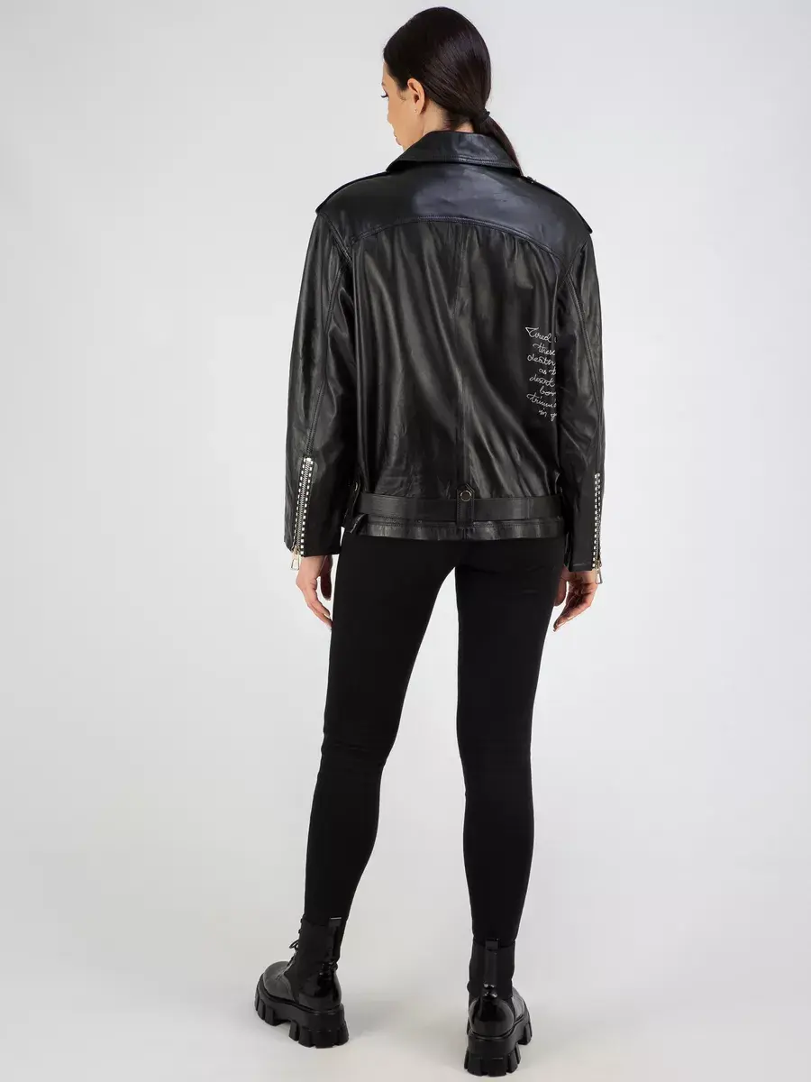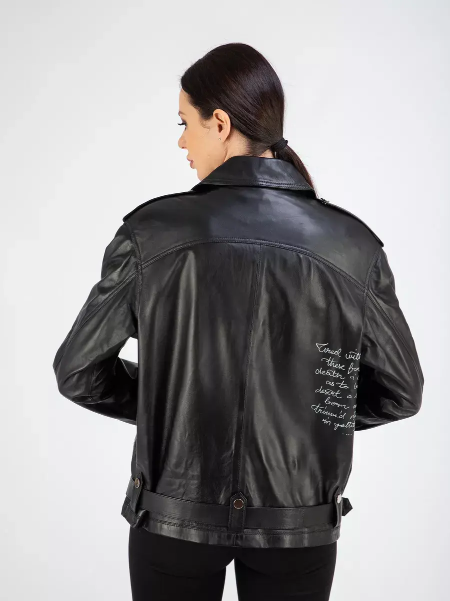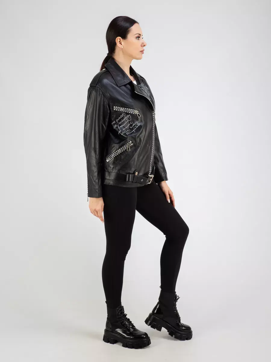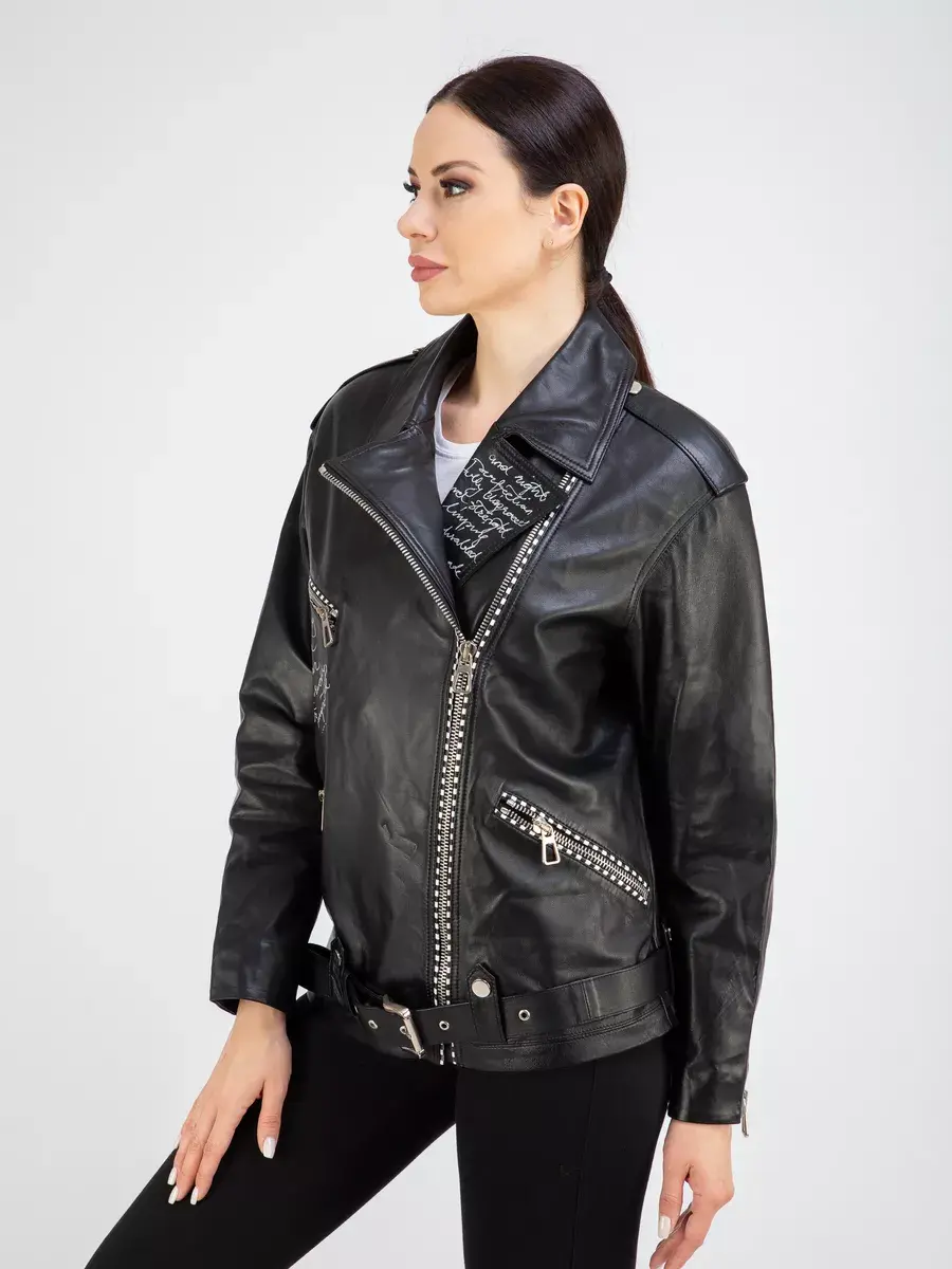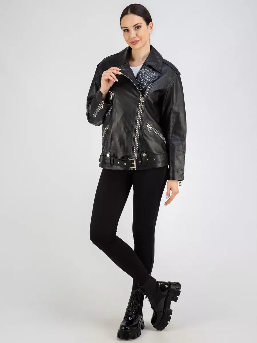 Эксклюзивная укороченная модель свободного кроя и прямого силуэта имеет отложной английский воротник, косую застежку на замке с молнией и пояс внизу. Косуха женская с необычным дизайном украшена принтами в виде красивой надписи и крупными молниями на карманах. Куртка с длинными рукавами имеет декоративные погоны, спущенную линию плеч, а на манжетах рукавов распложены застежки - молнии. Этот брендовый предмет женского гардероба - стильный тренд с элементами вечной классики, подходит и взрослым модницам, и подросткам. В коллекции вы сможете найти большой выбор размеров: от маленьких до плюс - сайз (plus - size), что делает кожанку доступной для красоток любого роста и типа фигуры - высоких и невысоких, худых и полных. Молодежная кожаная куртка классического черного цвета станет отличным дополнением для любого образа и будет гармонично смотреться с разными предметами гардероба. Она подойдет и для неформальных луков в спортивном или кэжуал (casual) - стиле, и для повседневных образов на работу и в школу.