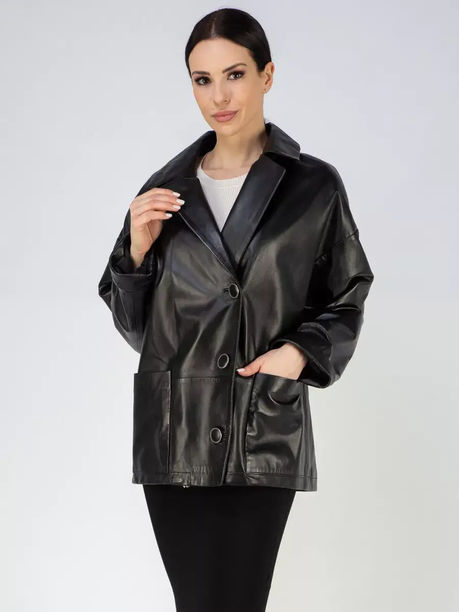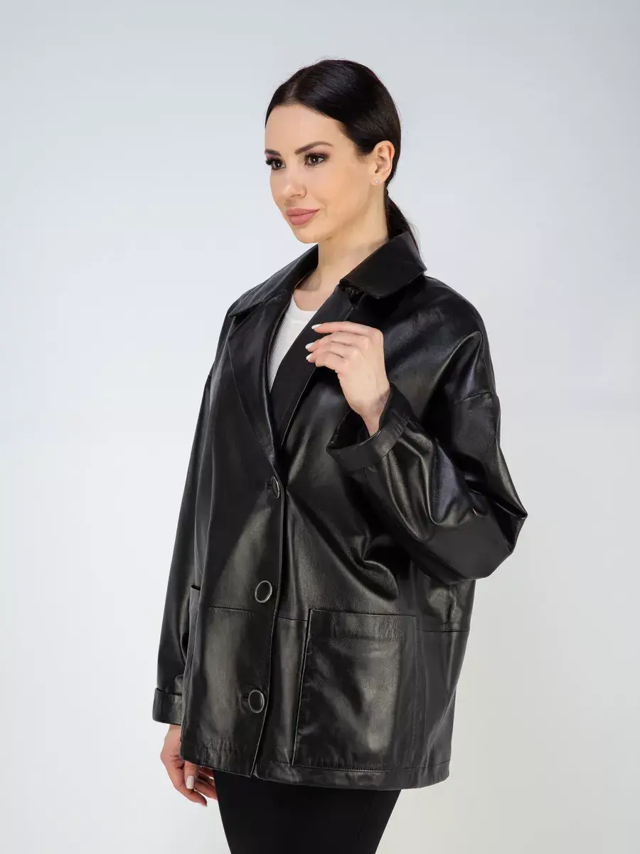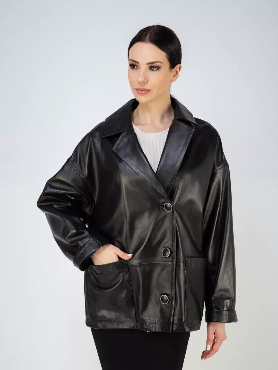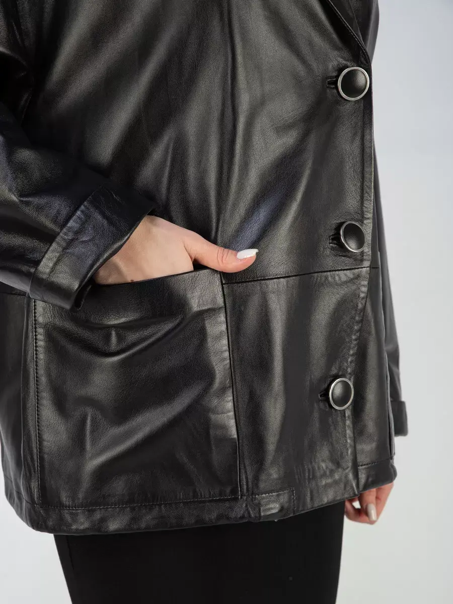 Каждая деталь этой кожаной куртки выполнена с особым вниманием к качеству материалов. Спущенная линия плеча, ровные швы и свободный - оверсайз крой делают эту женскую куртку универсальным элементом гардероба, который подходит практически под любой стиль, деловой или повседневный. Классический английский воротник добавляет изюминку образу, делая его неповторимым. Застежка на пуговицах, накладные карманы - все это приятные детали образа женственности и шарма.