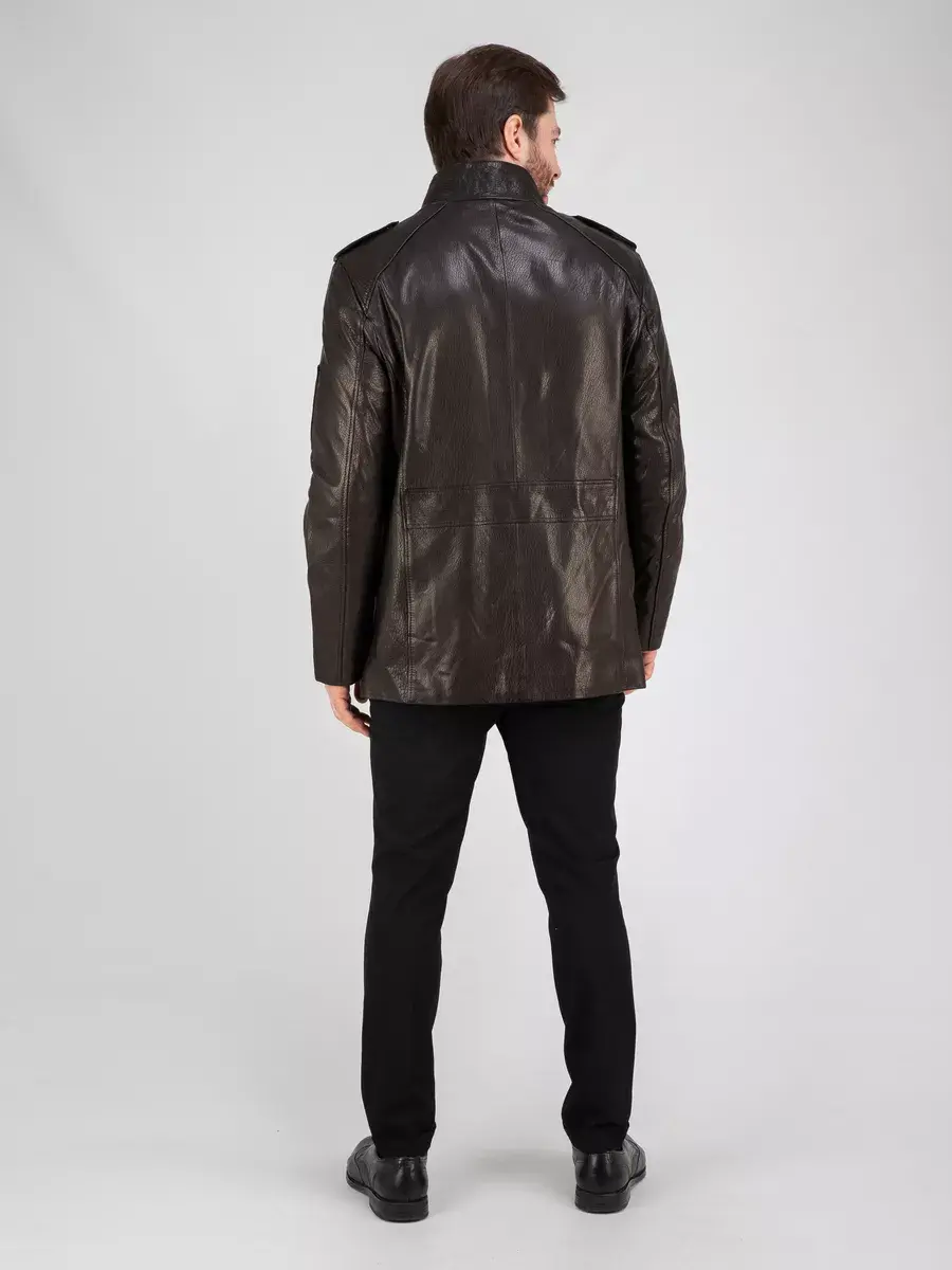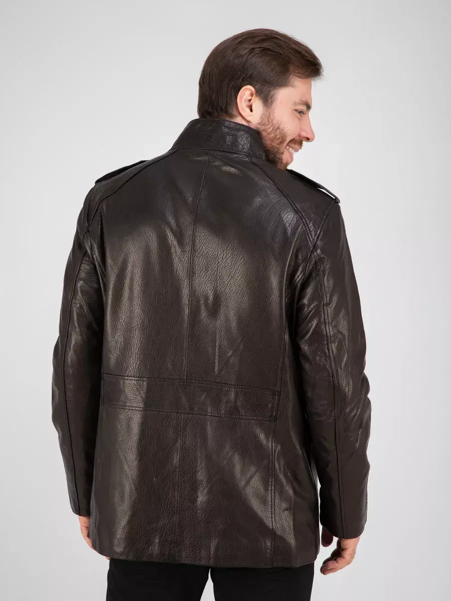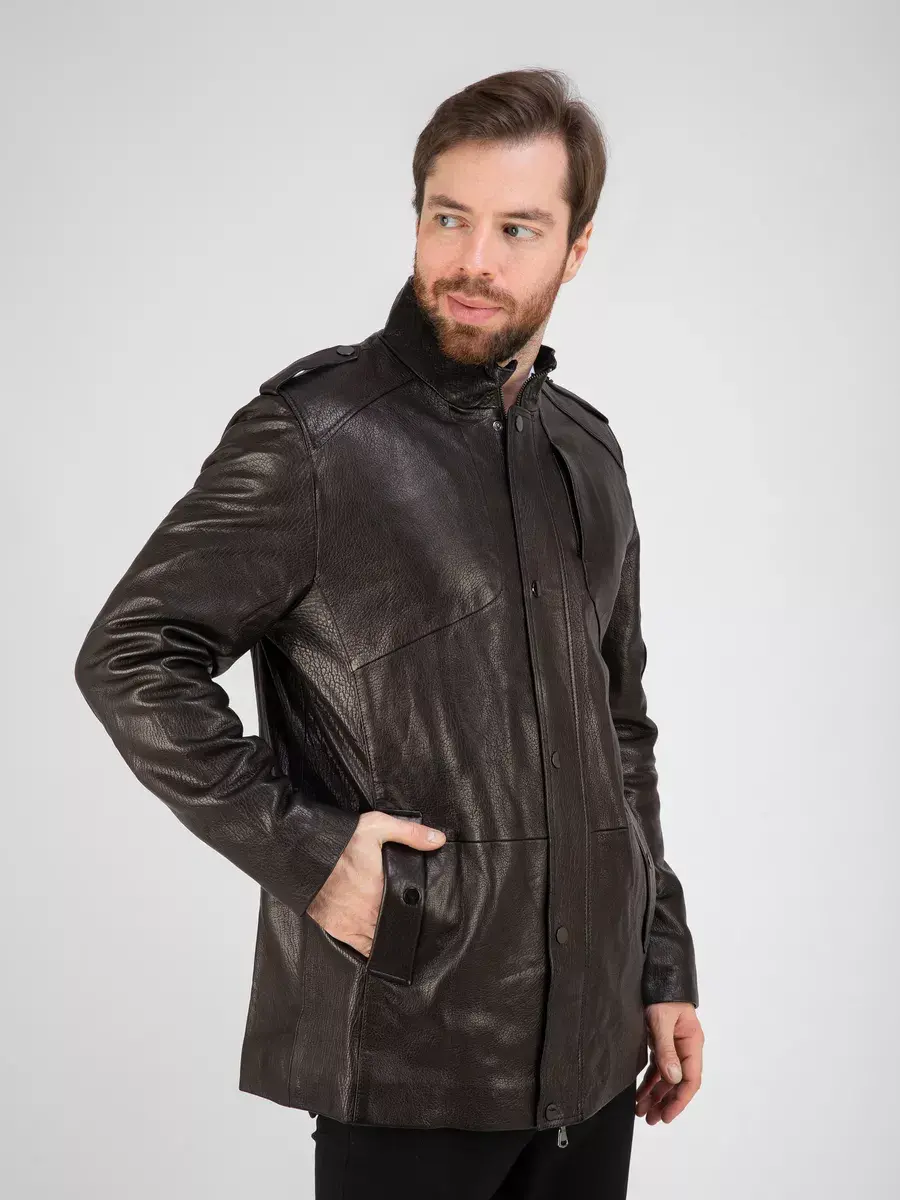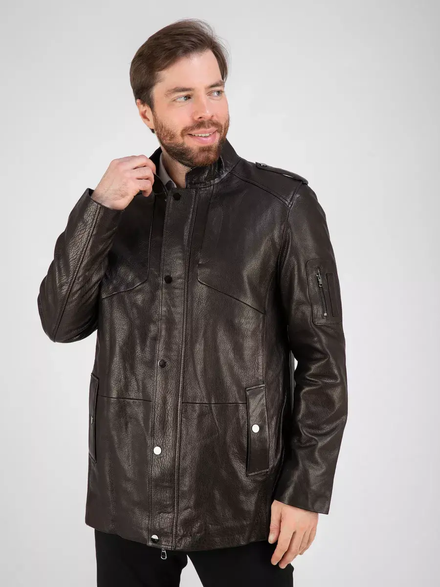 Куртка кожаная мужская имеет длину по спинке 85 см., что обеспечивает идеальное соотношение между длиной и защитой от холода, прекрасно подходить под классический стиль одежды, позволяет одевать ее поверх пиджака в прохладное лето. Стильный воротник стойка, эполеты и фактурная кожа придают куртке уникальность и изысканность, идеально впишется в деловой или повседневный стиль и дополнит солидный образ мужчины или парня подростка, независимо от возраста. Зернистое покрытие придает куртке эксклюзивный и богатый вид. Двойная застежка на молнии и на кнопках обеспечивают легкость и удобство, а прорезные карманы и два внутренних кармана дополнительно увеличивают функциональность куртки.