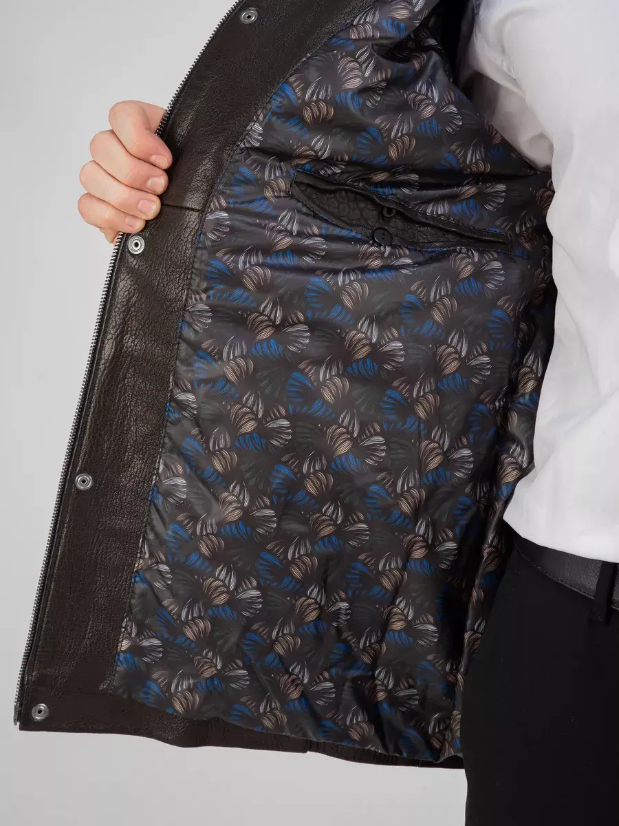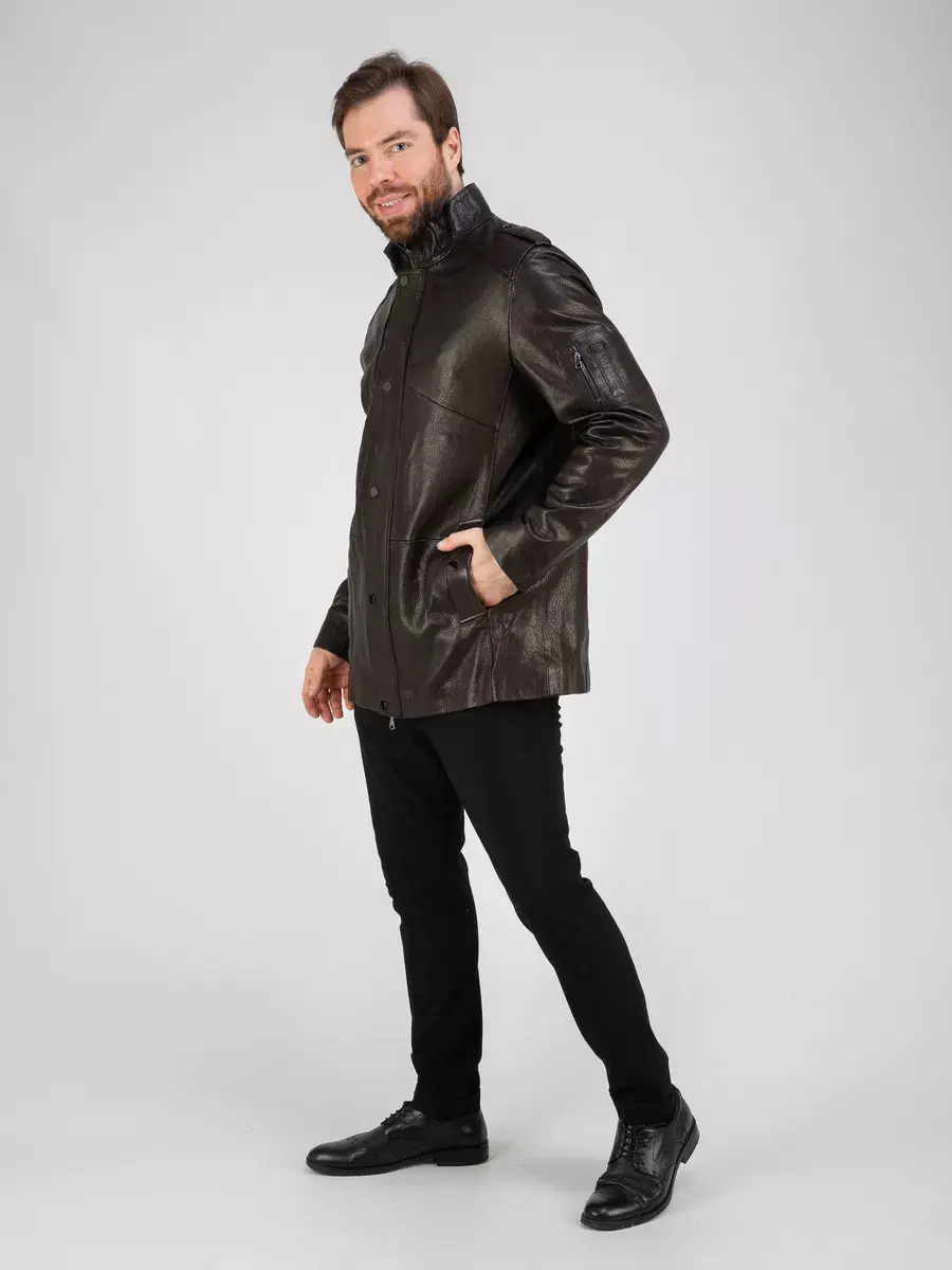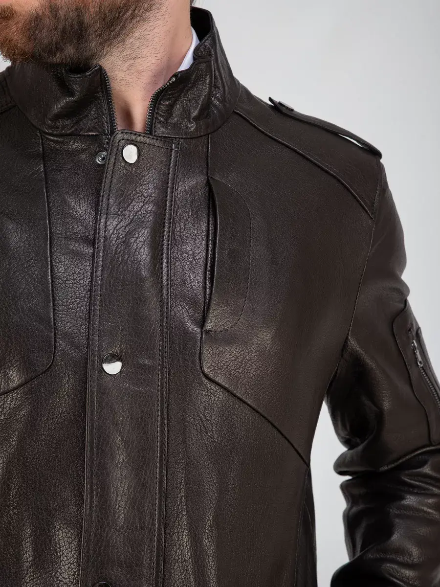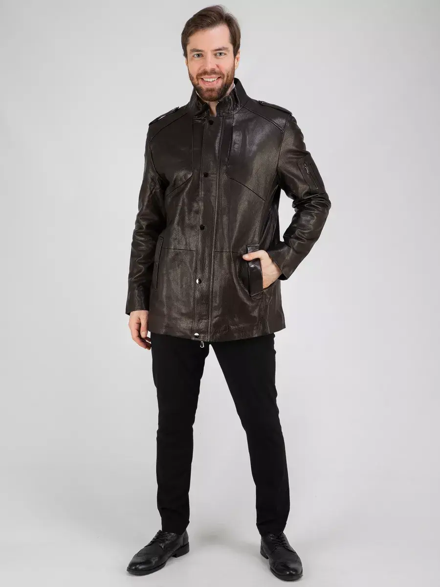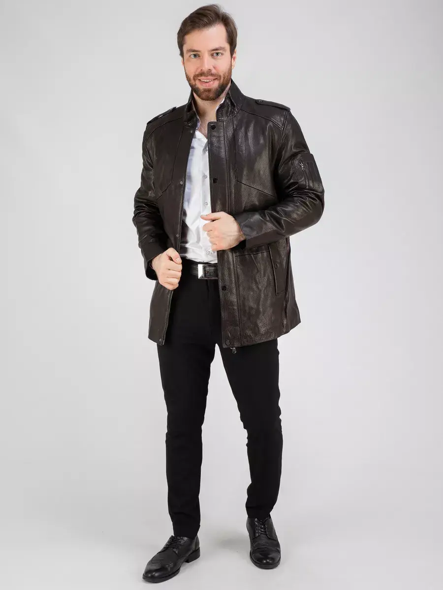Куртка кожаная мужская имеет длину по спинке 85 см., что обеспечивает идеальное соотношение между длиной и защитой от холода, прекрасно подходить под классический стиль одежды, позволяет одевать ее поверх пиджака в прохладное лето. Стильный воротник стойка, эполеты и фактурная кожа придают куртке уникальность и изысканность, идеально впишется в деловой или повседневный стиль и дополнит солидный образ мужчины или парня подростка, независимо от возраста. Зернистое покрытие придает куртке эксклюзивный и богатый вид. Двойная застежка на молнии и на кнопках обеспечивают легкость и удобство, а прорезные карманы и два внутренних кармана дополнительно увеличивают функциональность куртки.
