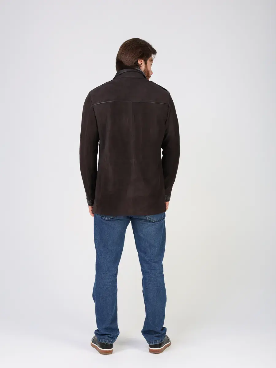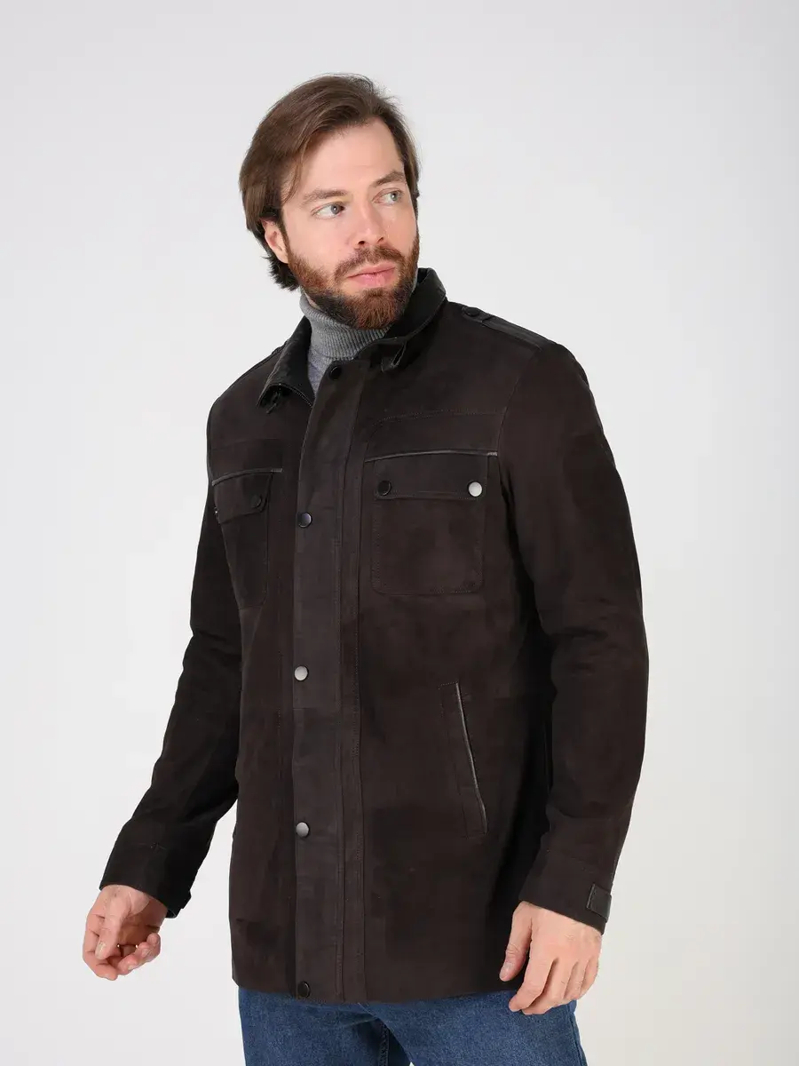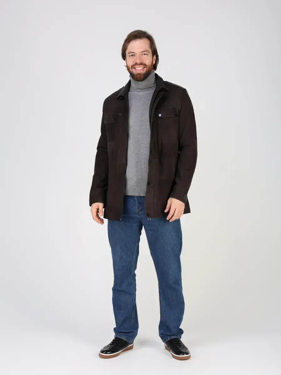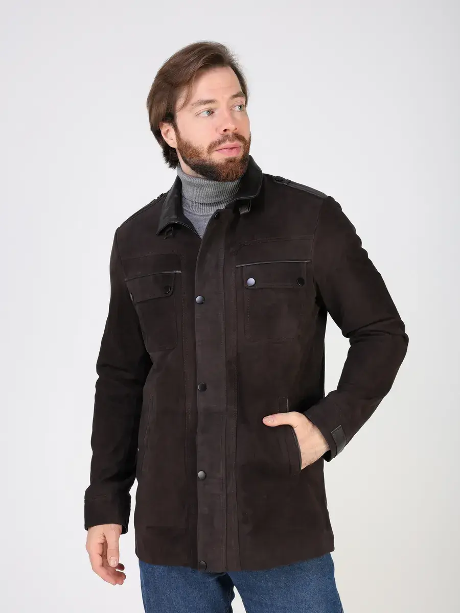 Куртка кожаная мужская имеет длину по спинке 84 см., что обеспечивает идеальное соотношение между длиной и защитой от холода, прекрасно подходить под классический стиль одежды, позволяет одевать ее поверх пиджака и рубашки, идеально впишется в деловой или повседневный стиль и дополнит солидный образ мужчины или парня подростка летом или осенью. Замша в коричневом цвете и кожаные вставки придают куртке - пальто эксклюзивный и богатый вид. Эта модель лучше, чем любая джинсовая или текстильная куртка благодаря своей эксклюзивности и высокому качеству материала.