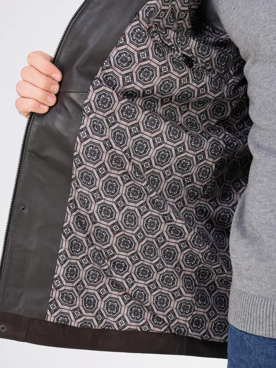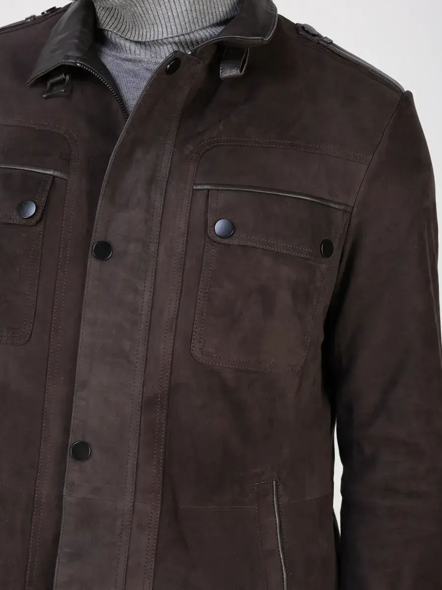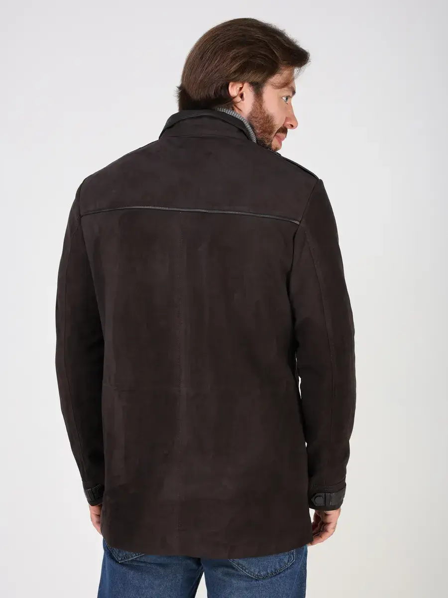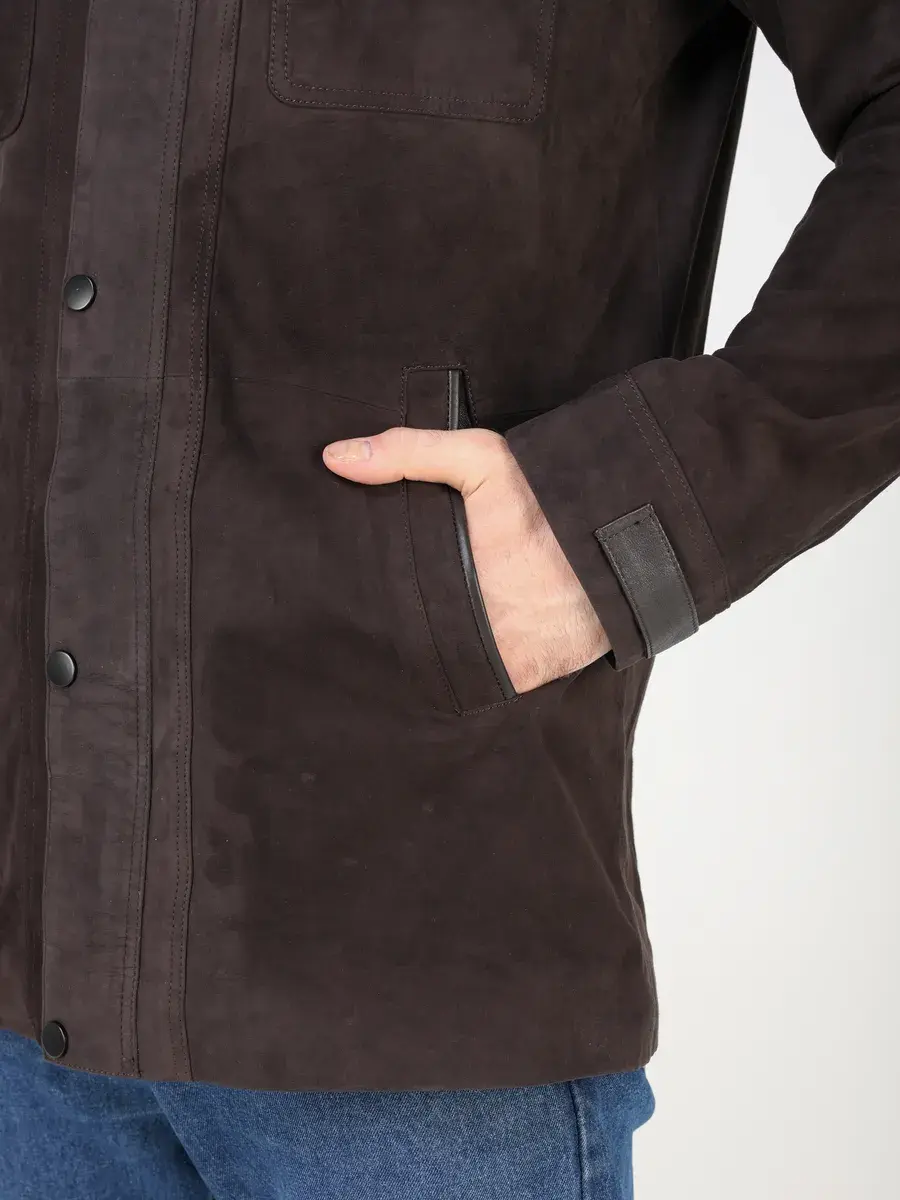 Куртка кожаная мужская имеет длину по спинке 84 см., что обеспечивает идеальное соотношение между длиной и защитой от холода, прекрасно подходить под классический стиль одежды, позволяет одевать ее поверх пиджака и рубашки, идеально впишется в деловой или повседневный стиль и дополнит солидный образ мужчины или парня подростка летом или осенью. Замша в коричневом цвете и кожаные вставки придают куртке - пальто эксклюзивный и богатый вид. Эта модель лучше, чем любая джинсовая или текстильная куртка благодаря своей эксклюзивности и высокому качеству материала.