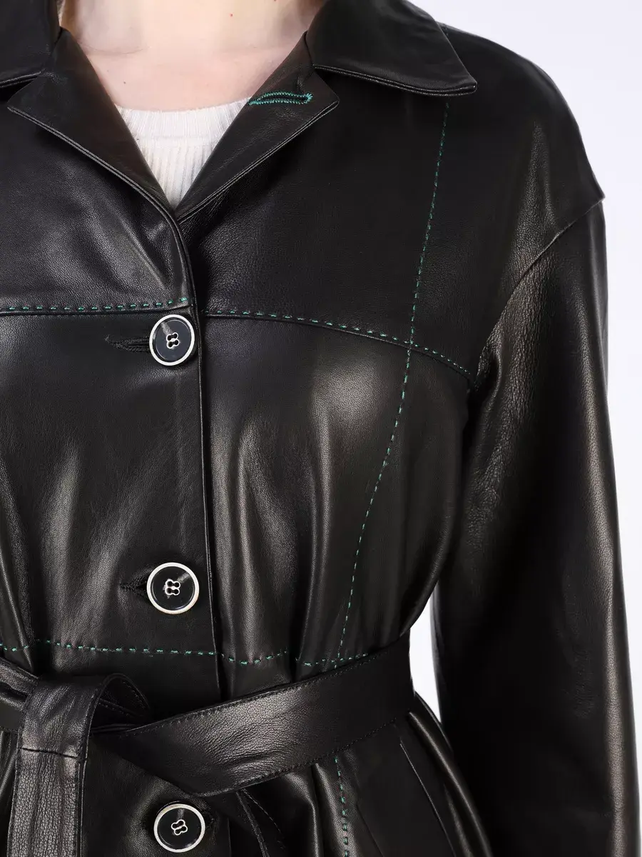 Каждая деталь этой кожаной куртки выполнена с особым вниманием к качеству материалов. Прямой - свободный крой и спущенная линия плеча позволяет чувствовать себя комфортно в любой ситуации. Кожаный ремень, хлястики на рукаве и декоративная строчка добавляют уникальности этому предмету верхней одежды. Застежка на пуговицах обеспечивает надежную защиту от ветра, а прорезные карманы делают куртку практичной.