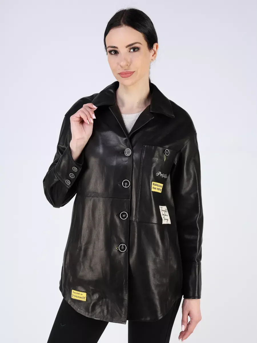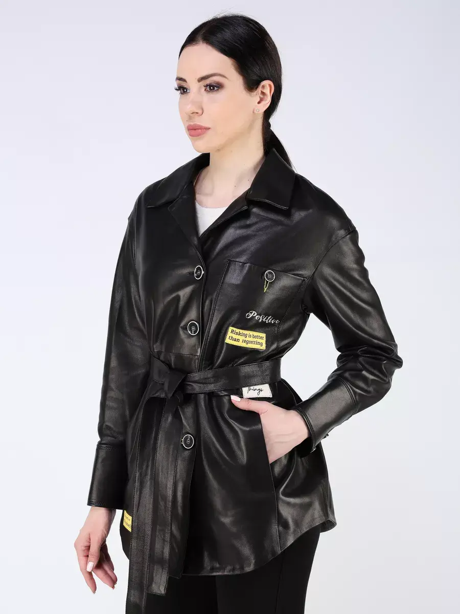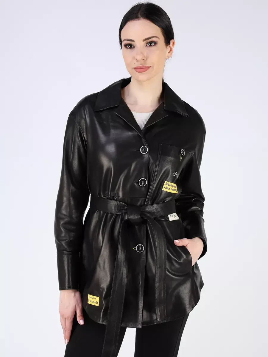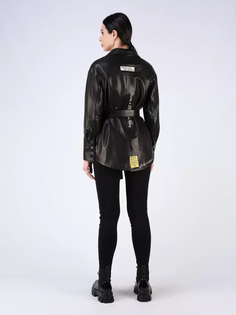 Каждая деталь этой кожаной куртки, рубашки из кожи выполнена с особым вниманием к качеству материалов. Изысканный материал, ровные швы, спущенная линия плеча, прорезные карманы, асимметричная подол и фурнитура, пуговицы и вставки добавляют акценты стиля и функциональности, делают эту женскую куртку универсальным элементом гардероба, который подходит практически под любой стиль, деловой или повседневный. Классический воротник, шлица и кожаный пояс обеспечивает неповторимый вид, а манжеты на пуговицах и вышивка дополняют оригинальный стиль.