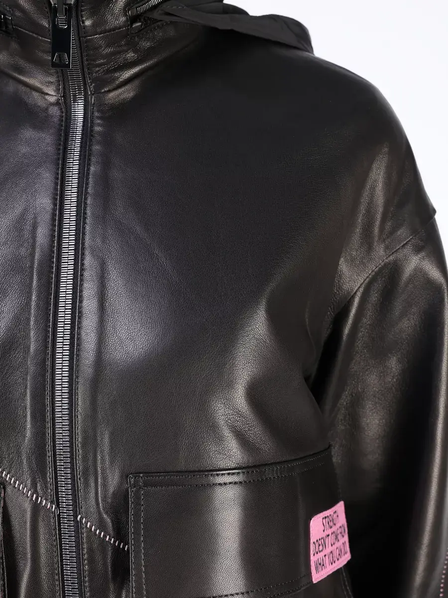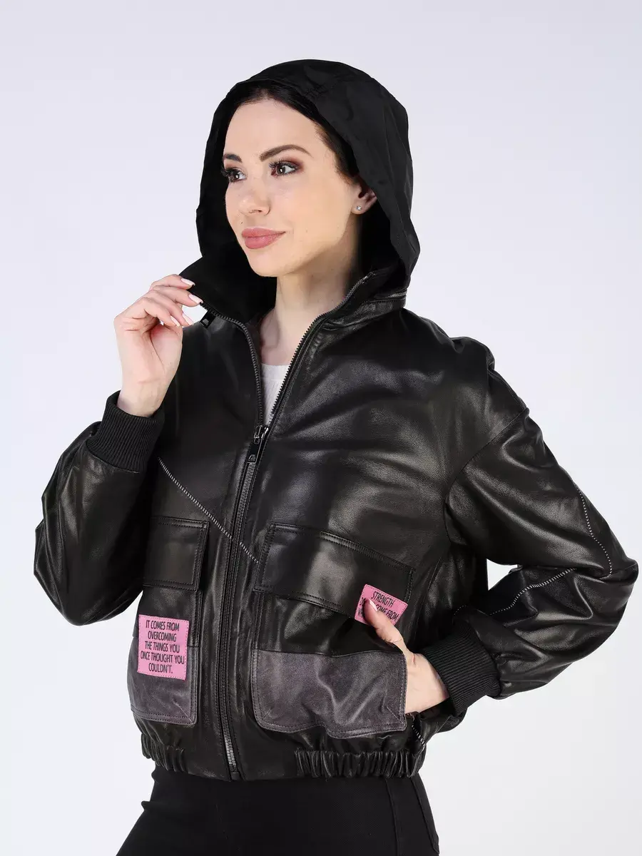 Эксклюзивная кожаная куртка женская осень - весна с скрытим текстильным капюшоном из натуральной кожи ягненка - настоящая находка для стильных женщин, стремящихся выглядеть безупречно в любое время. Женская куртка весенняя и осенняя изготовлена из высококачественной натуральной кожи выделки плонже - кожа молодых овец, которая применяется для создания эксклюзивных модных коллекций. Кожа гладкая и очень прочная, легкая и надежная.