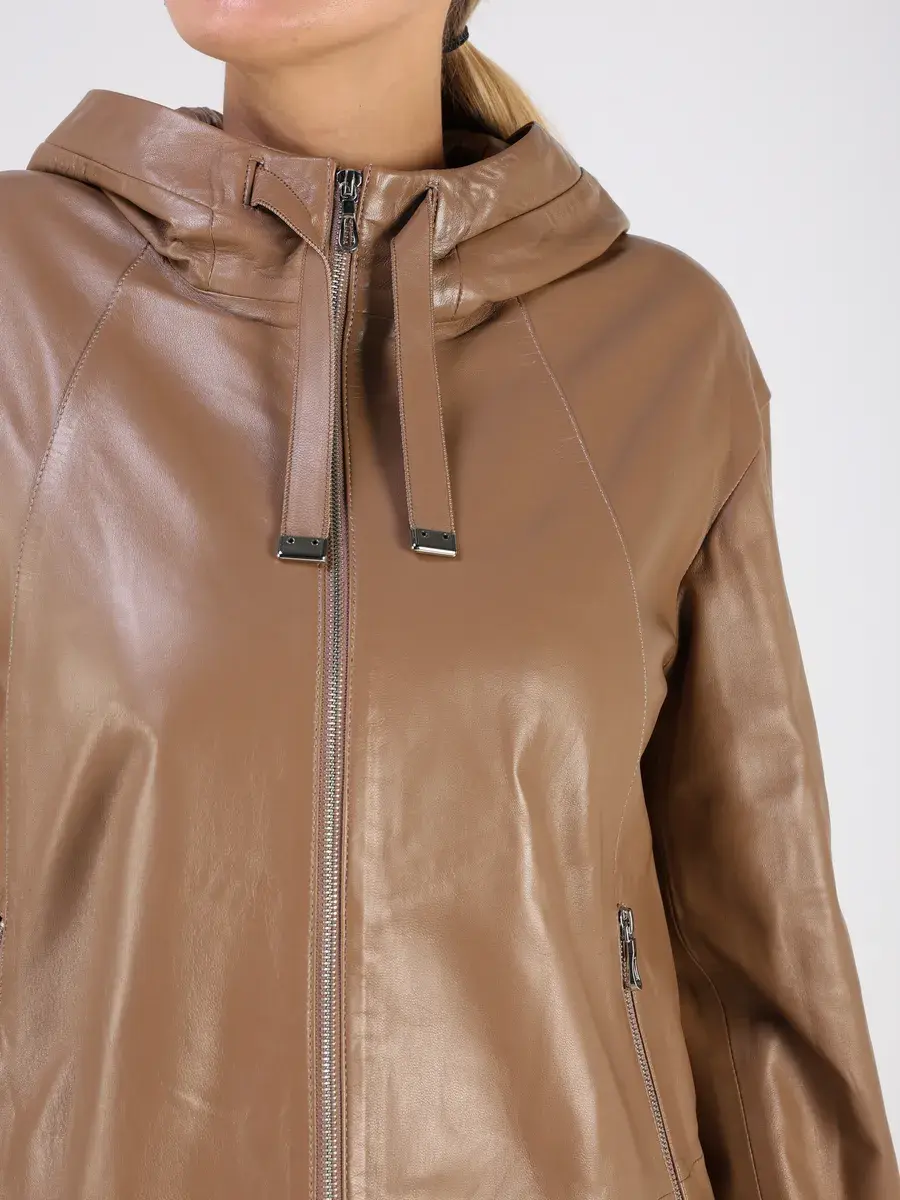 Стильная куртка демисезонная женская от MONDIAL из натуральной кожи станет незаменимым элементом вашего гардероба, обеспечит комфорт и защиту от ветра в прохладную погоду осенью и весной. Кожаная куртка осенняя женская с капюшоном выполнена из кожи ягнёнка, которая отличается высокой прочностью и долговечностью, сохраняя при этом свою мягкость и эластичность.