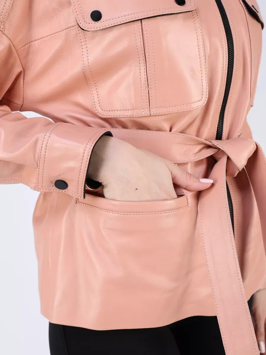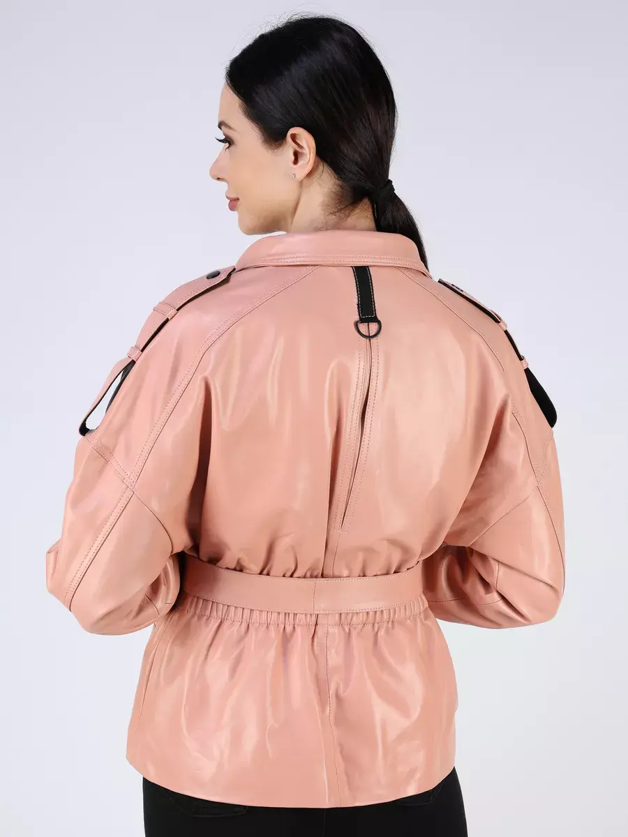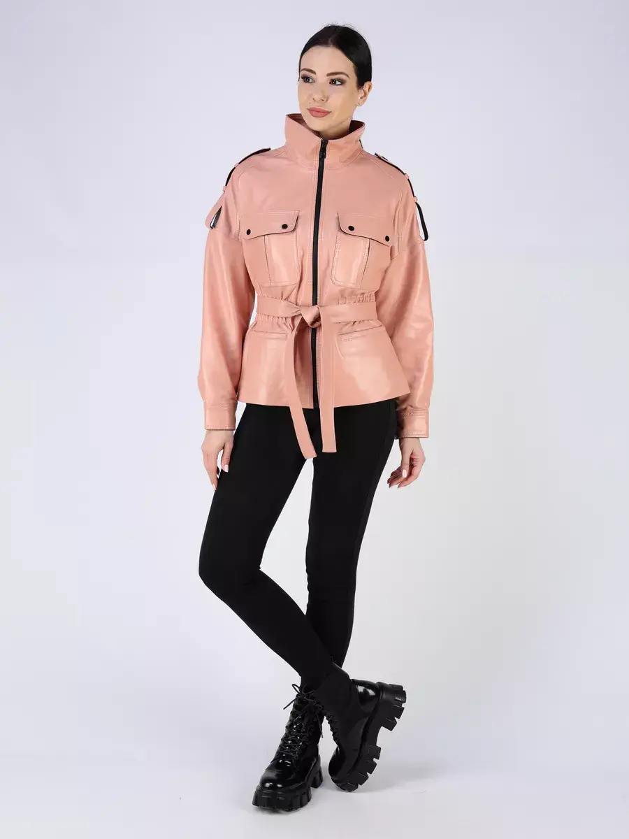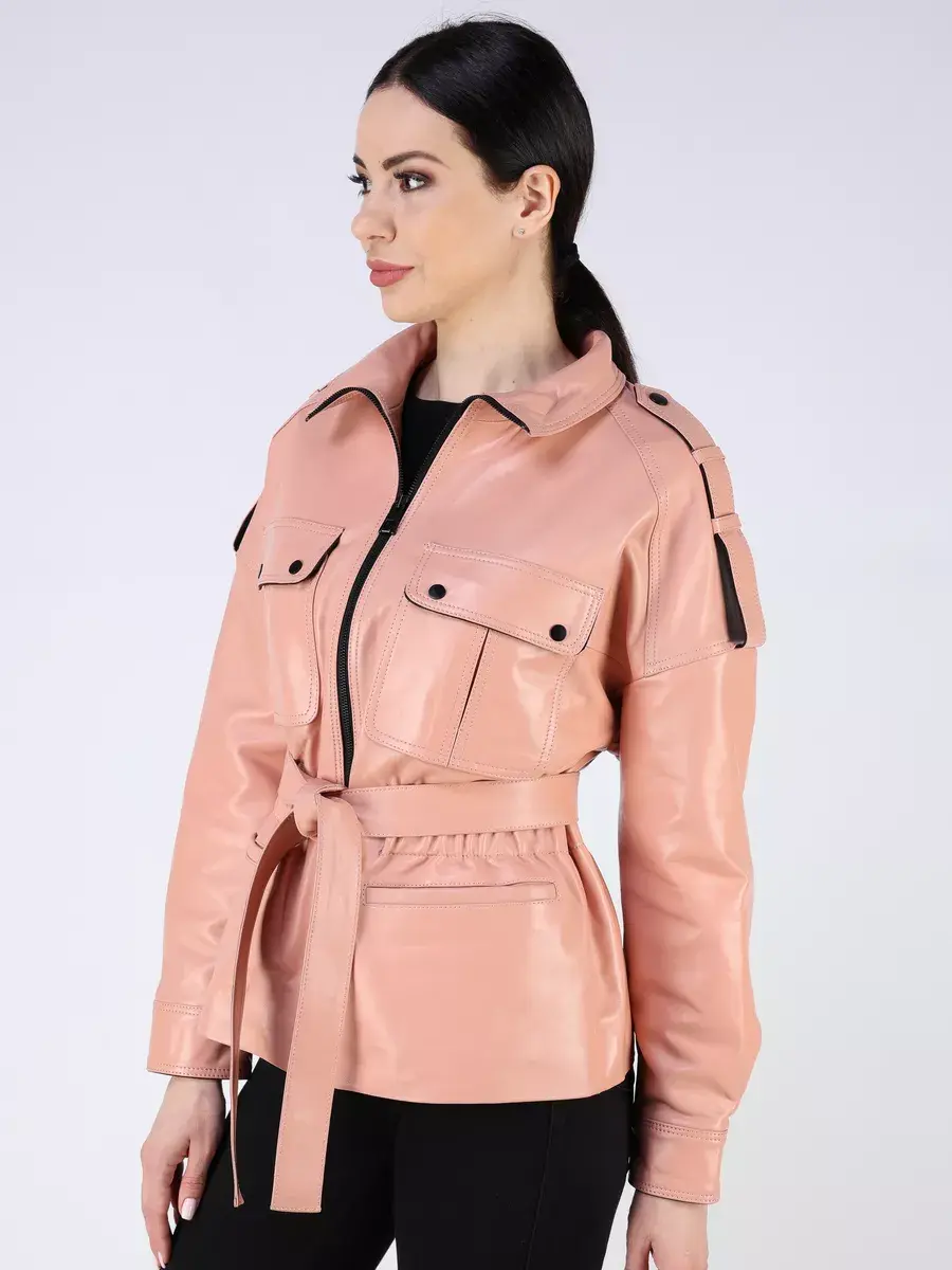Каждая деталь этой кожаной куртки выполнена с особым вниманием к качеству материалов. Изысканный материал, ровные швы, спущенная линия плеча с модными эполетами, прорезные и накладные карманы, застежка на молнии и фурнитура добавляют акценты стиля и функциональности, делают эту короткую женскую куртку стильным элементом гардероба, который подходит практически под любой стиль, деловой или повседневный. Высокий воротник стойка и кожаный пояс обеспечивает неповторимый вид, а манжеты на кнопках дополняют оригинальный стиль.