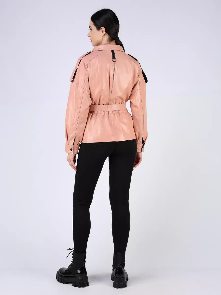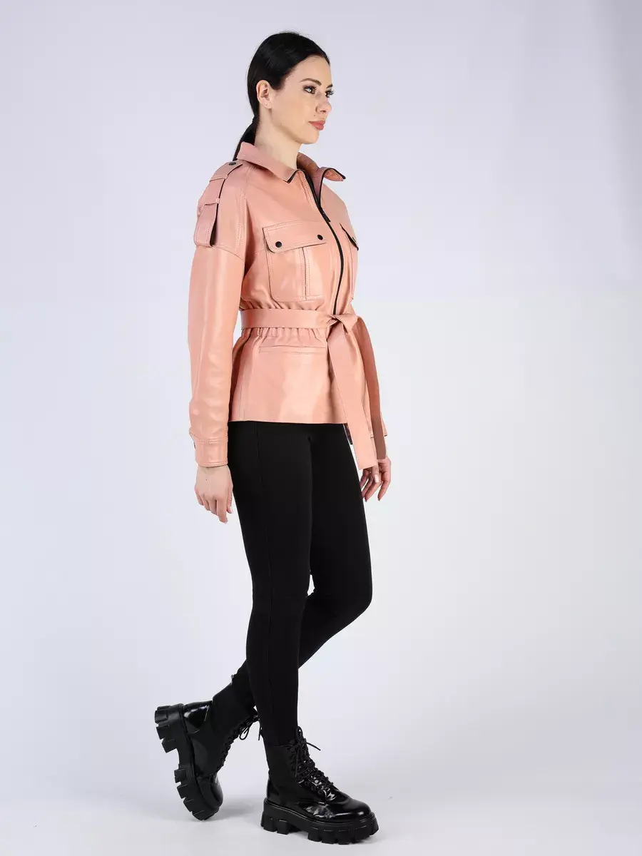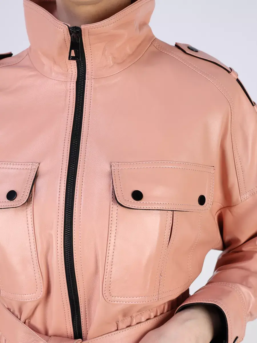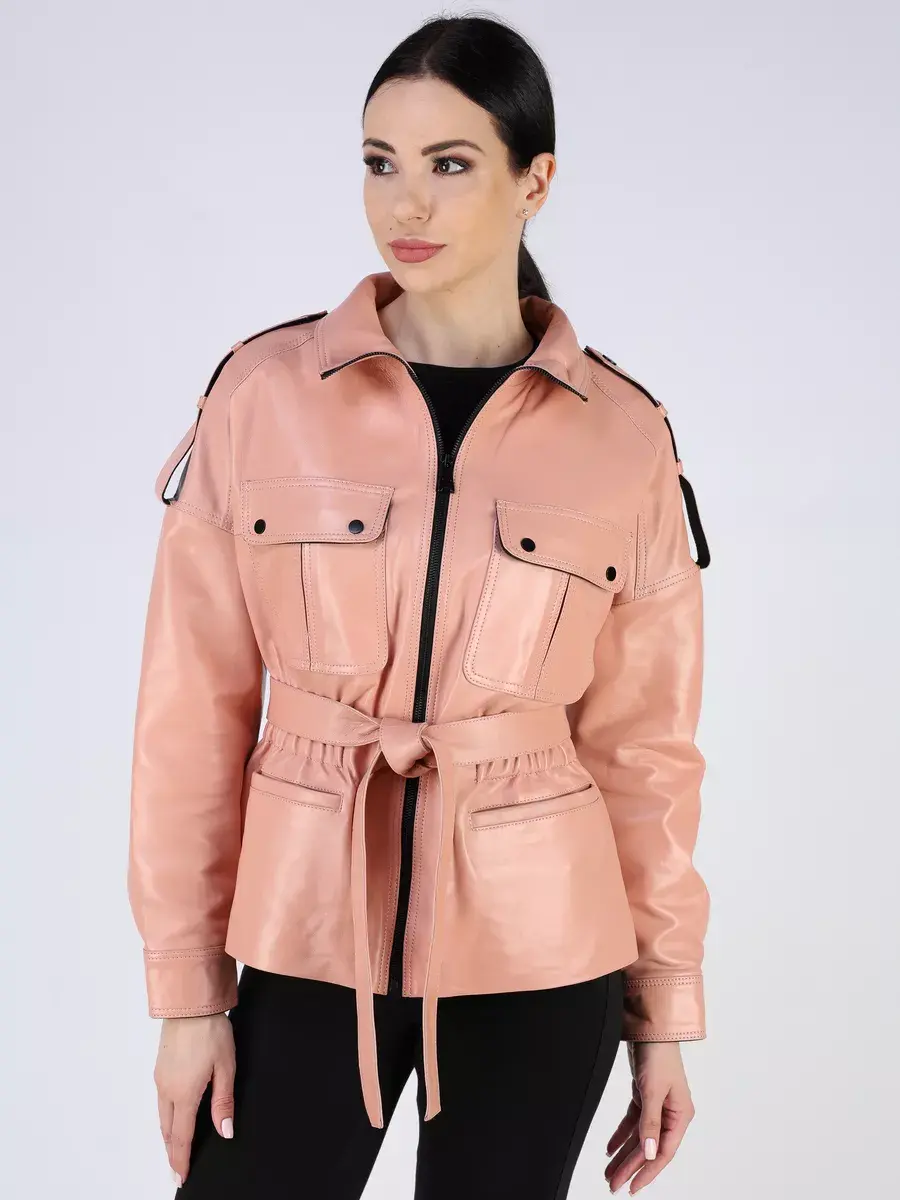 Каждая деталь этой кожаной куртки выполнена с особым вниманием к качеству материалов. Изысканный материал, ровные швы, спущенная линия плеча с модными эполетами, прорезные и накладные карманы, застежка на молнии и фурнитура добавляют акценты стиля и функциональности, делают эту короткую женскую куртку стильным элементом гардероба, который подходит практически под любой стиль, деловой или повседневный. Высокий воротник стойка и кожаный пояс обеспечивает неповторимый вид, а манжеты на кнопках дополняют оригинальный стиль.