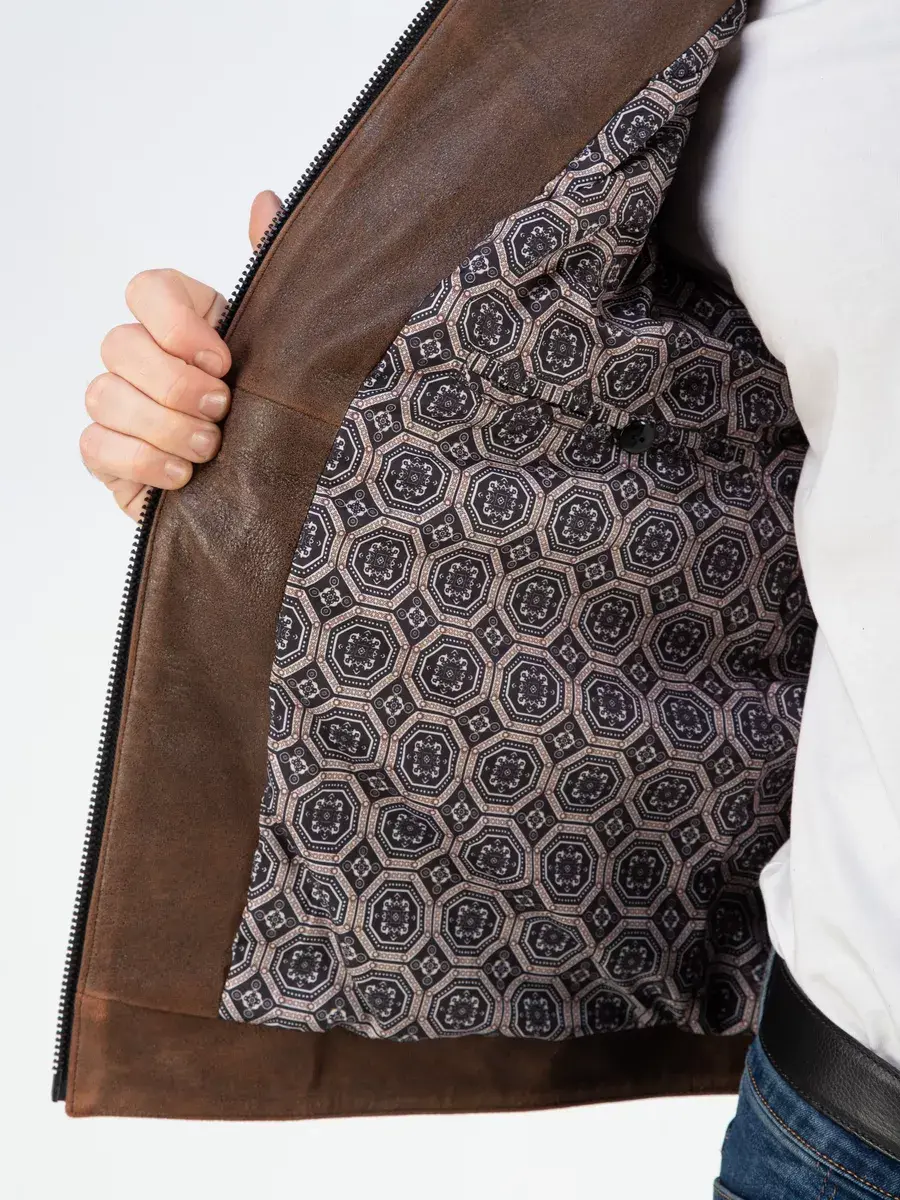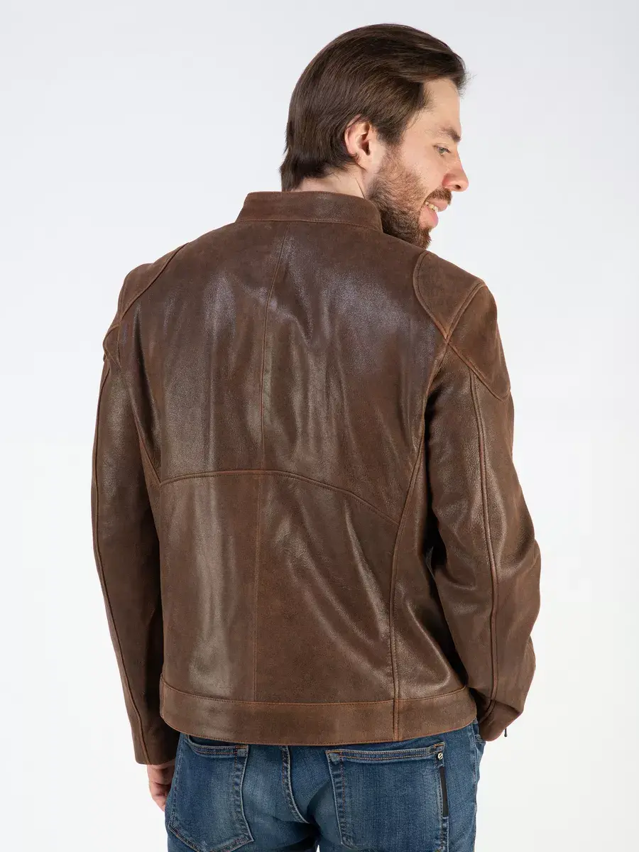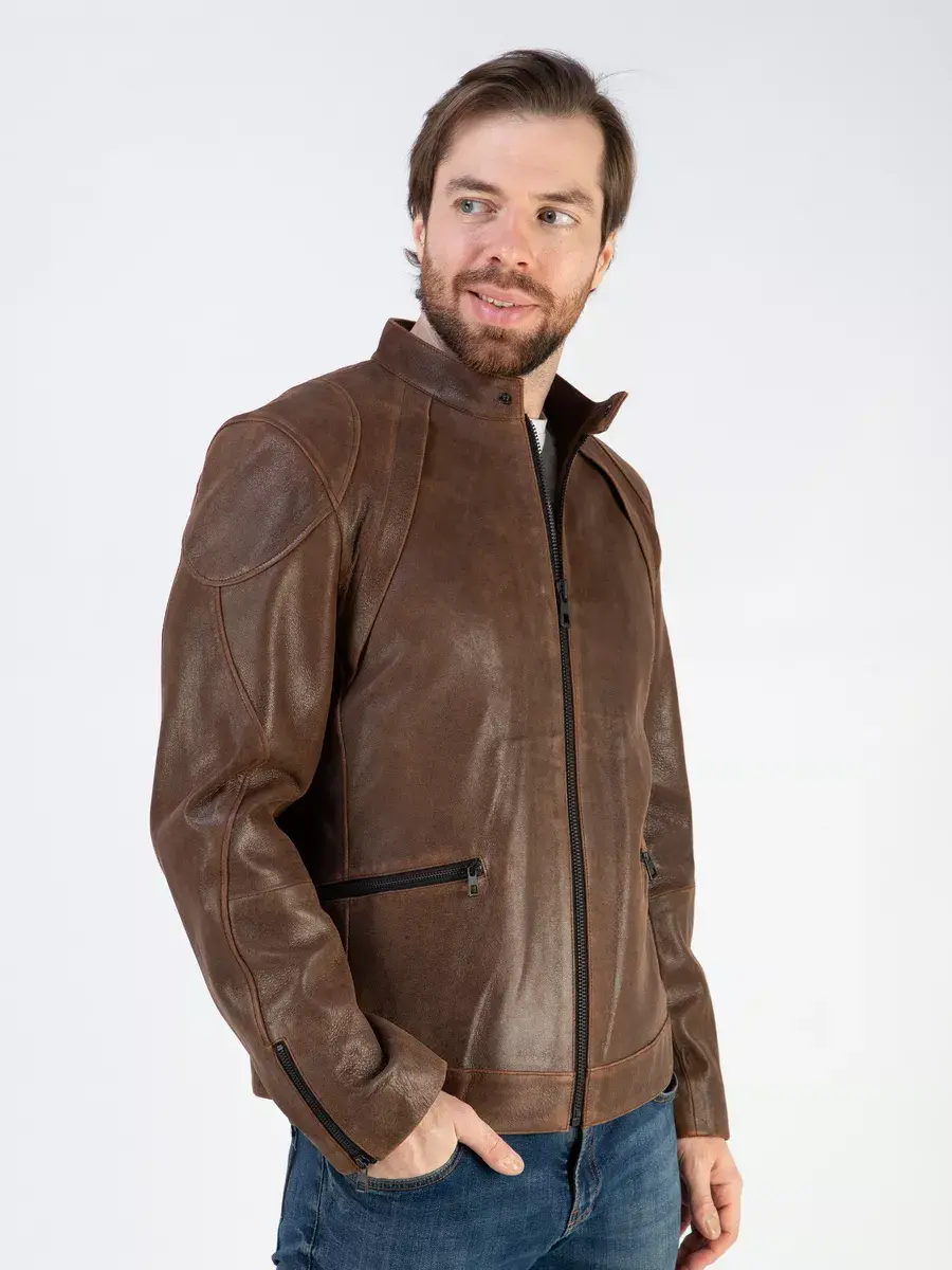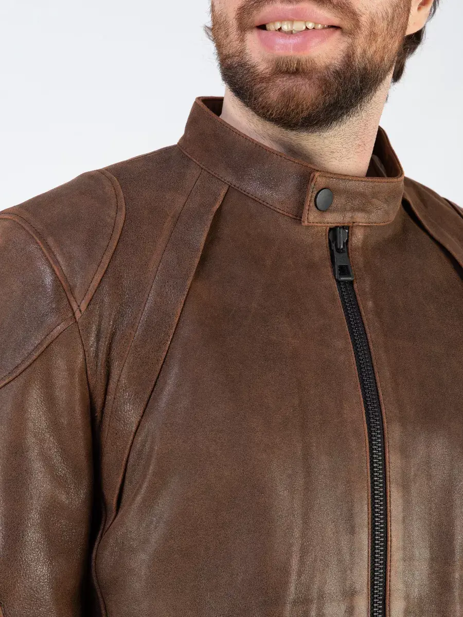 Мужская куртка спортивная кожаная изготовлена из высококачественной натуральной кожи ягненка выделки нуплин, то же, что и крэк, но поверхность менее шероховатая (с винтаж-эффектом) - с эффектом старения и потертости. Кожа со специальной обработкой, благодаря которой изделие выглядит состаренным.