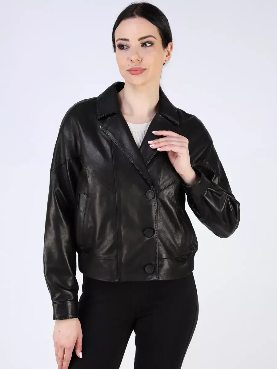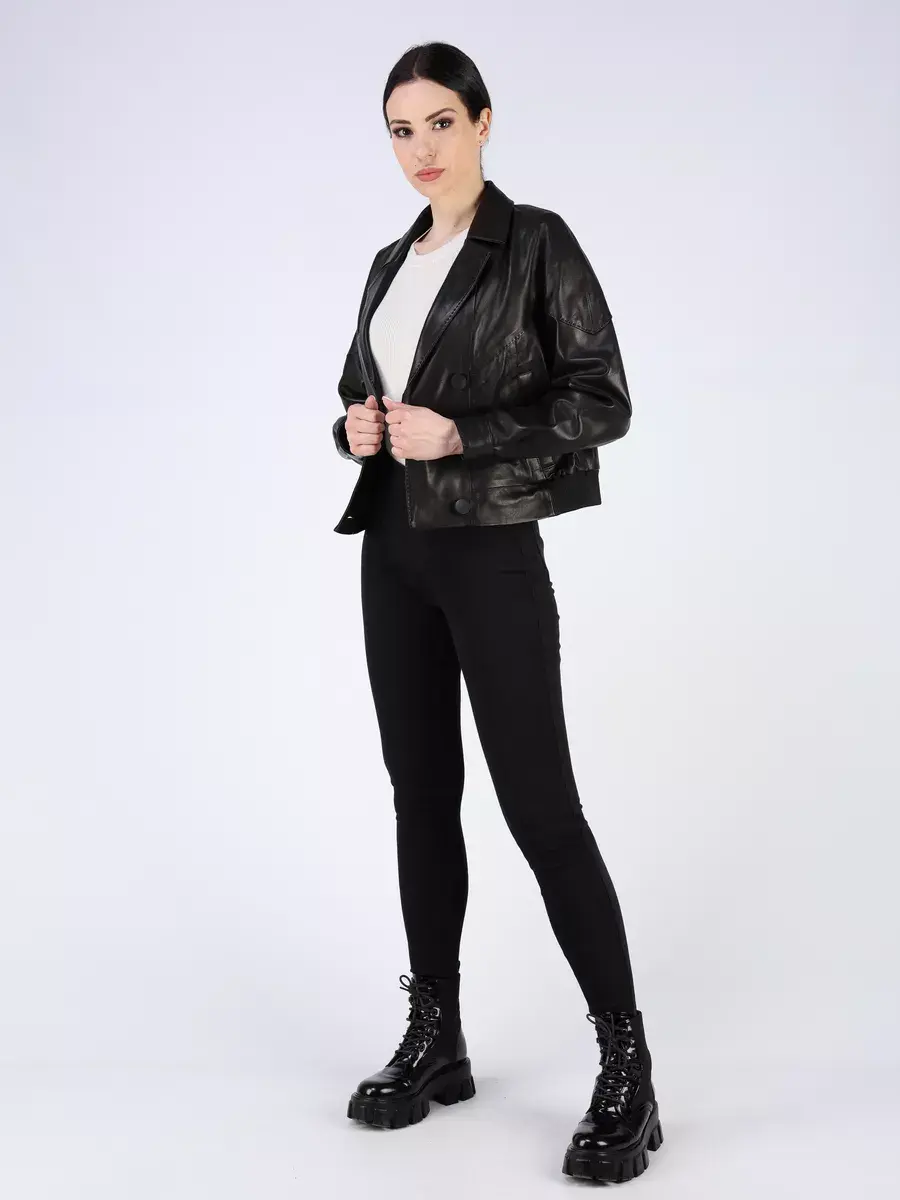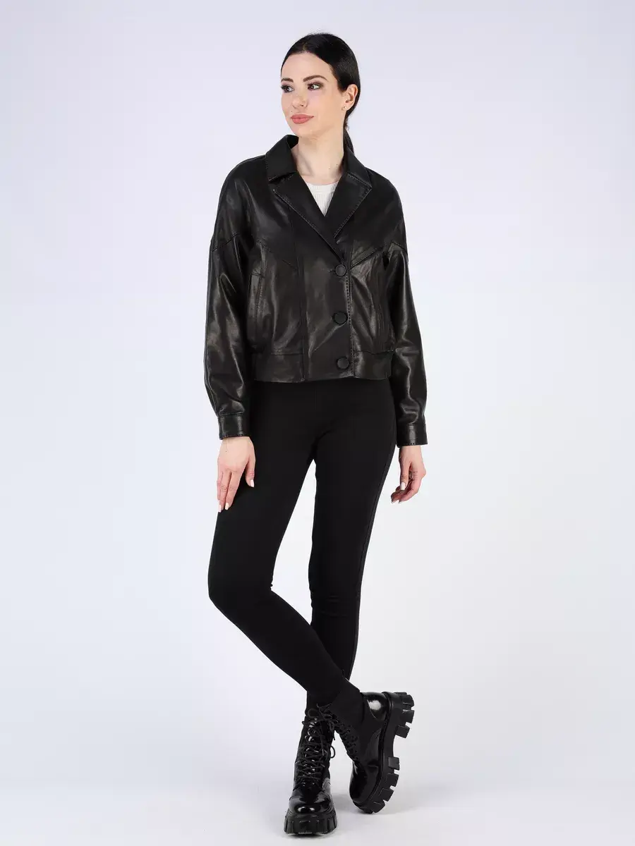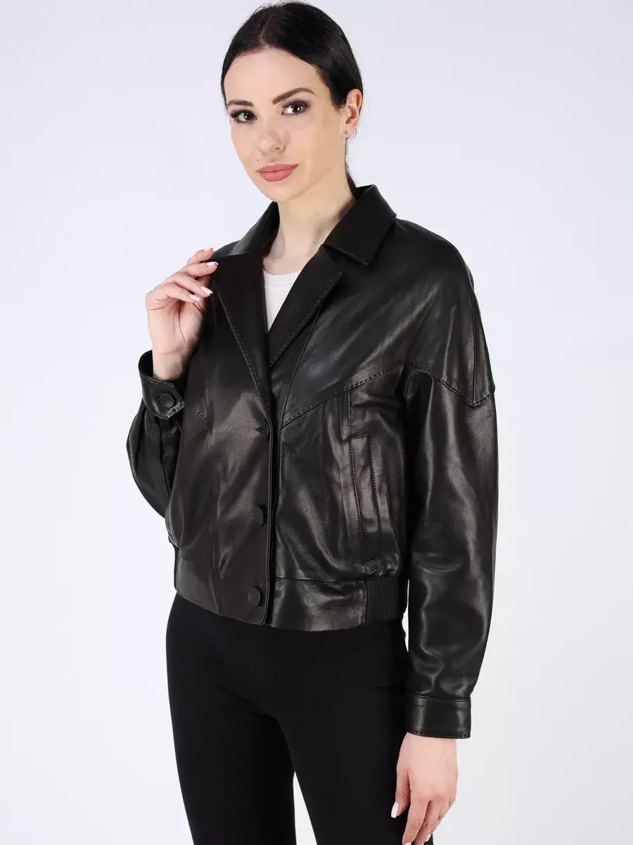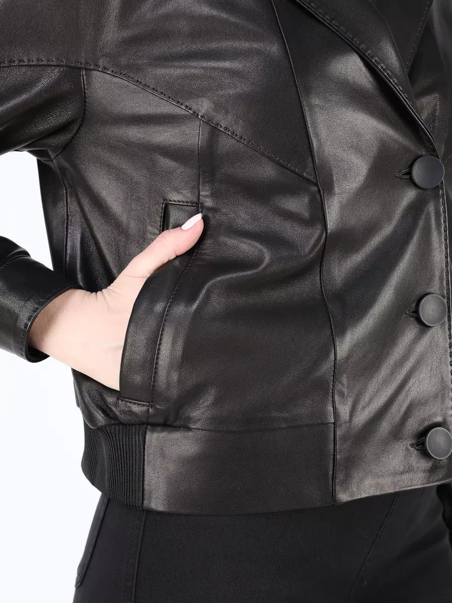 Каждая деталь этой кожаной куртки выполнена с особым вниманием к качеству материалов. Изысканный материал, декоротывные строчки, спущенная линия плеча, прорезные карманы, застежка на пуговицах и манжеты на кнопках добавляют акценты стиля и функциональности, делают эту короткую женскую куртку универсальным элементом гардероба, который подходит практически под любой стиль, деловой или повседневный. Классический - английский воротник и эластичный подол обеспечивает неповторимый вид, а манжеты на рукавах и строчки дополняют оригинальный стиль.