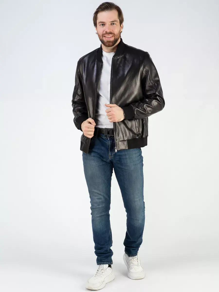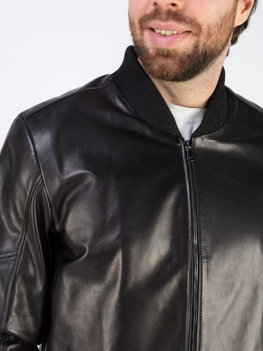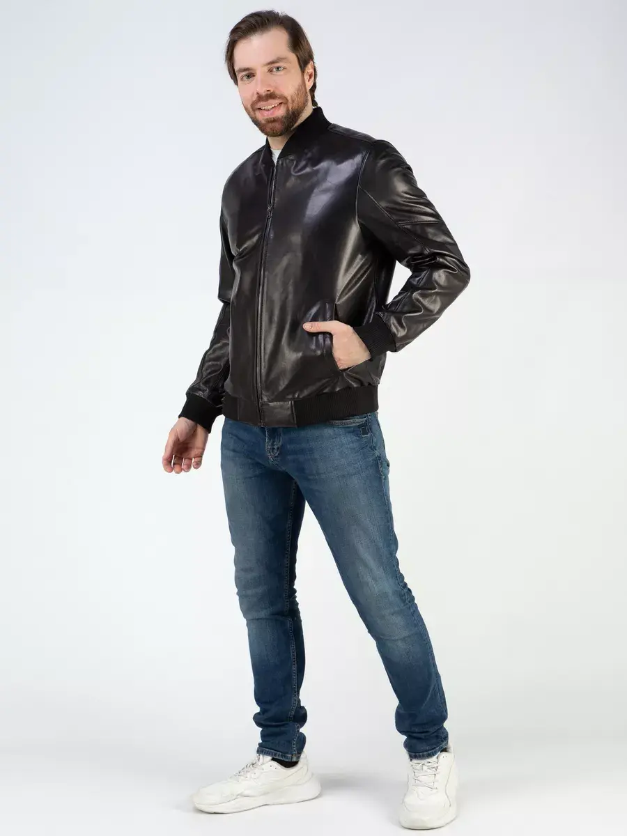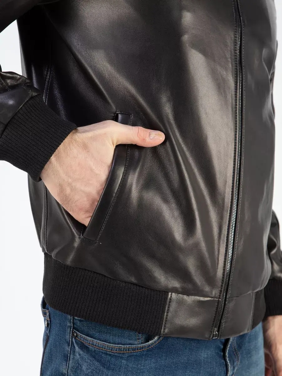 Стильная модель бомбер мужской куртки на резинке выполнена из мягкой натуральной кожи ягненка.