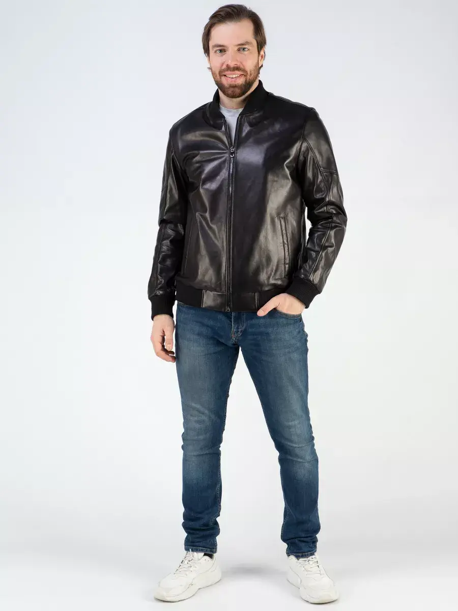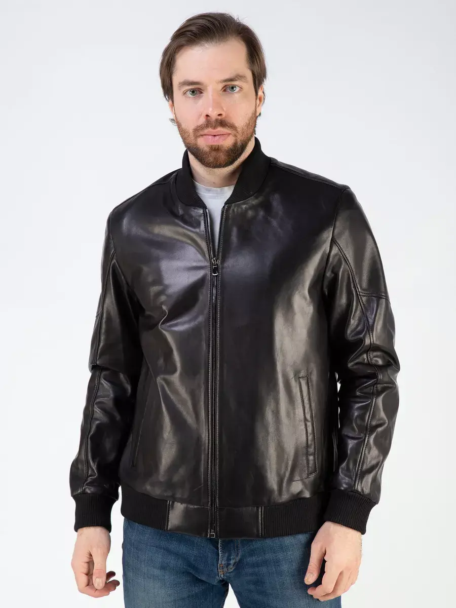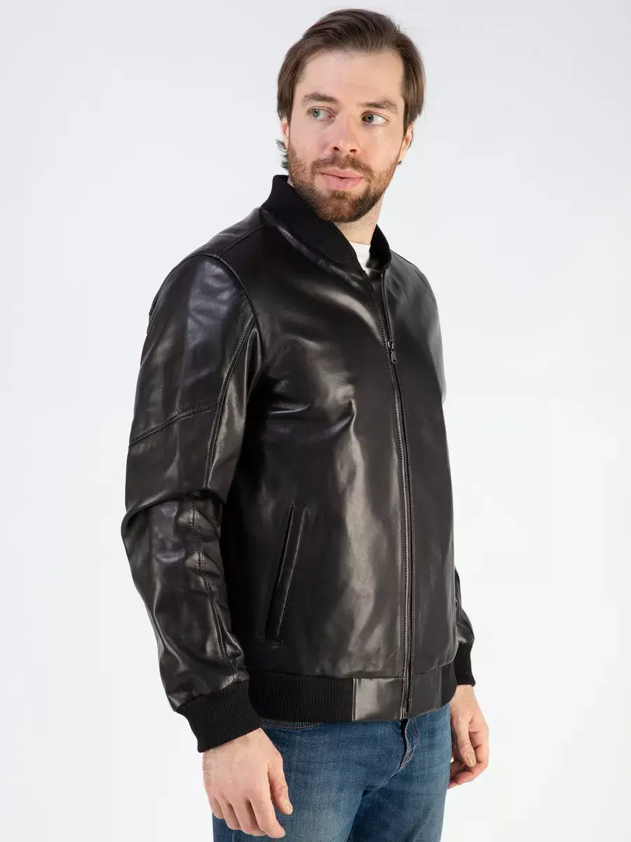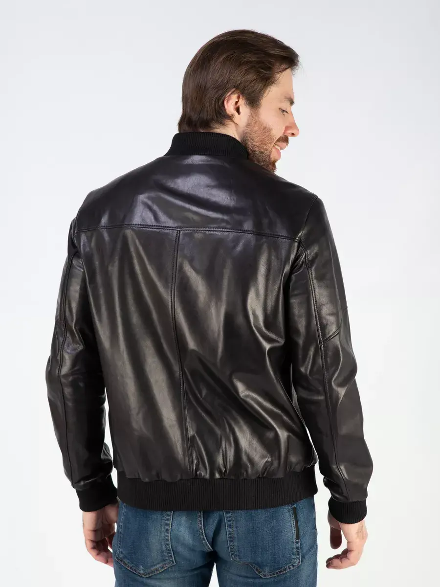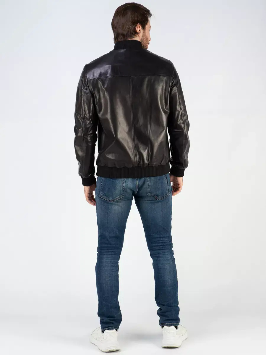 Стильная модель бомбер мужской куртки на резинке выполнена из мягкой натуральной кожи ягненка.