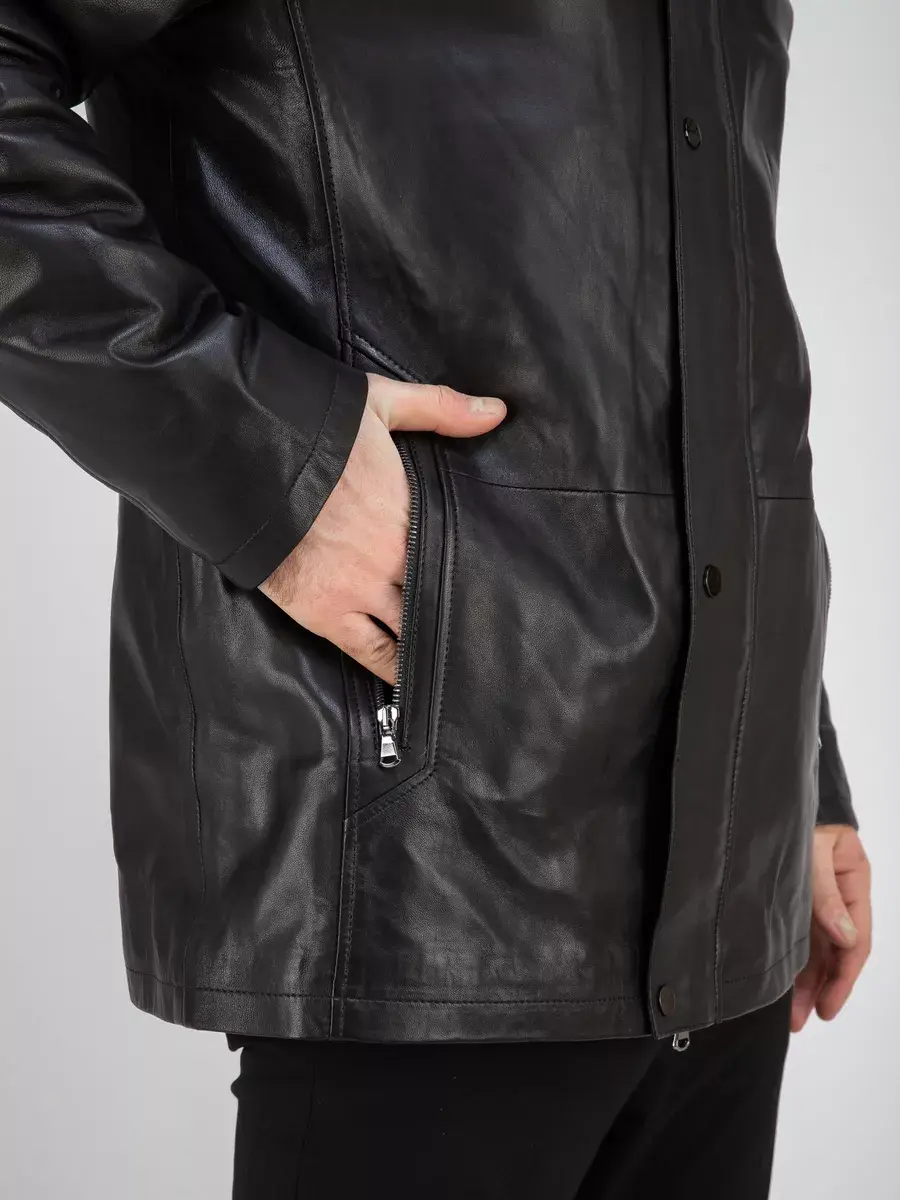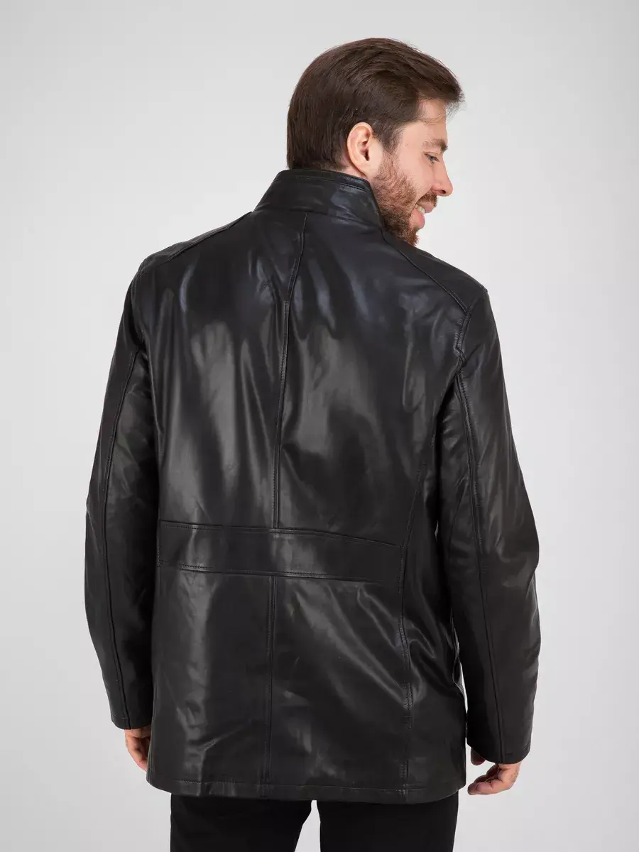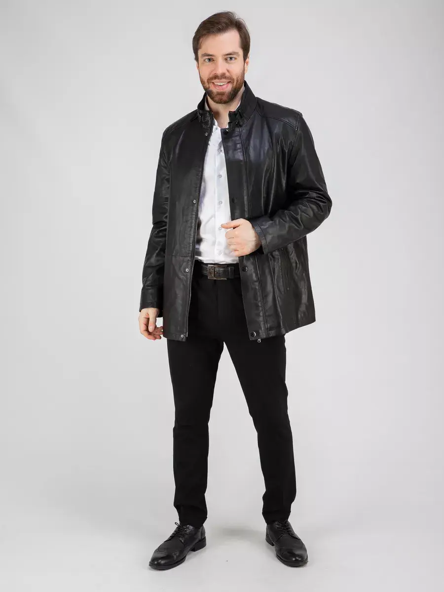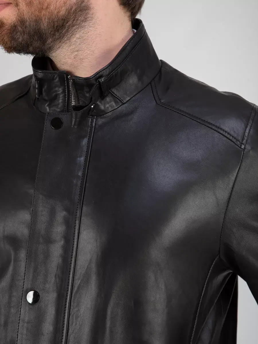 Куртка кожаная мужская имеет длину по спинке 80 см., что обеспечивает идеальное соотношение между длиной и защитой от холода, прекрасно подходить под классический стиль одежды, позволяет одевать ее поверх пиджака и рубашки, идеально впишется в деловой или повседневный стиль и дополнит солидный образ мужчины или парня подростка летом или осенью. Кожа в черном цвете и вставки придают куртке - пальто эксклюзивный и богатый вид. Эта модель лучше, чем любая джинсовая или текстильная куртка благодаря своей эксклюзивности и высокому качеству материала.