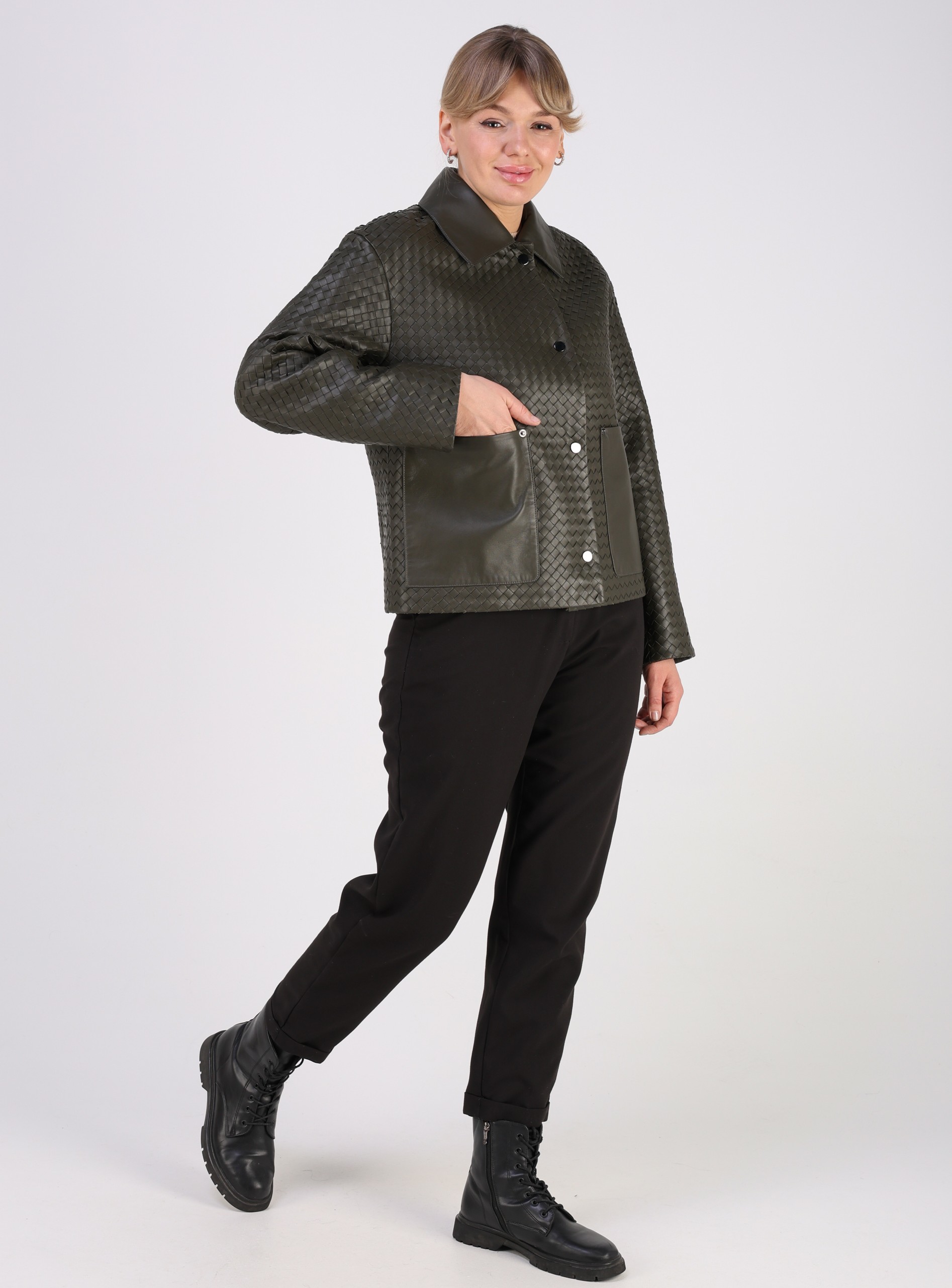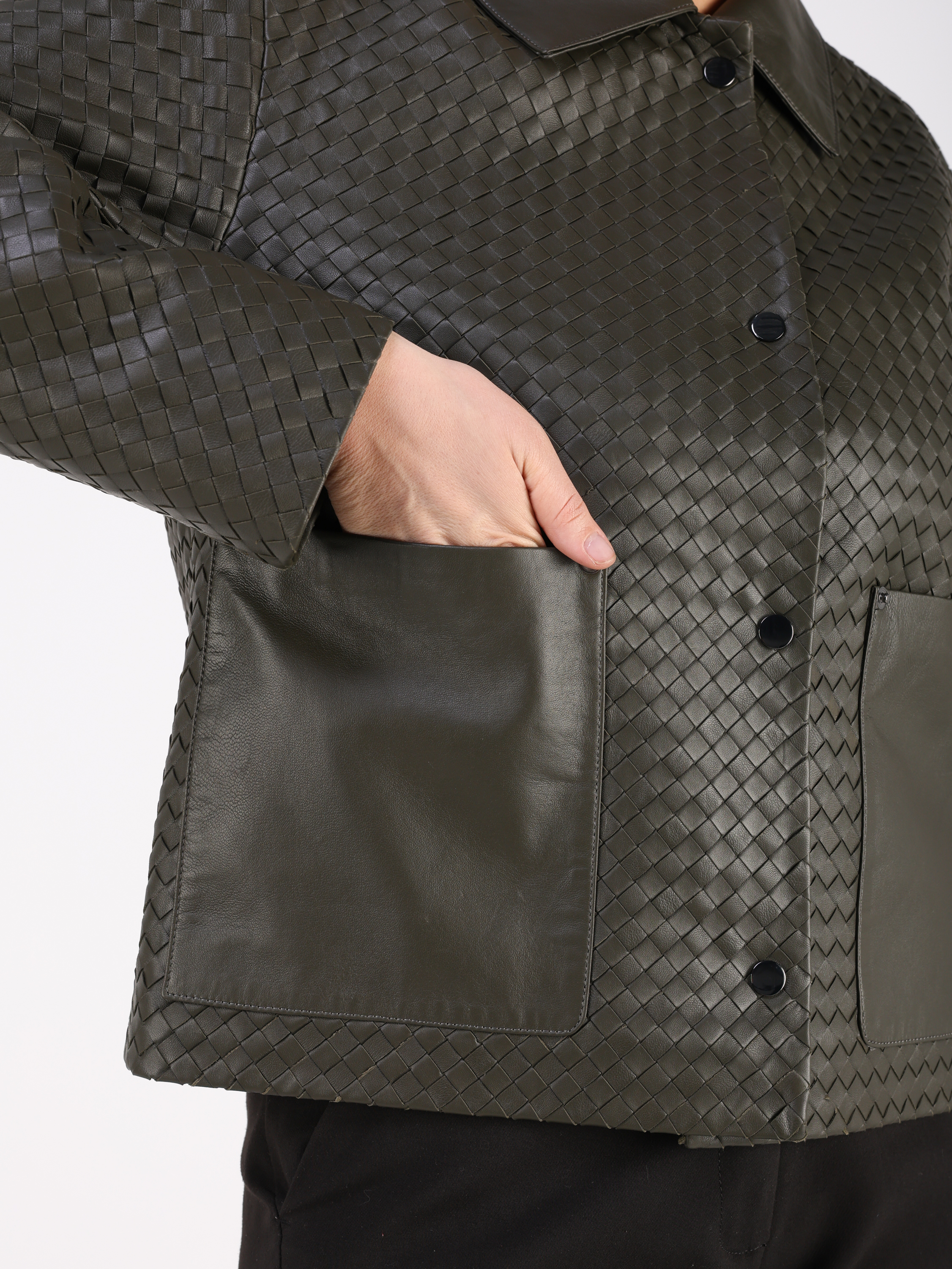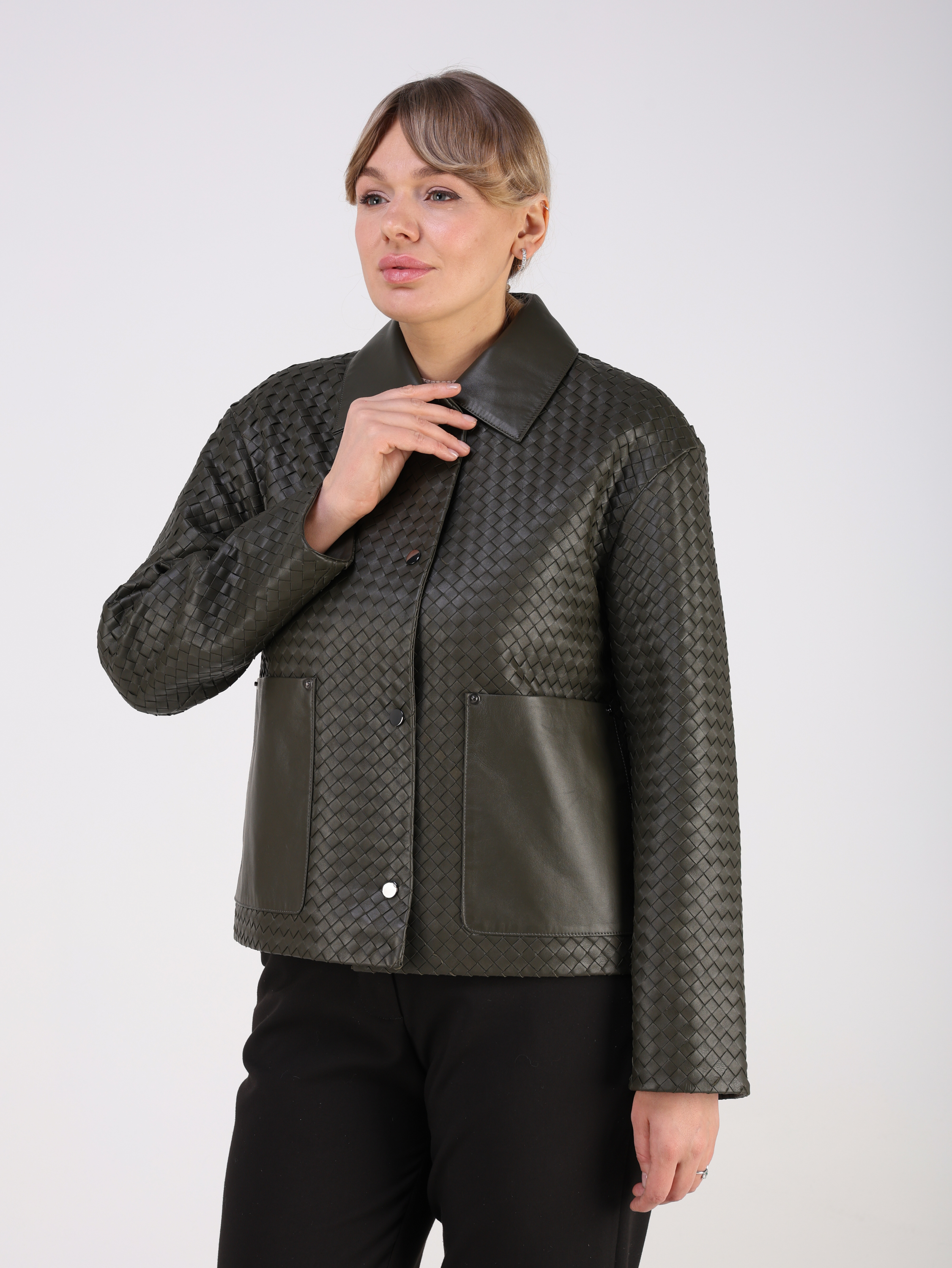 Куртка кожаная женская из натуральной кожи ягненка выделки "плонже". Модель прямого кроя выполнена в культовой технике плетения Intrecciato (интреччато) - техника плетения из тонких кожаных лент, создающая характерный ромбовый узор. Детали: застежка кнопки, две накладные карманы из гладкой кожи с декоративными вставками заклепками - хольнитены, отложной воротник.